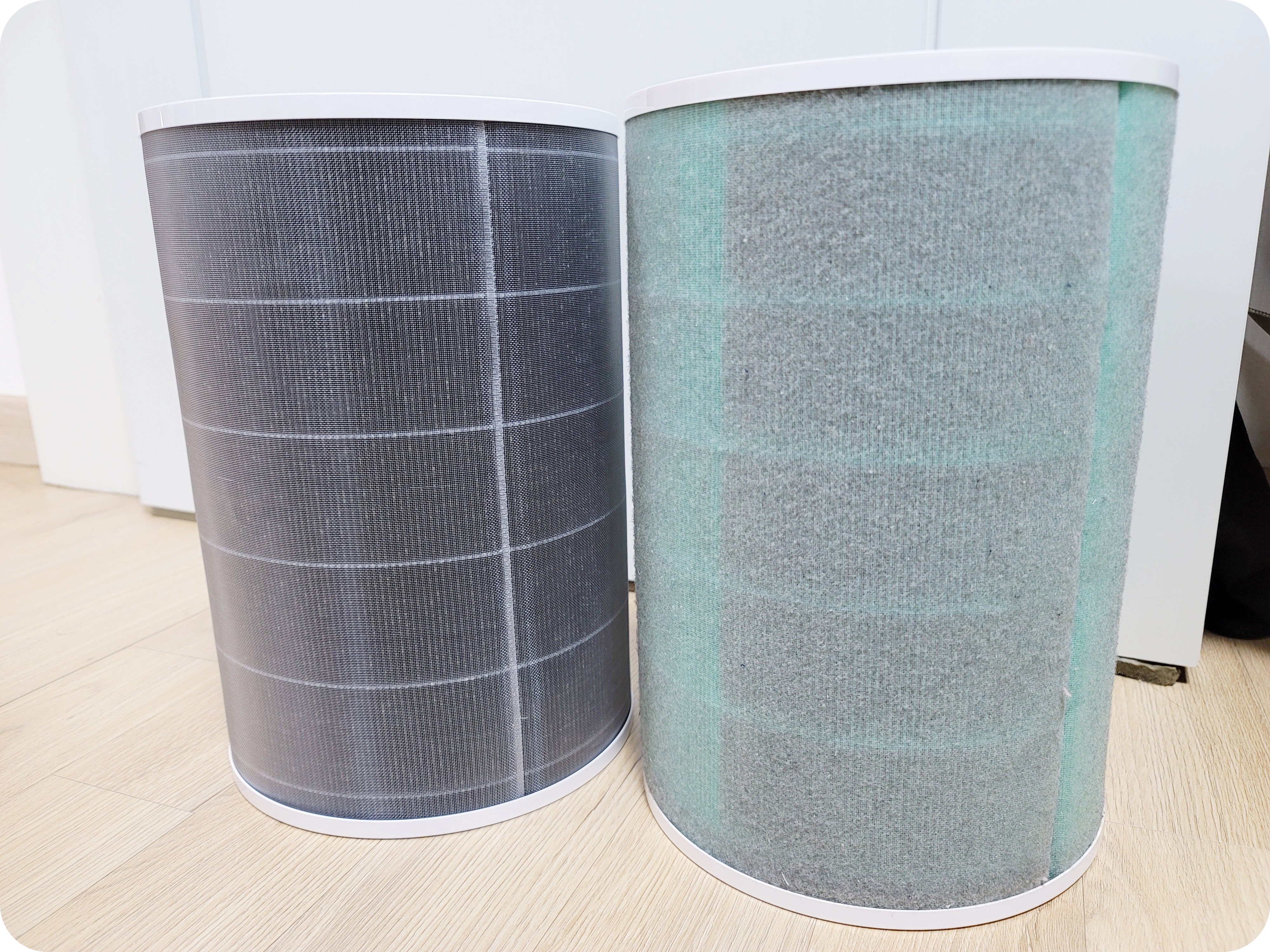 좌측은 새로운 필터 (회색 필터)이며 우측은 기존에 사용하던 그린 필터(녹색 필터)에요. 두 제품의 차이는 회색 필터는 H13(헤파)이고 그린 필터는 E12(세미헤파)등급에 활성탄이 좀 더 많아 포름알데히드 강력 제거 버전이에요.