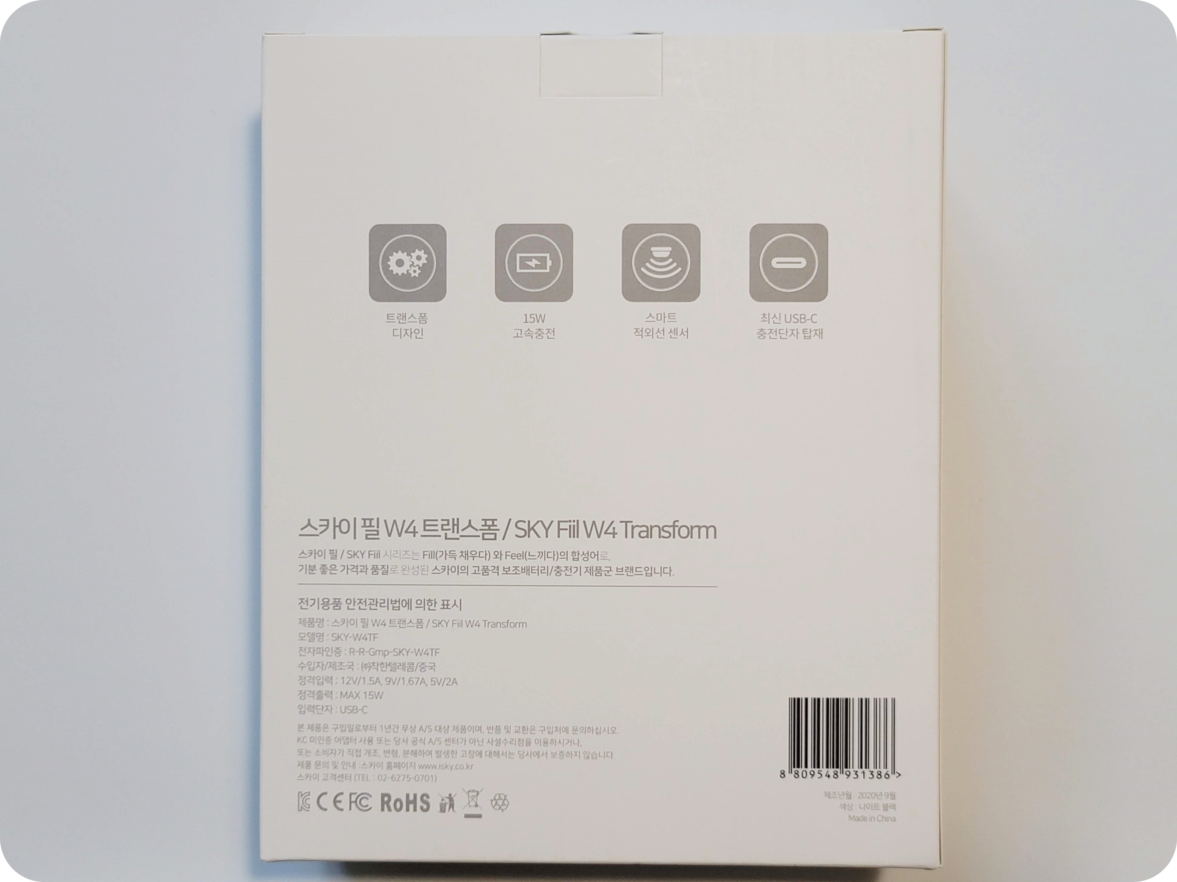 스카이 필 W4 트랜스폼은 깔끔한 흰색 상자에 들어있어요. 제품 전면에는 제품의 이름이 보이고요. 후면에는 제품의 특징이 나와있네요. 트랜스폼 디자인, 15W 무선충전, 스마트 적외선 센서, USB-C포트가 이 제품의 특징인가 봐요.