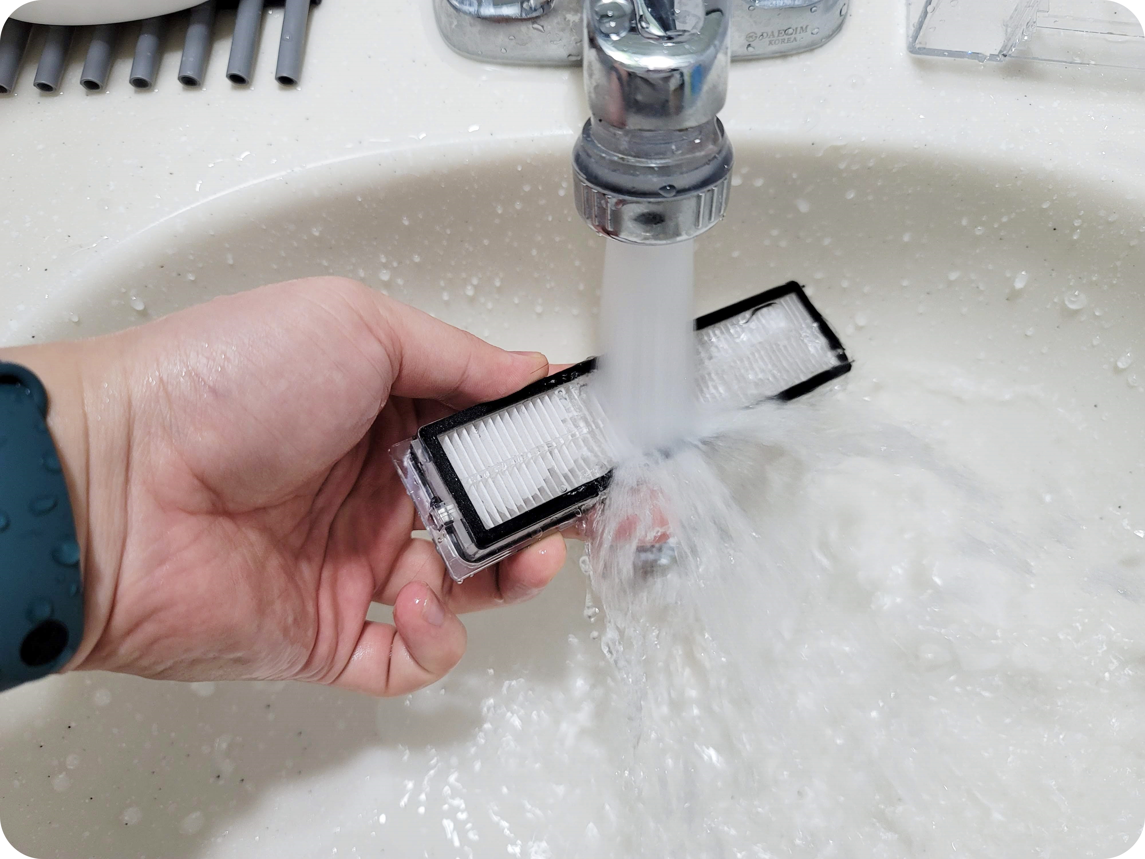 먼지통뿐 아니라 필터도 물로 씻을 수 있는 워셔블 필터라 필터에 있는 먼지들도 가볍게 물로 씻어주면 됩니다. 단 주의해야 할 부분은 필터는 물로 세척 시 성능이 저하될 수 있고 물기가 남아있는 상태로 청소기를 돌리면 고장의 원인이 될 수 있으니 꼭 물세척을 한 다음에는 완전히 말린 뒤 사용을 해주세요.
