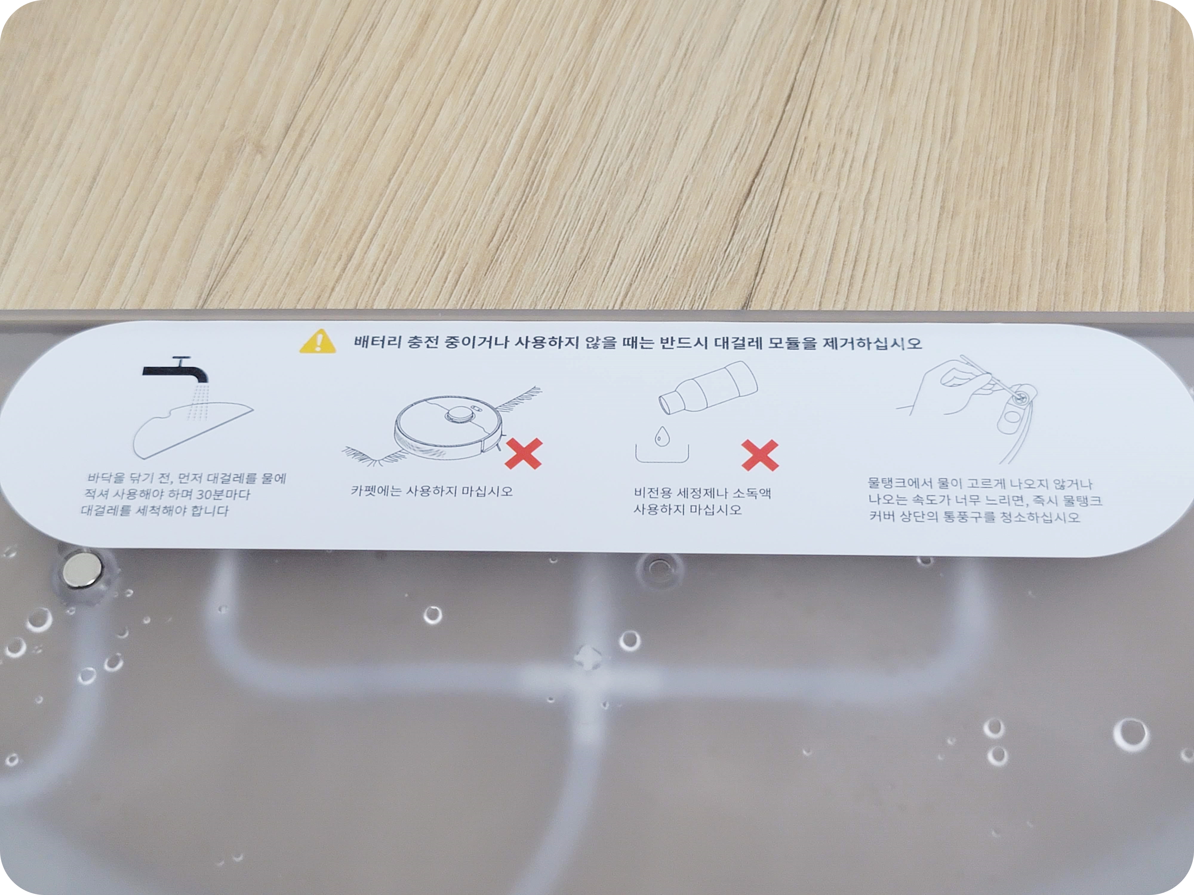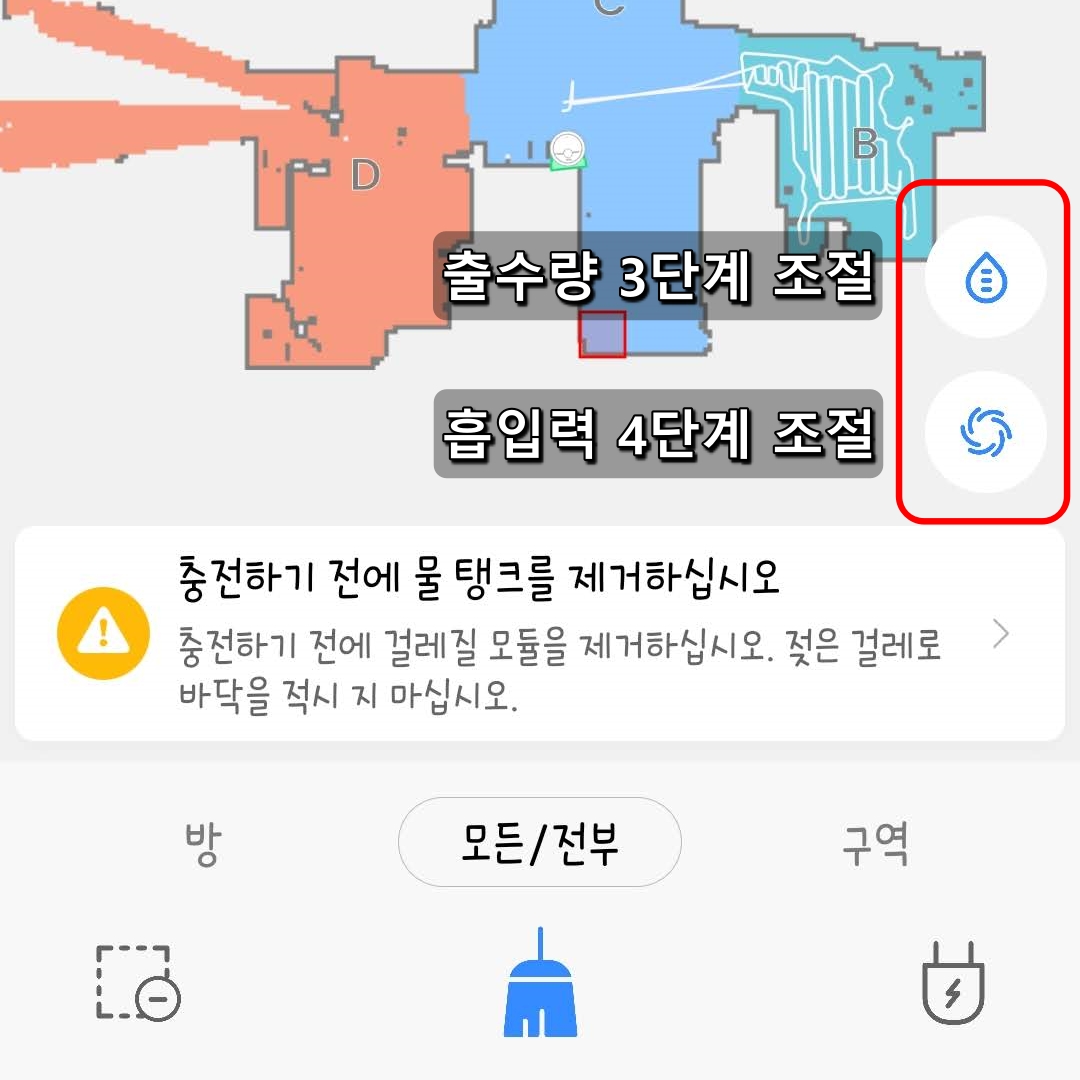 한 가지 아쉬운 점은 물걸레 판을 장착하고 출수량을 아예 끌 수는 없으며, 흡입력도 아예 꺼서 물걸레만 사용하는 모드는 따로 없었습니다. 물걸레 청소만 하고 싶다면 흡입력을 최소로 해야 소음걱정이 없었어요.