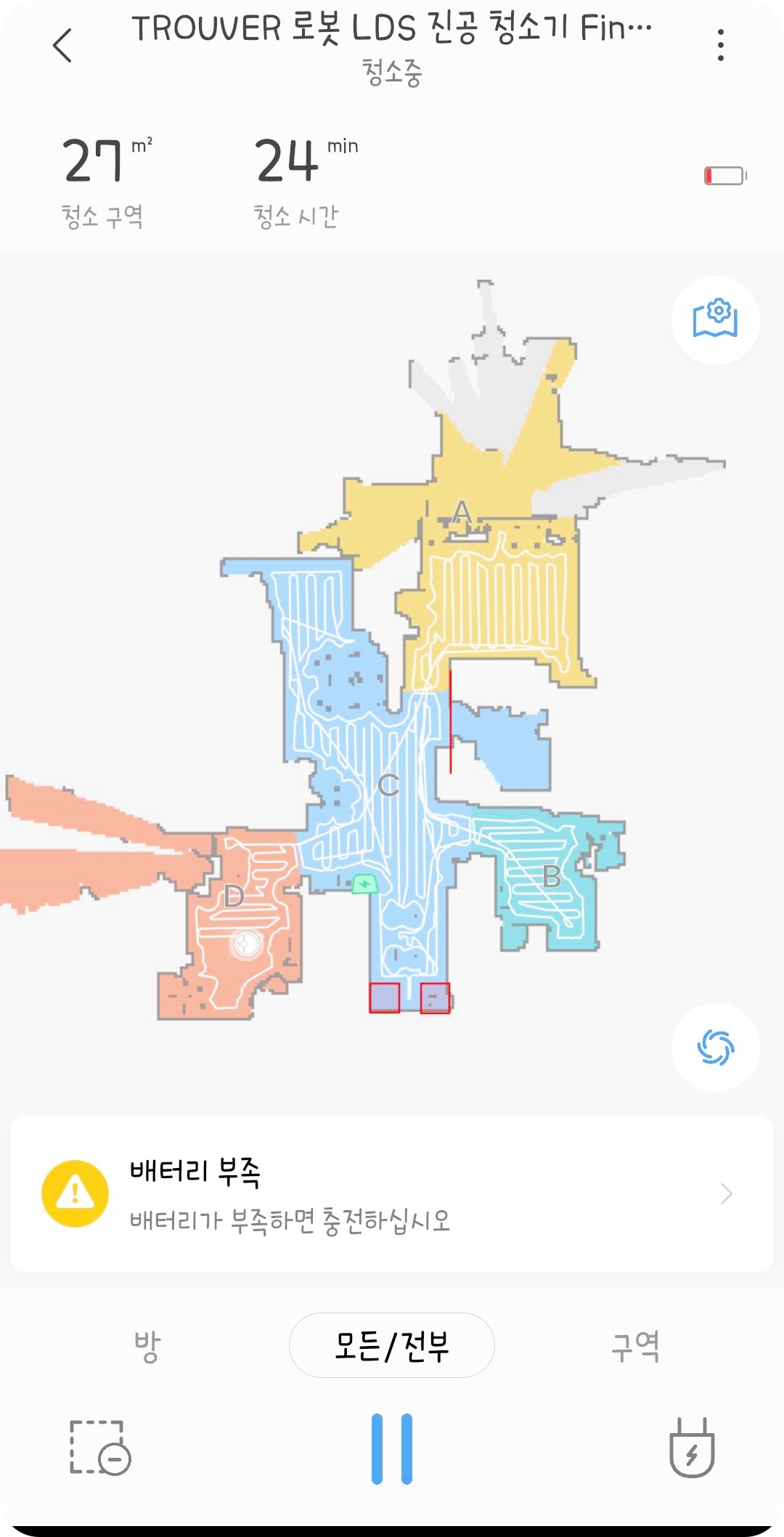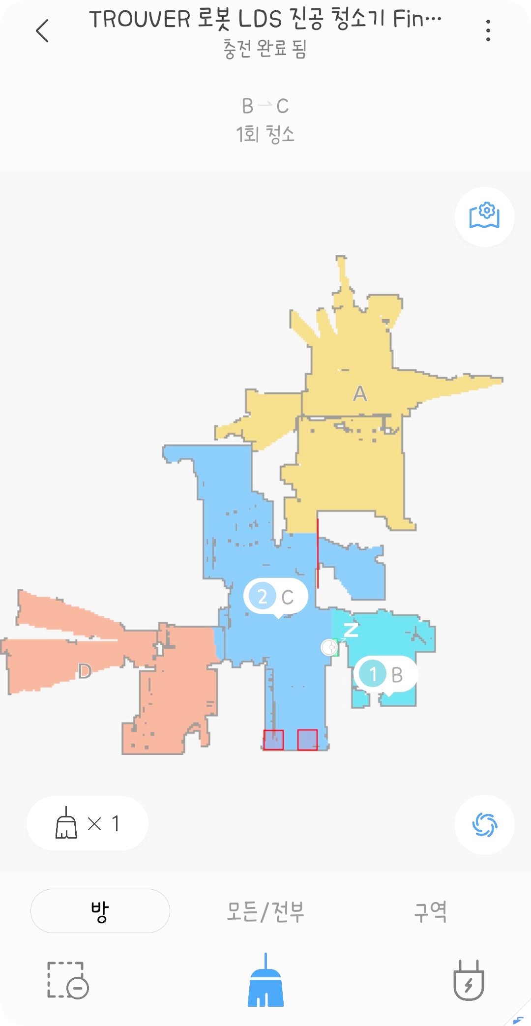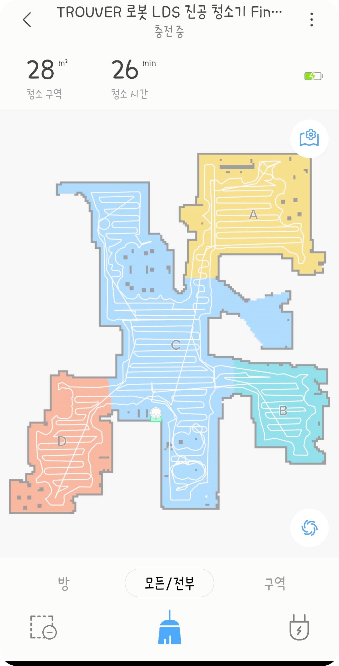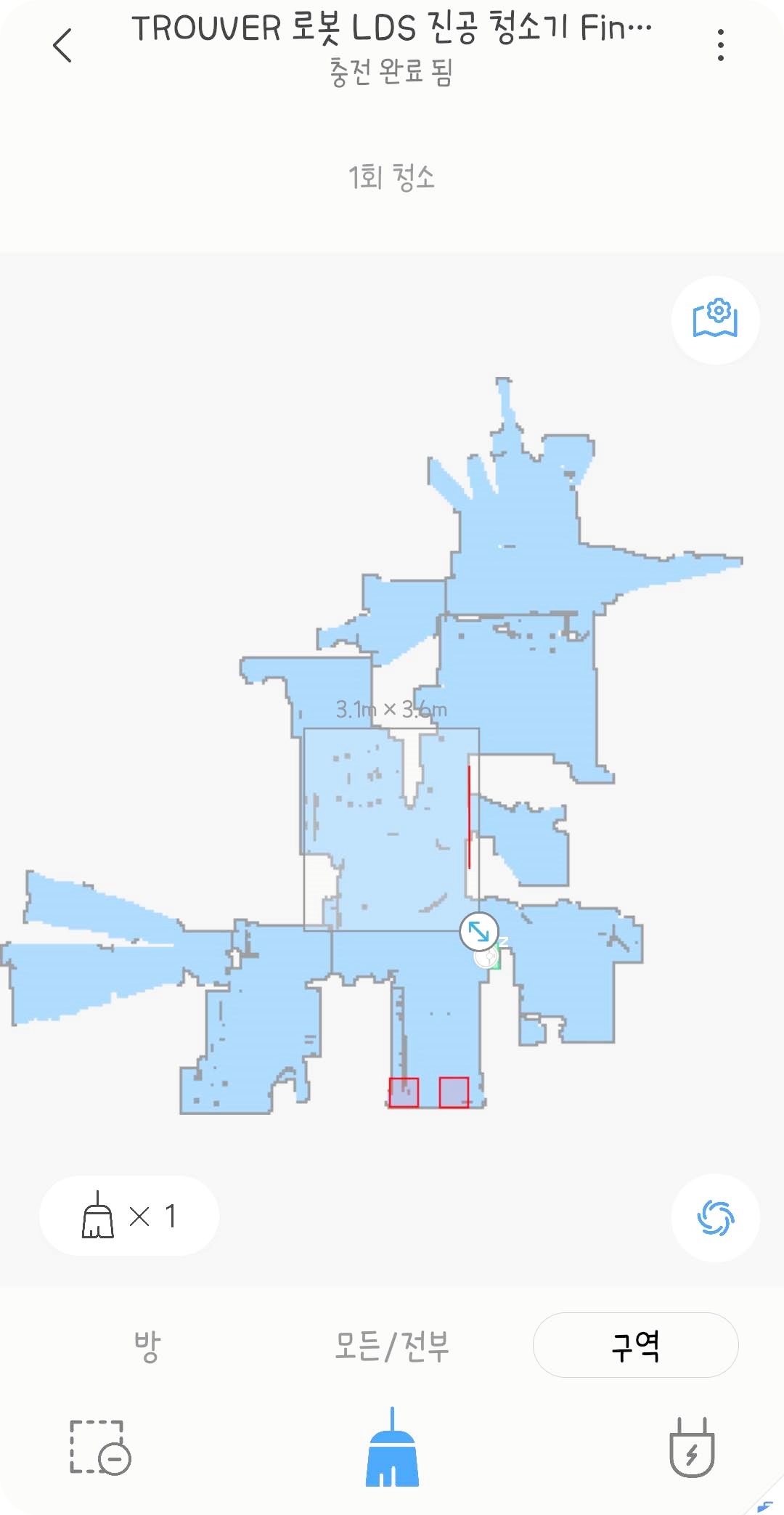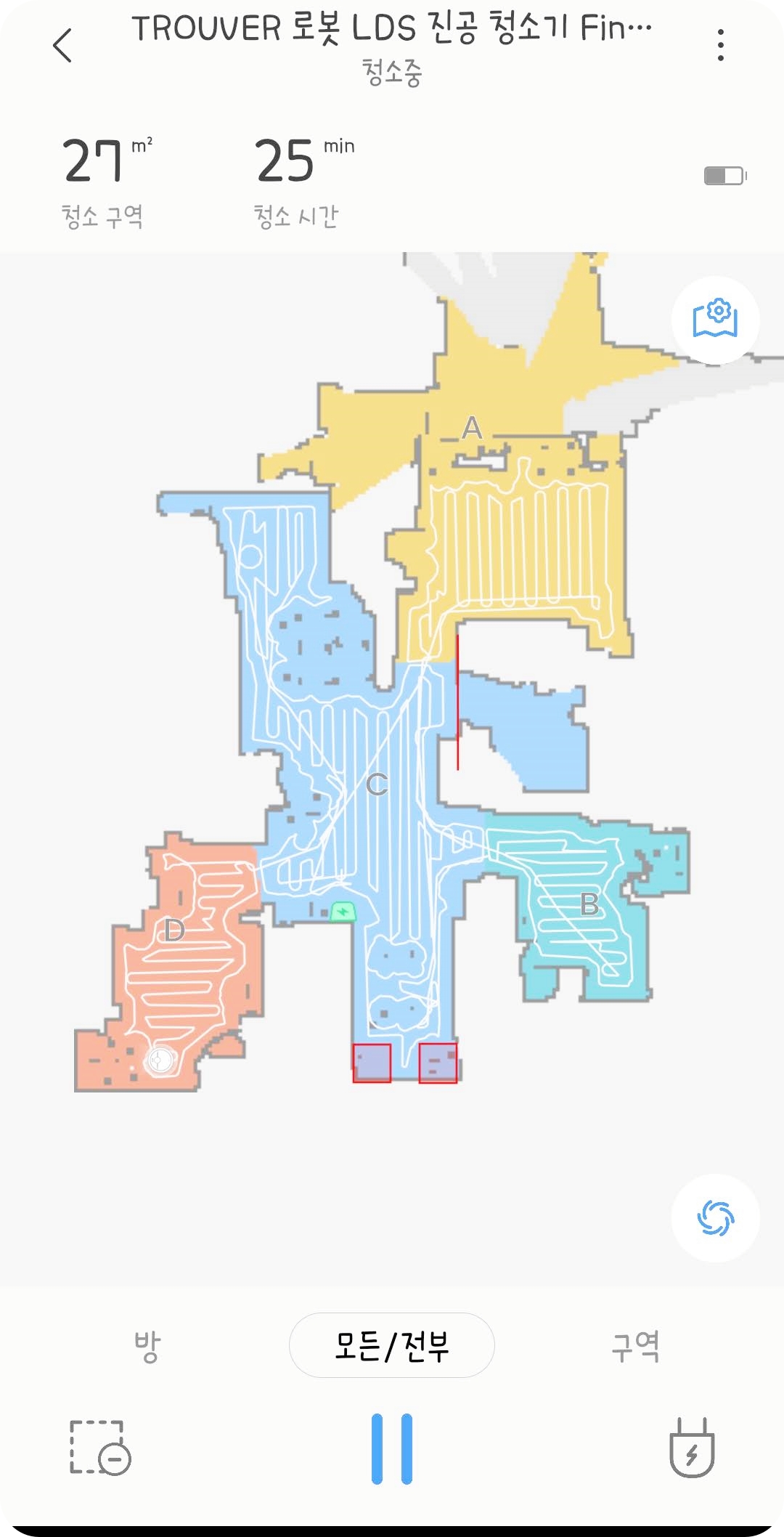 어플에 연동에 성공하면 먼저 집을 모든/전부 모드로 청소를 시켜 맵을 그려줍니다. 집의 모든 청소가 끝나고 나면 알아서 방 구분이 되며 맵이 저장이 됩니다. 만약 청소 도중 멈추거나 청소기의 위치를 옮기면 제대로 된 맵이 그려지지 않으니 꼭 처음에는 끝까지 청소를 시켜주세요.