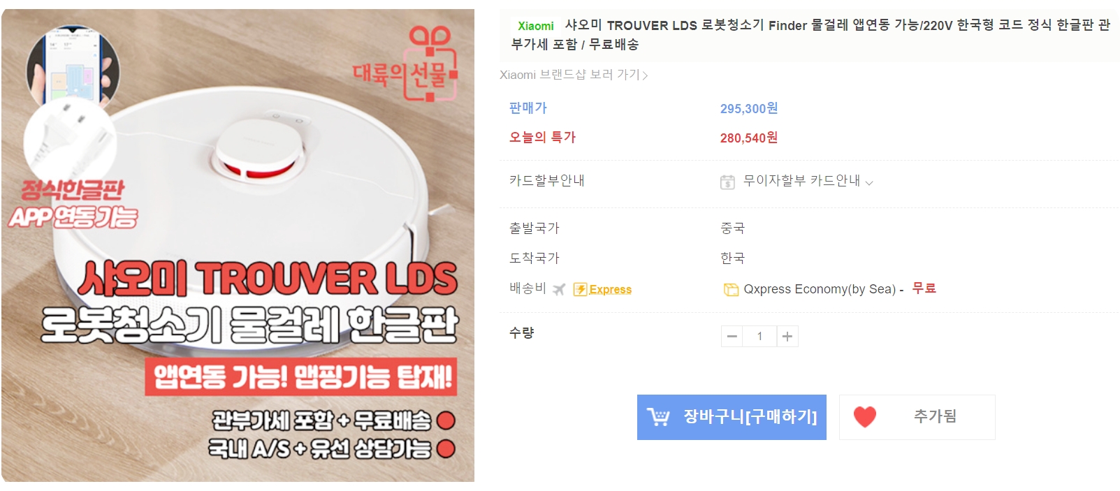 [280,540원](▼5%)[Xiaomi]샤오미 TROUVER LDS 로봇청소기 Finder 물걸레 앱연동 가능/220V 한국형 코드 정식