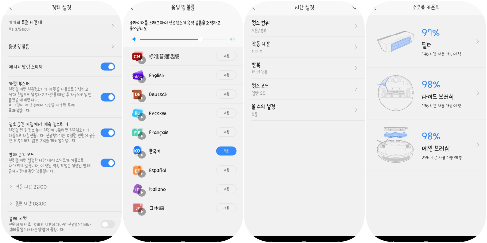 그 외의 설정 등에는 방해금지 모드/ 언어 및 볼륨/ 예약 설정 등이 가능하며 소모품의 사용량도 간편하게 확인이 가능합니다. Trouver 제품은 해외에서 판매전략을 세운 것인지 정말로 다양한 언어를 지원해주더라고요. 녹음된 음성은 살짝 노이즈가 있기는 했지만 크게 거슬리는 편은 아니었어요.
