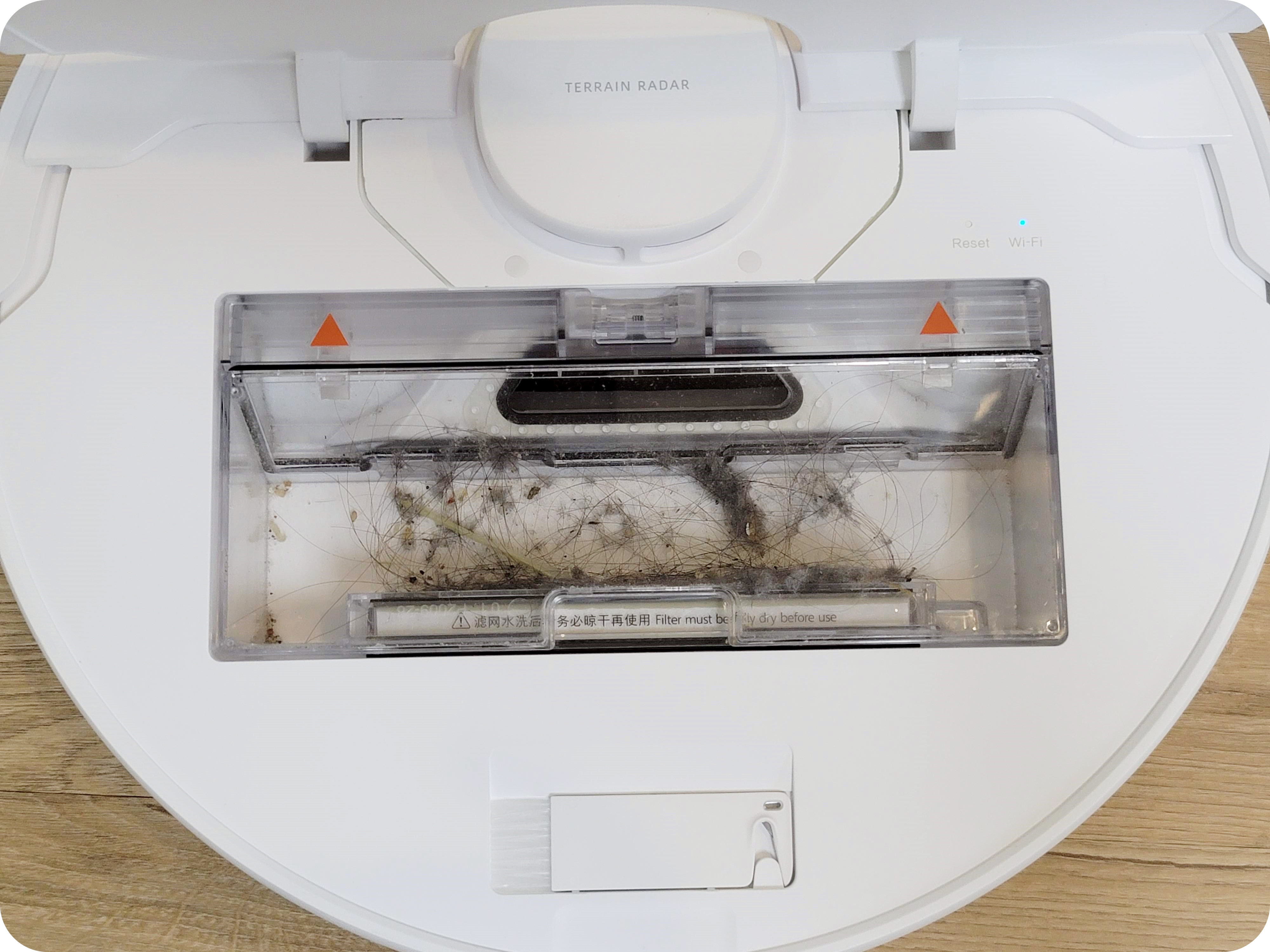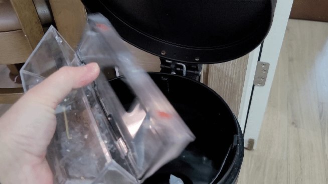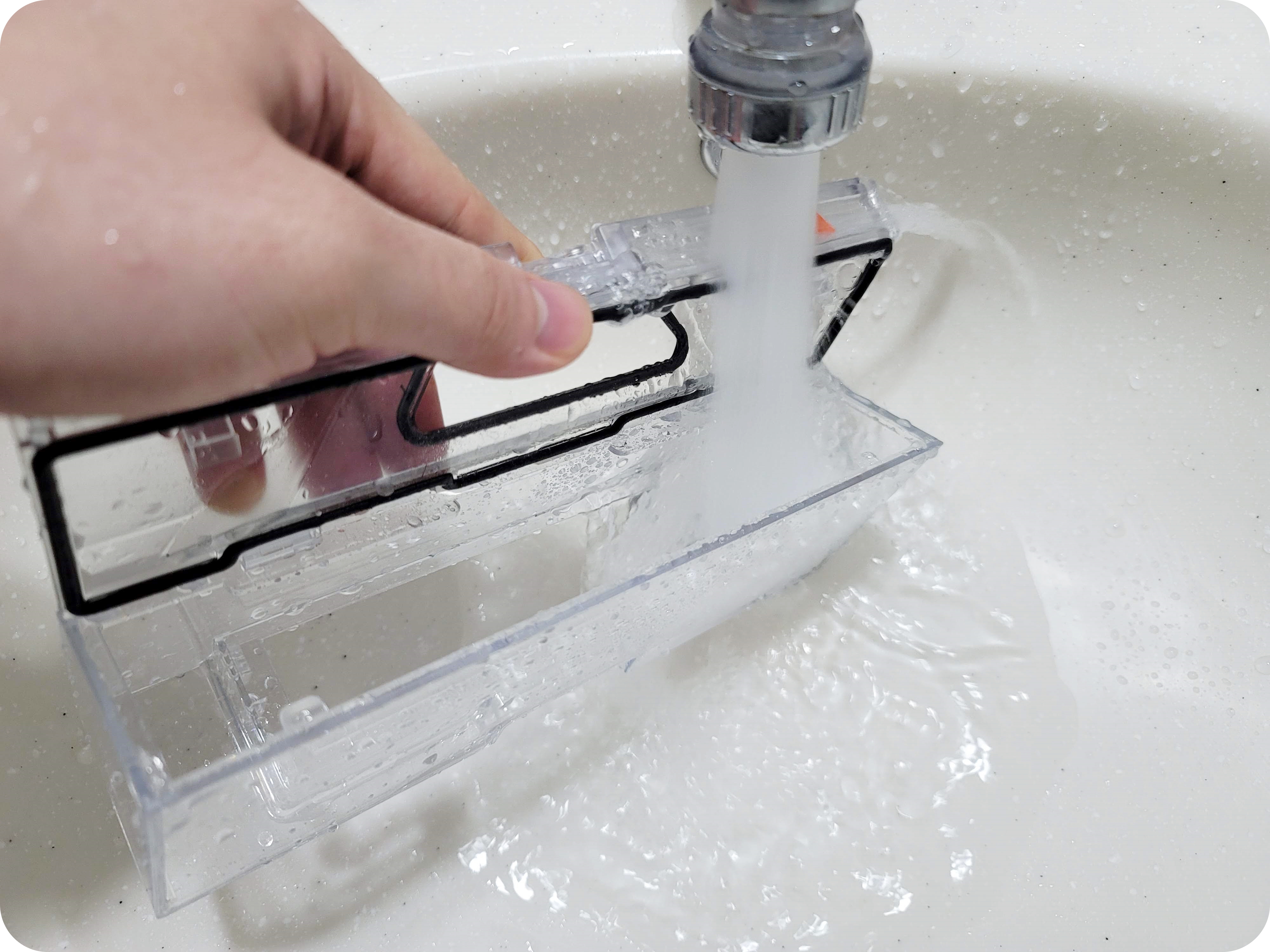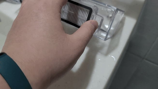 먼지통은 가볍게 엄지와 검지로 잡아 올리면 빠지며 먼지통 안의 먼지도 쉽게 비울 수 있어요. 이렇게 비우고 난 먼지통은 물로 가볍게 씻어주면 훨씬 깔끔하게 관리할 수 있는데요.