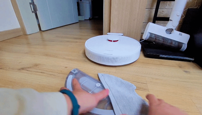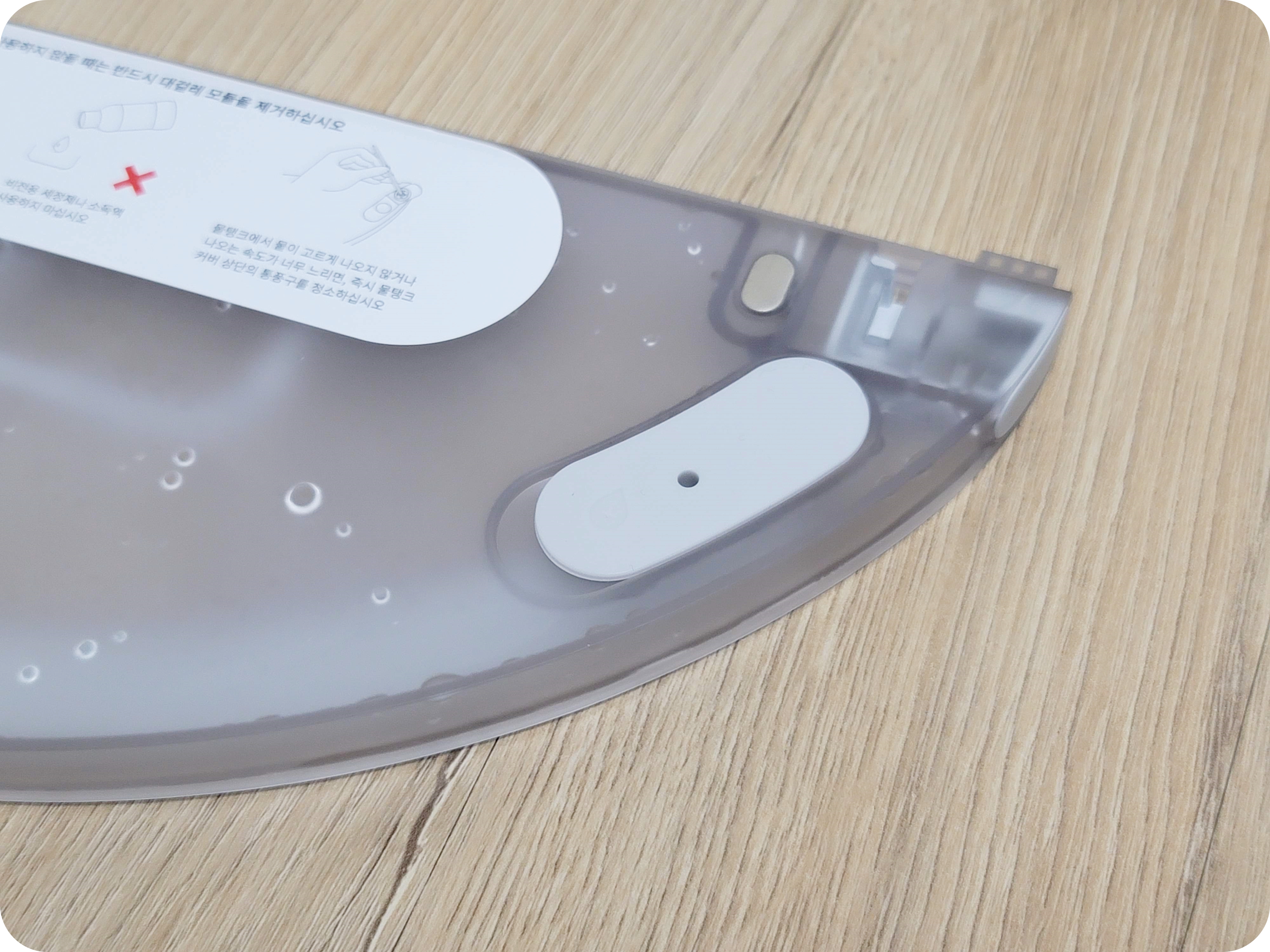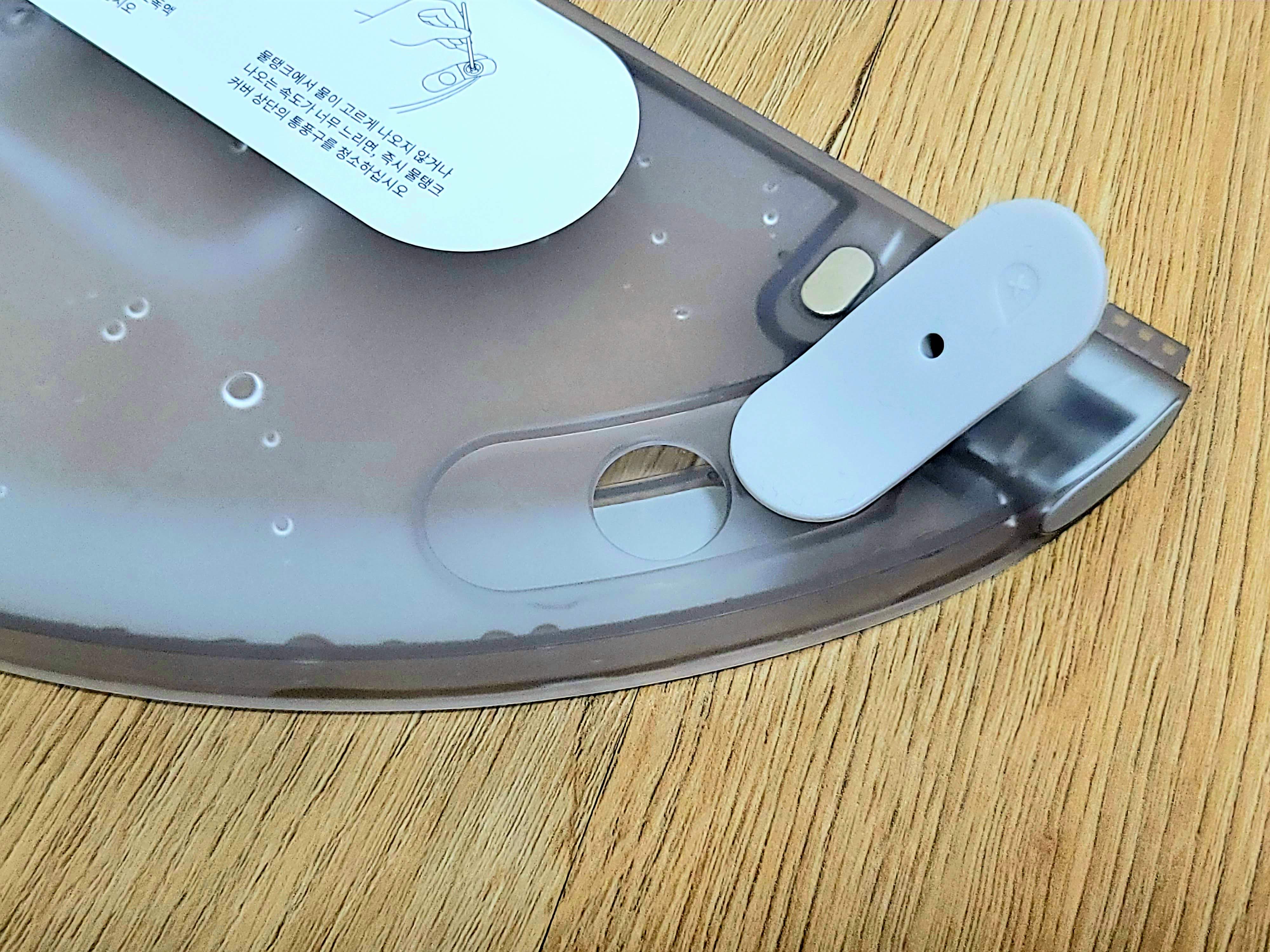 걸레판 장착은 간편한 편이에요. 하지만 보급형인 탓인지 완전히 매끄럽게는 장착되지 않았어요. 실제 제품은 그렇지 않다고는 하나 참고해주세요.