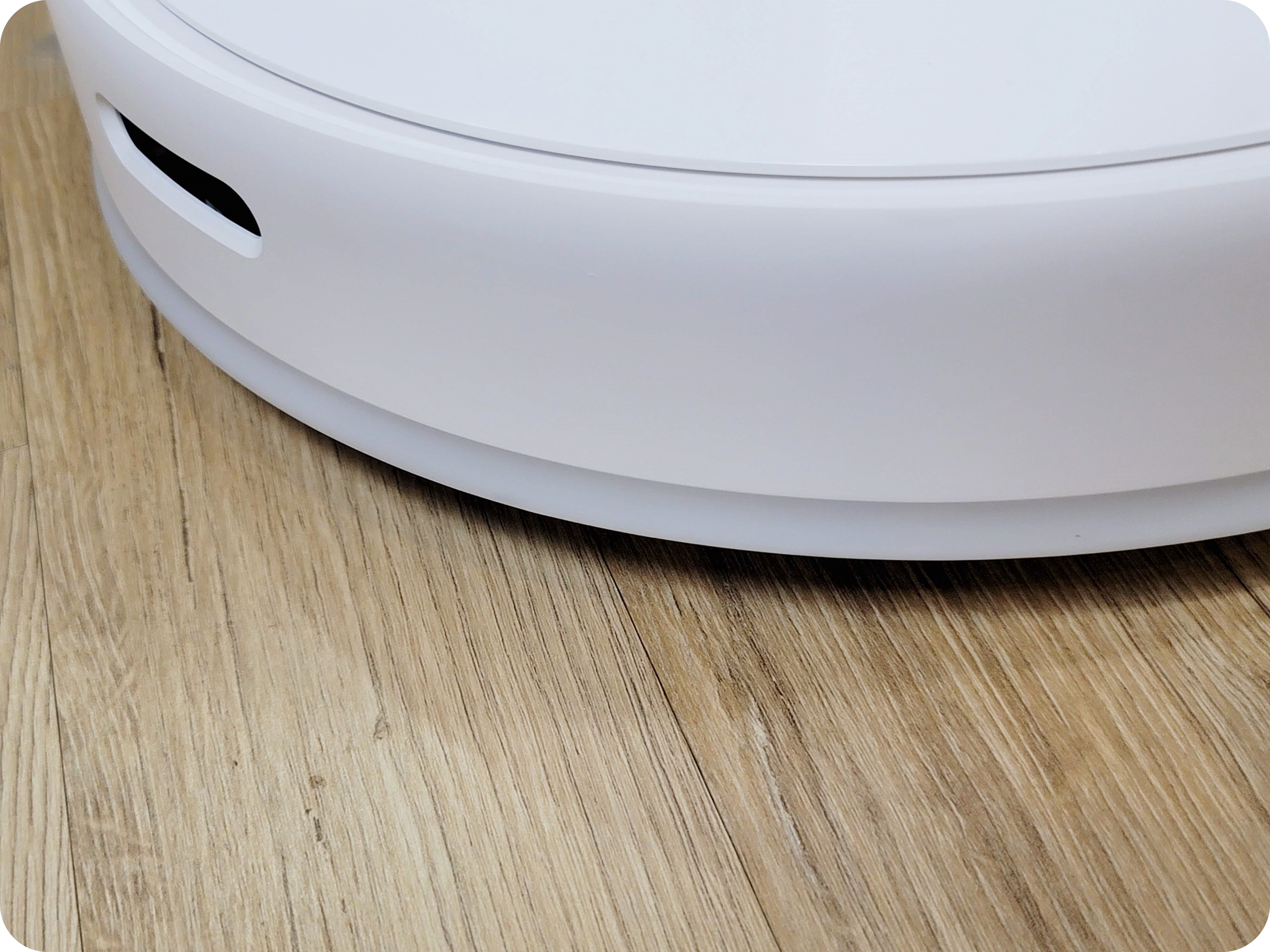 범퍼 쪽 디자인도 둥글둥글하게 되어있어 귀여운 이미지를 보여주죠. 범퍼 아래에 있는 고무로 된 커버가 보이시나요? 로봇청소기가 다니면서 부딪힐 때 흠집이 생기는 것을 방지해주는 역할을 해요. 기본적으로 이런 범퍼가드가 있는 것은 처음에 쓰기에 좋은 것 같아요.