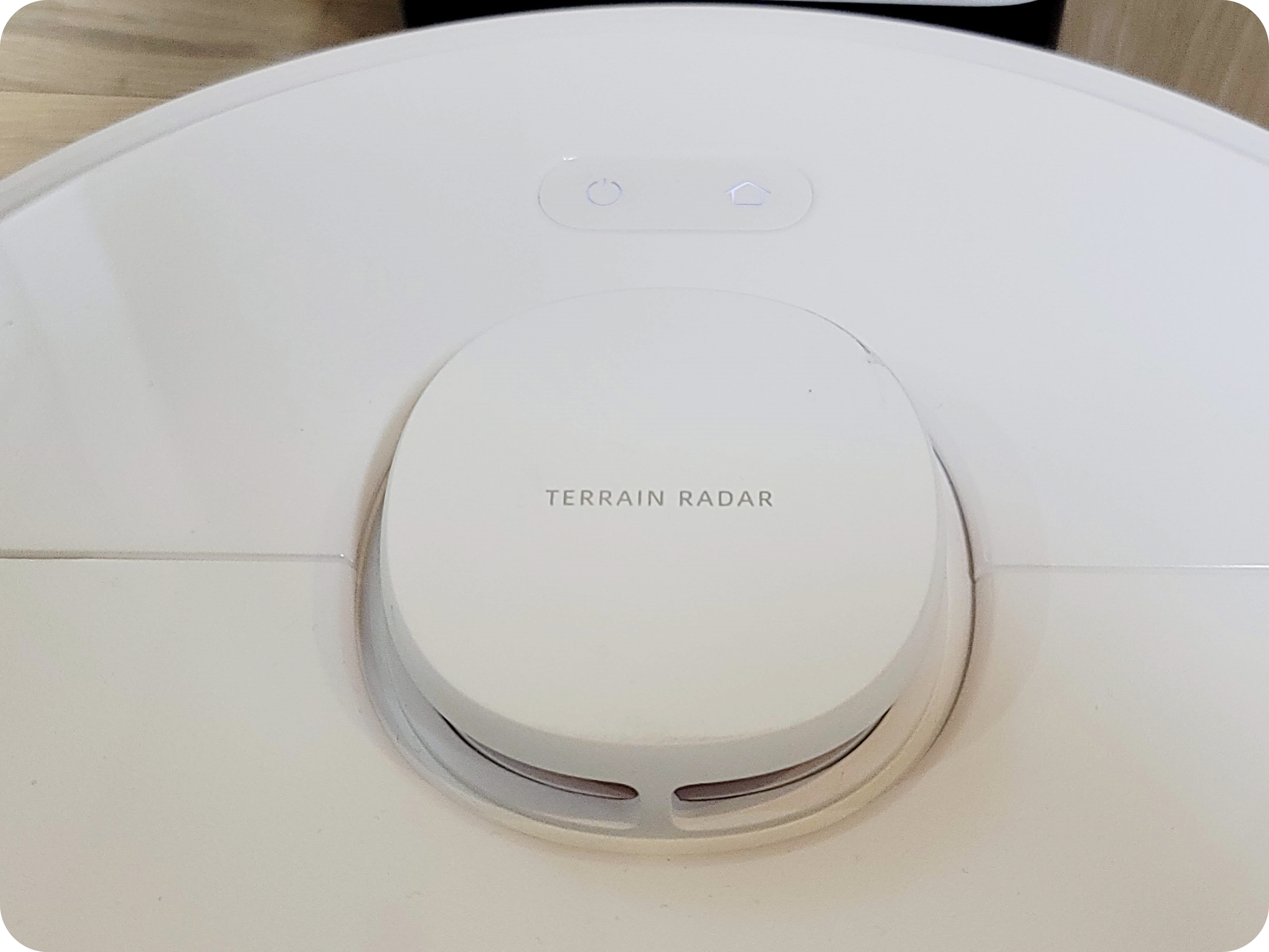 Finder 로봇청소기는 전체적으로 깔끔한 화이트 톤으로 되어있어요. 제품의 커버 윗면 재질은 반짝반짝한 유광의 플라스틱 재질로 되어있어 고급스러운 느낌도 주는데요. 그 위에는 LDS센서가 자리를 잡고 있어요.