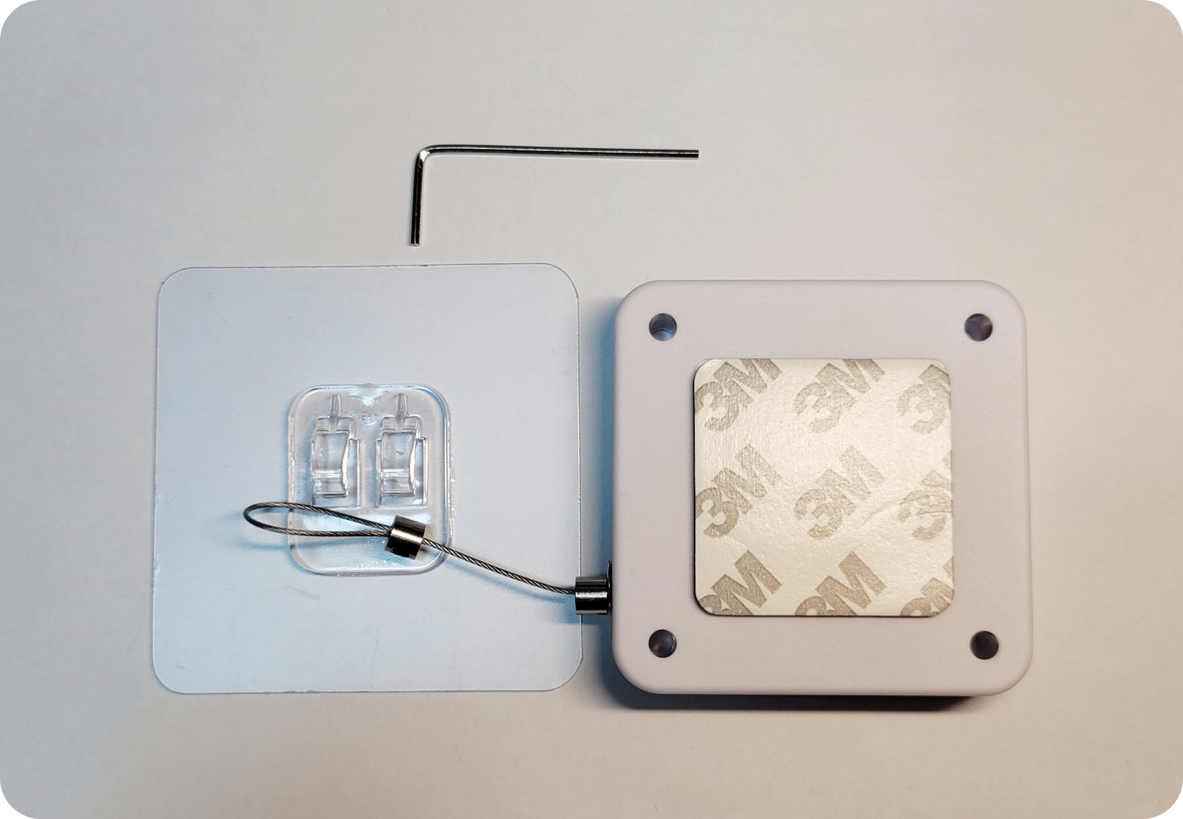 구성품은 아주 간단한데요. 본품, 접착 고리, 육각렌치로 되어있어요. 문 반대편에 접착 고리를 붙여서 와이어가 그 고리 쪽으로 당겨지도록 되는 구조입니다.