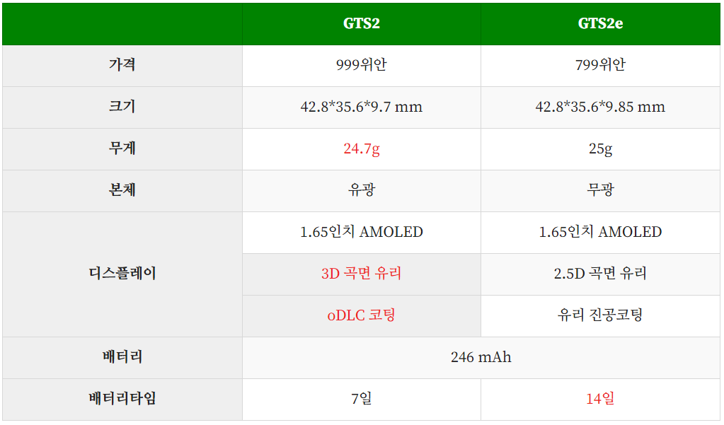 GTS2와 GTS2e의 차이도 액정 코팅, 곡면, 스트랩 등의 차이와 블루투스 통화, 음악 저장 기능의 차이가 있다고 보면 됩니다. GTR2와 GTR2e의 차이와 거의 같으니 GTS2e는 외형적인 비교만 하도록 하겠습니다.