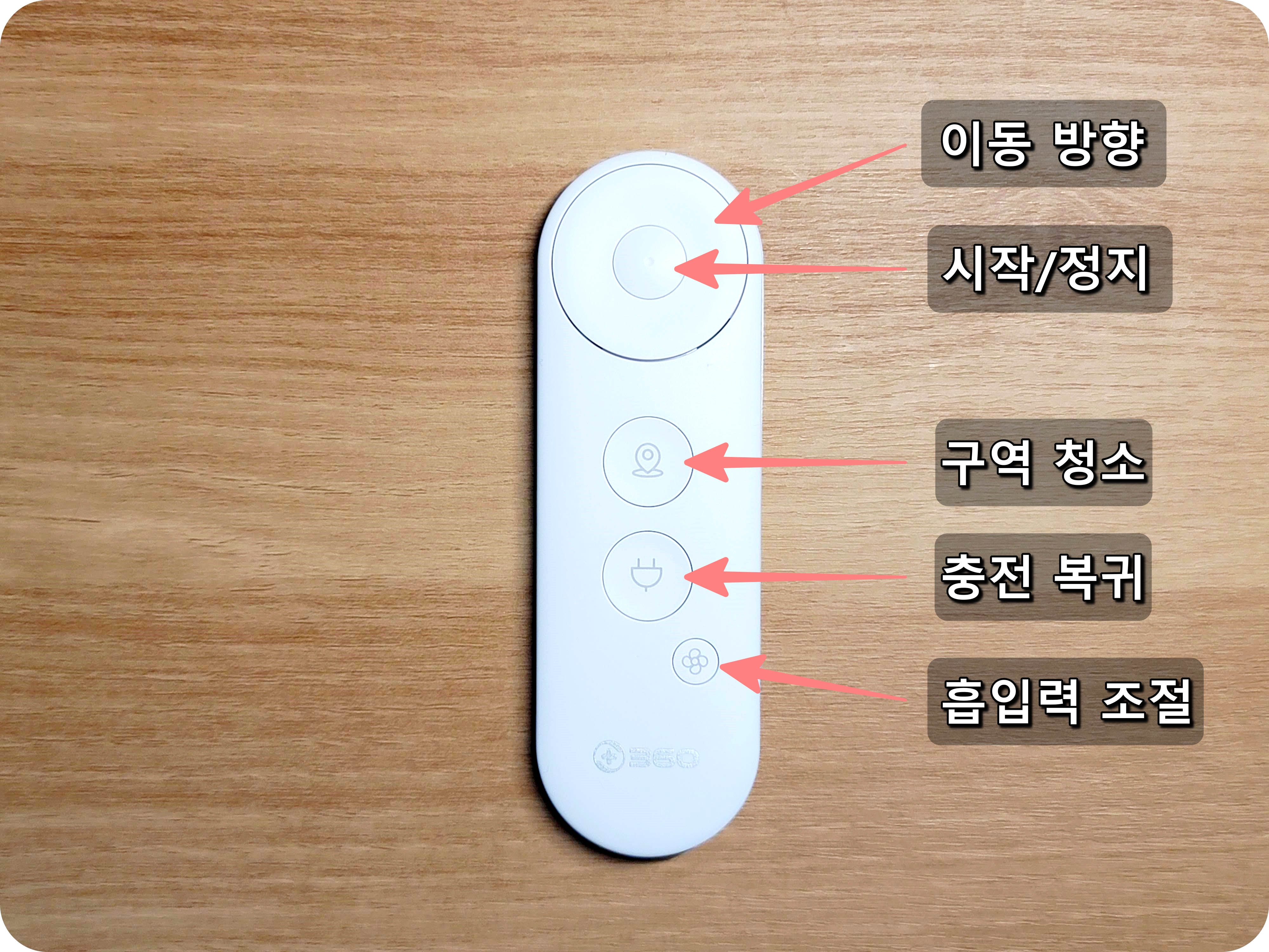 리모컨을 사용하면서 아쉬웠던 부분은 흡입력 조절 시 상태를 알 수 없다는 부분과 방향 버튼으로 이동시 버튼을 떼면 흡입이 중단되는 것이었어요. 예를 들어 직진을 시키다가 좌회전을 하려고 버튼에 손을 떼면 흡입이 멈추고 다시 흡입력을 끌어올리기까지 시간이 걸리게 되는데요. 스마트폰으로 조작 시는 계속 흡입을 유지하는데 리모컨으로 조작 시는 흡입을 했다가 멈췄다가 하는 것이 다소 아쉬웠습니다.