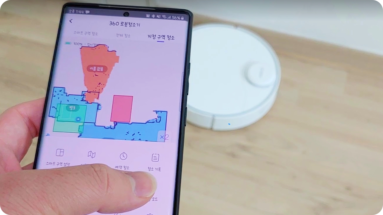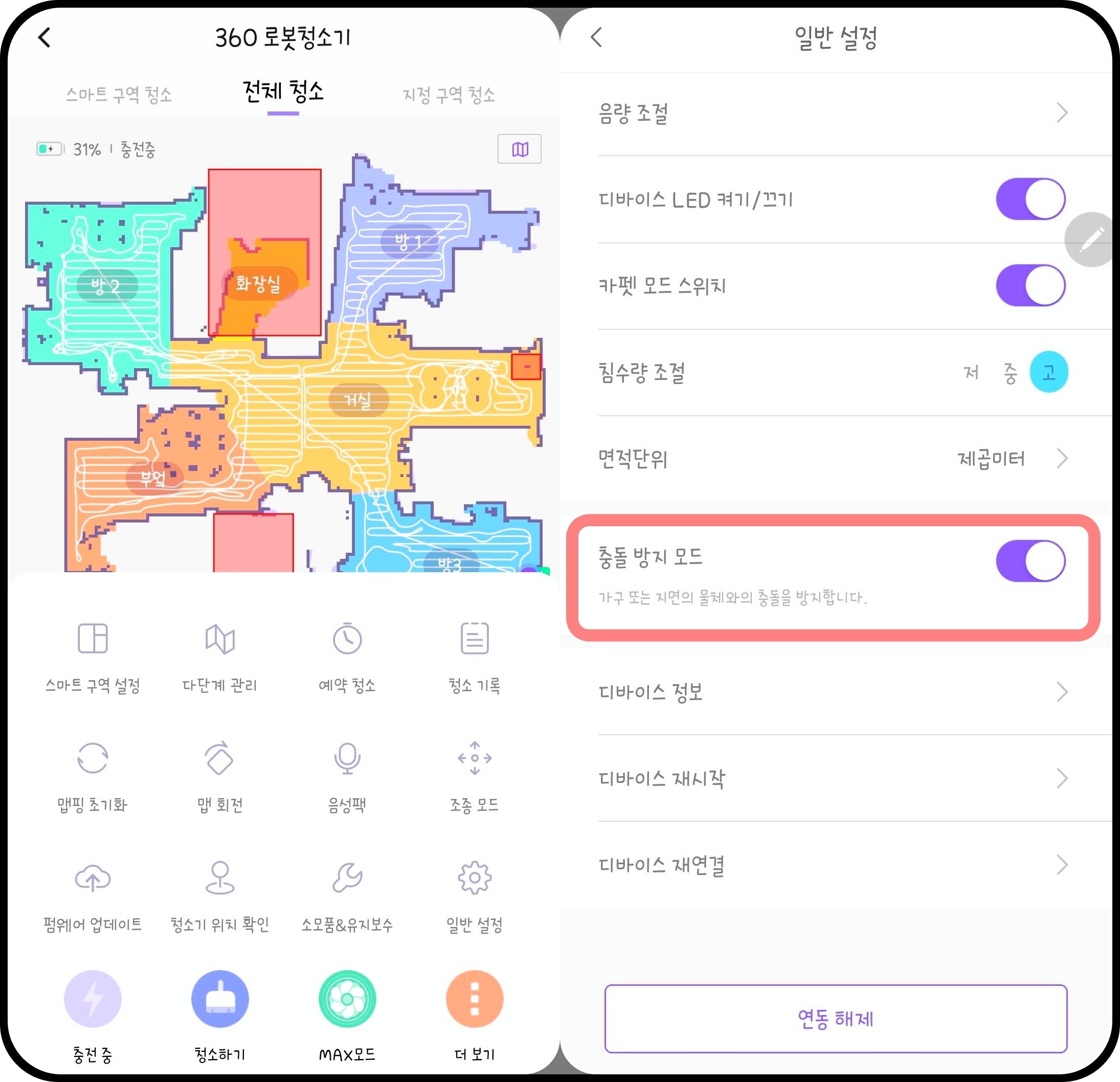 치후 제품에서만 확인할 수 있었던 충돌방지(가구보호) 설정은 꽤나 신기했는데요. 이 설정을 끄면 좀 더 구석구석 밀착하면서 청소를 해 청소시간이 살짝 길어지지만 이 설정을 켜면 가장자리를 조금은 가볍게 청소를 하여 가구와 충돌을 최소화 할 뿐 아니라 청소시간도 줄어들었습니다. 이 설정을 킨 상태로 사용하는게 여러모로 좋았어요.