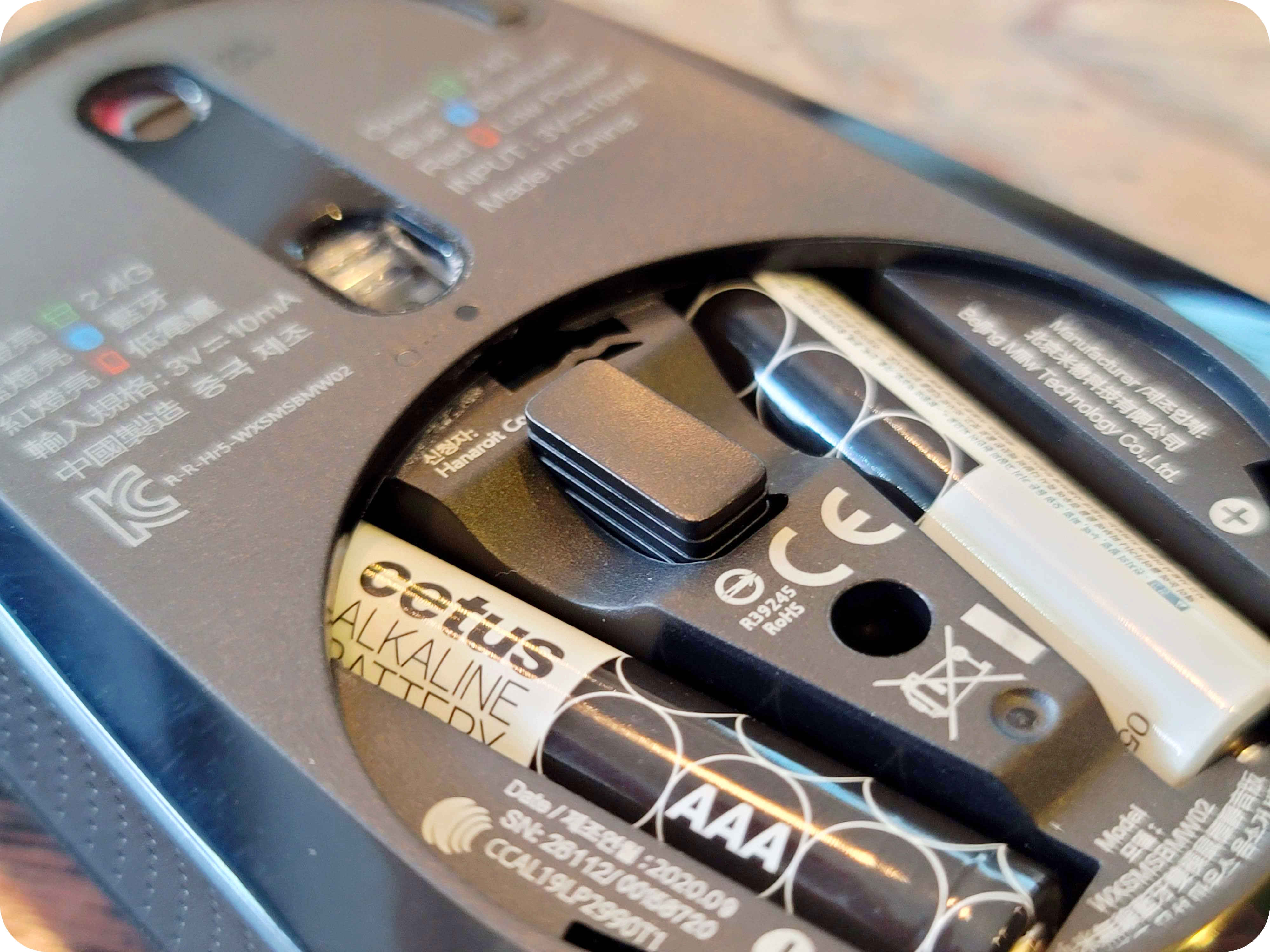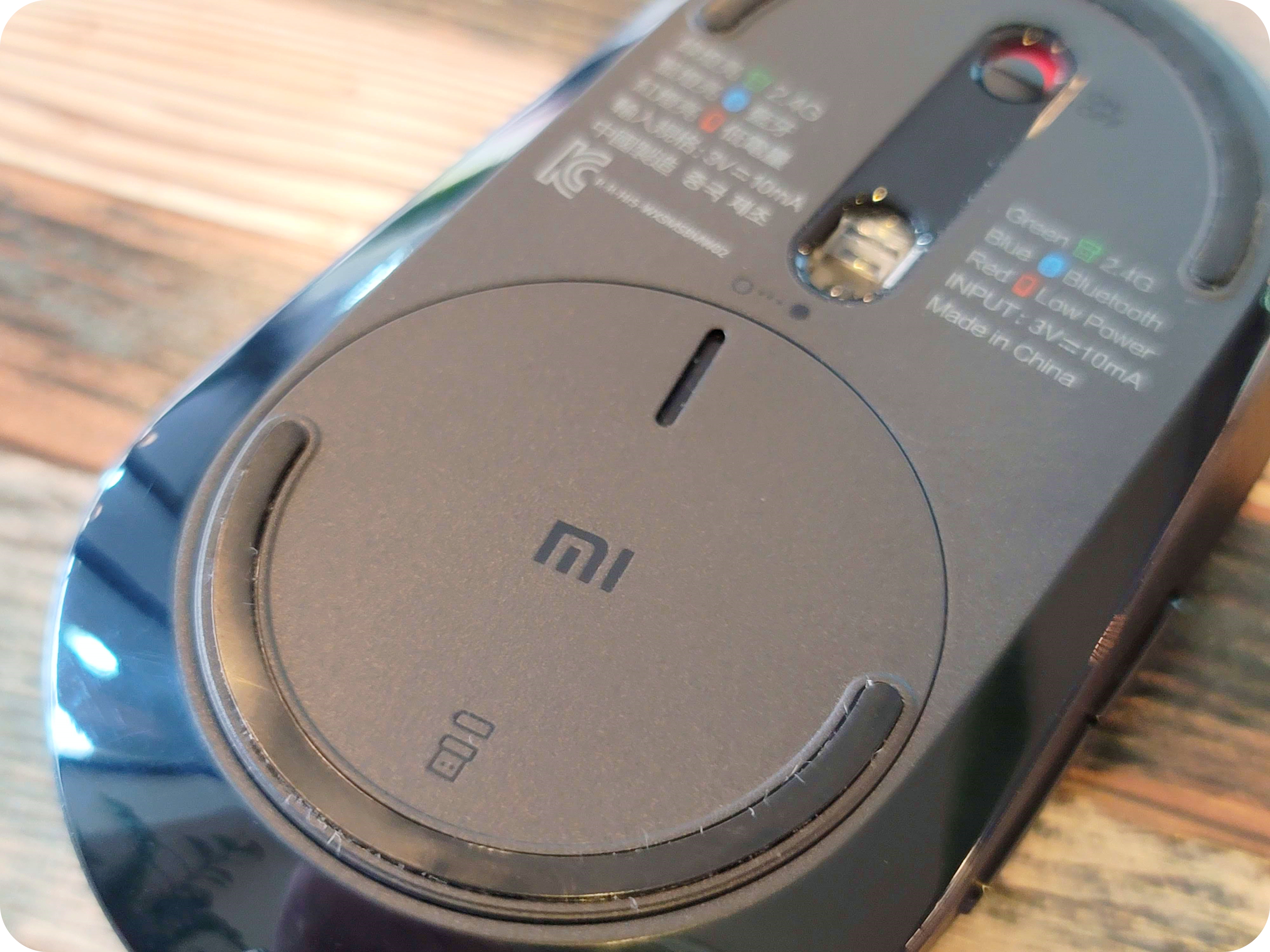 마우스 휠 아래에 있는 버튼은 DPI를 조절하는 버튼이 아닌 모드 변경 버튼이다. 초록색의 경우는 2.4 GHz 수신기 사용, 파란색은 블루투스 사용을 뜻한다.
