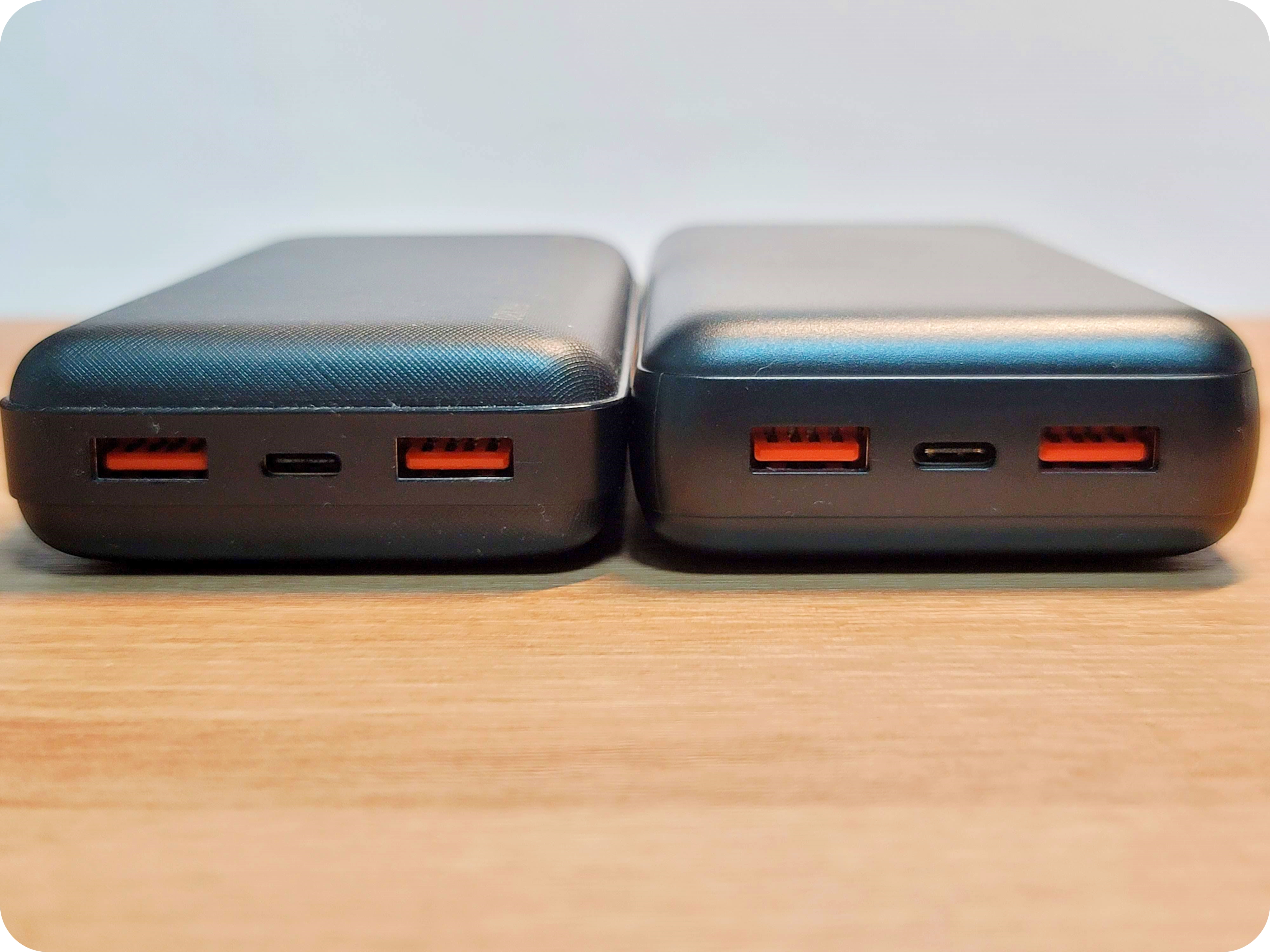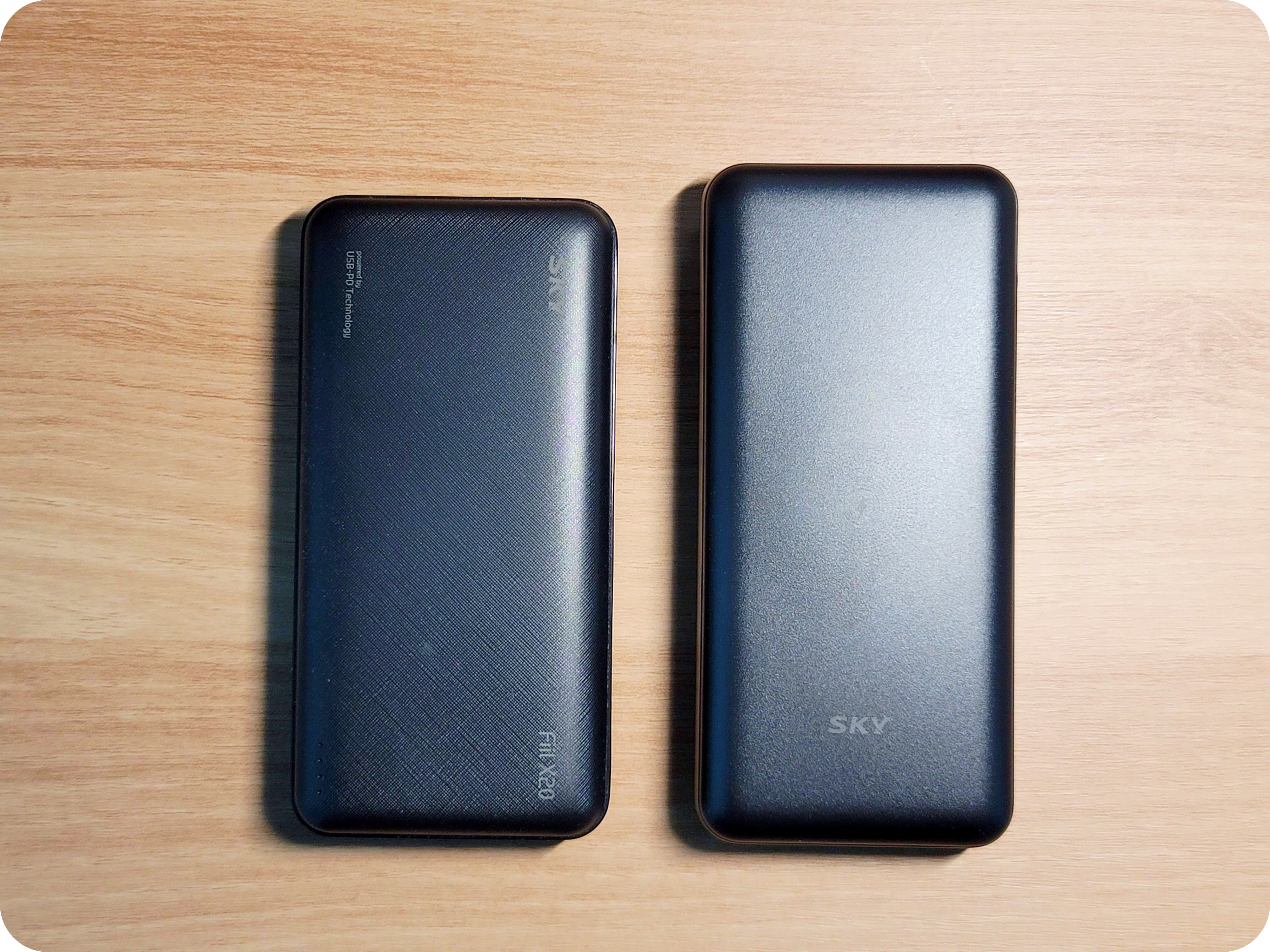 다음은 스카이 보조배터리 중 같은 용량으로 비교를 해보자. X20은 무선충전 기능이 빠진 가성비 보조배터리인데 여기에 무선충전이 들어간 것 치고 WX20의 크기 차이는 그렇게 크지는 않다.