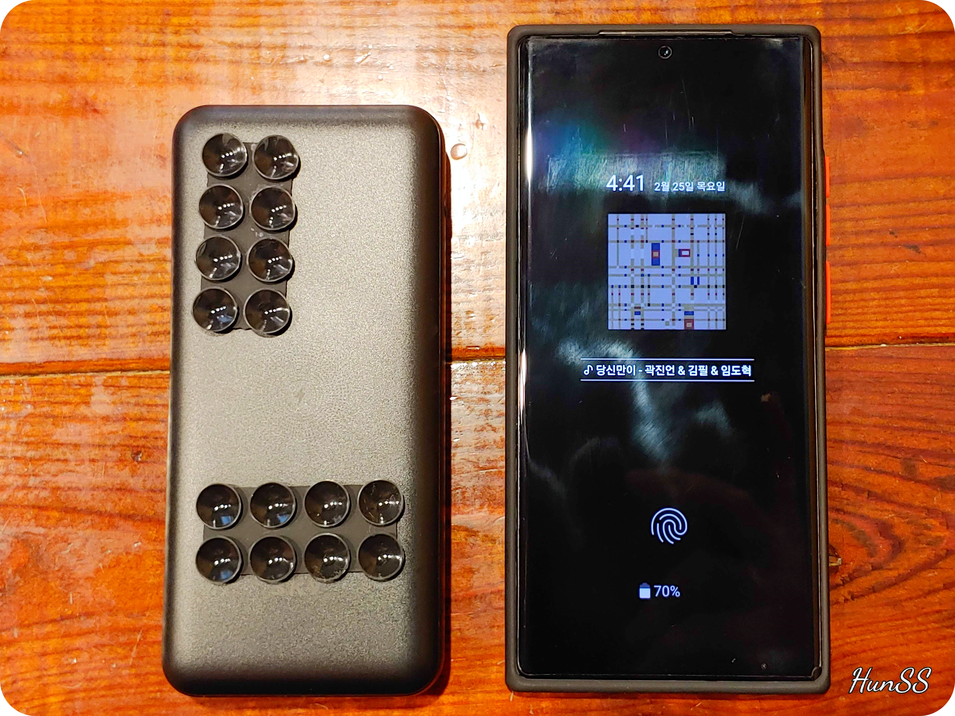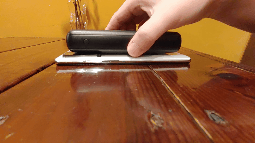 당연히 흡착판을 이용하면 보조배터리 위에서 미끄러질 염려도 없고 심지어 뒤집어도 스마트폰이 떨어지지 않을 정도로 강력하게 달라붙는다.