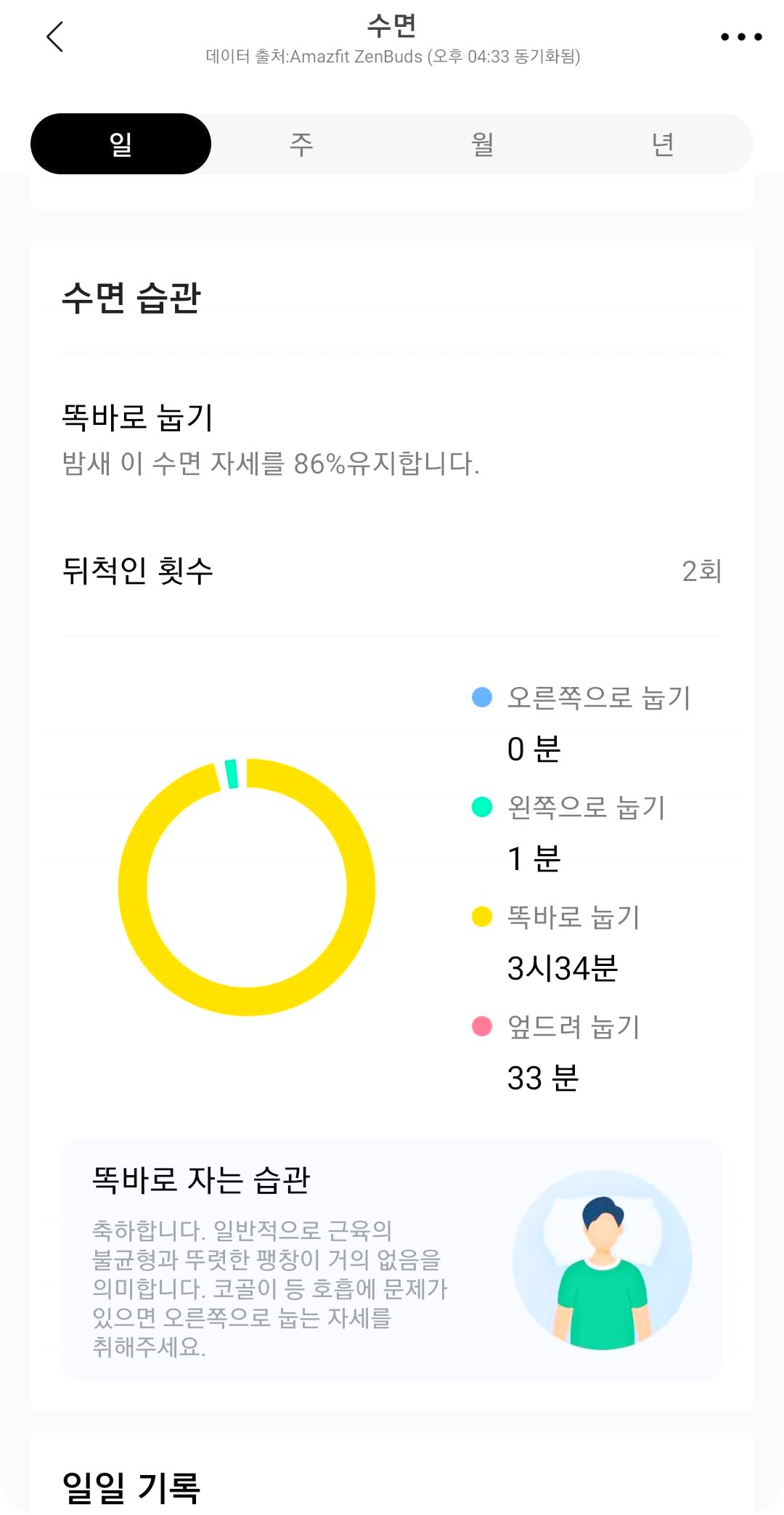 그래도 귀에 착용하는 웨어러블답게 스마트워치와는 다른 수면 측정을 보여준다. 스마트워치에서는 수면 습관까지는 나오지 않는다. 젠버즈를 이용하니 똑바로 잤는지, 옆으로 누워서 잤는지 패턴을 알려주었다.