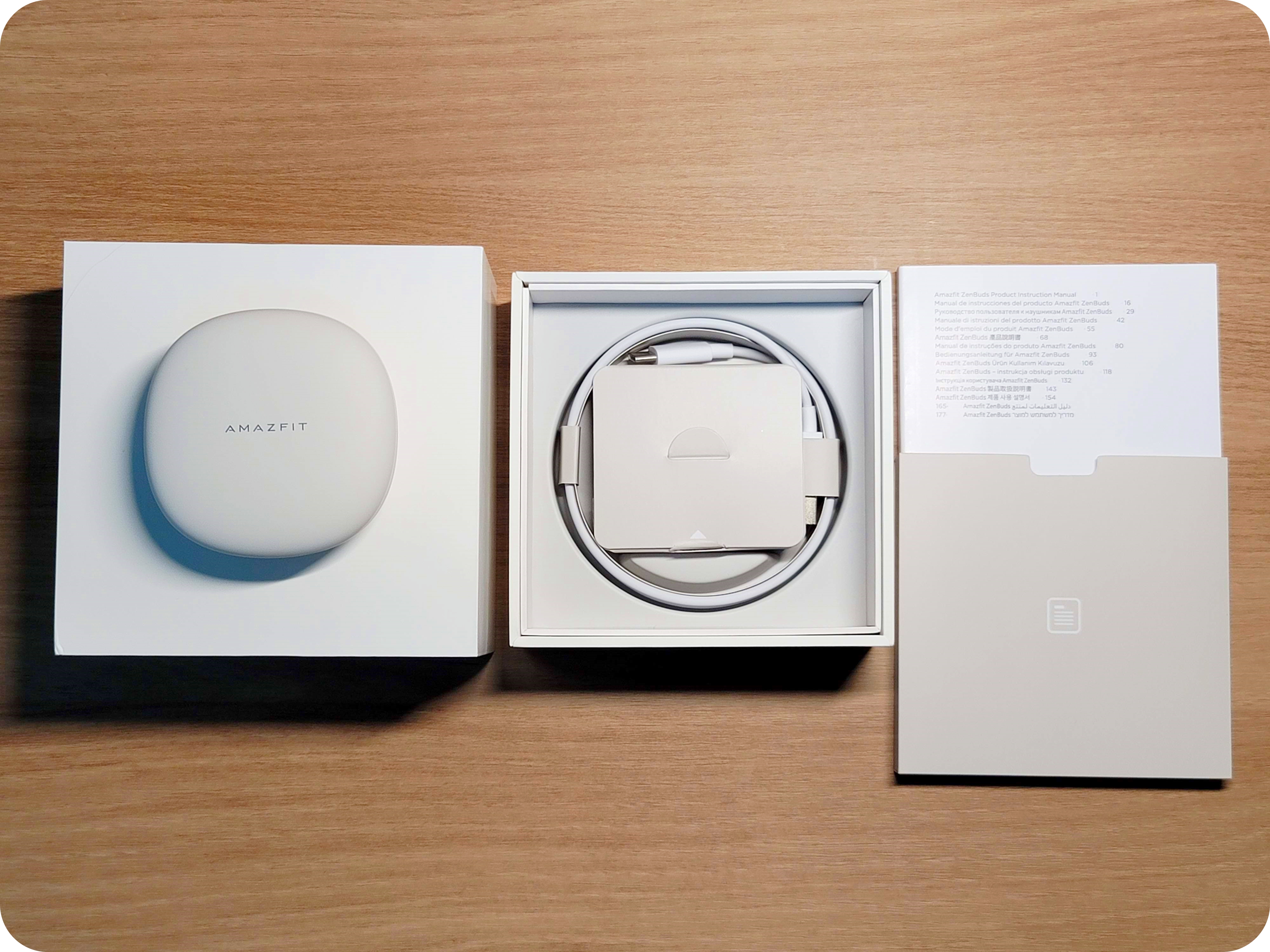 상자 내부의 구성품은 다음과 같다. 1) 젠버즈 본체, 2) 충전 케이블과 이어 팁, 3) 사용 설명서