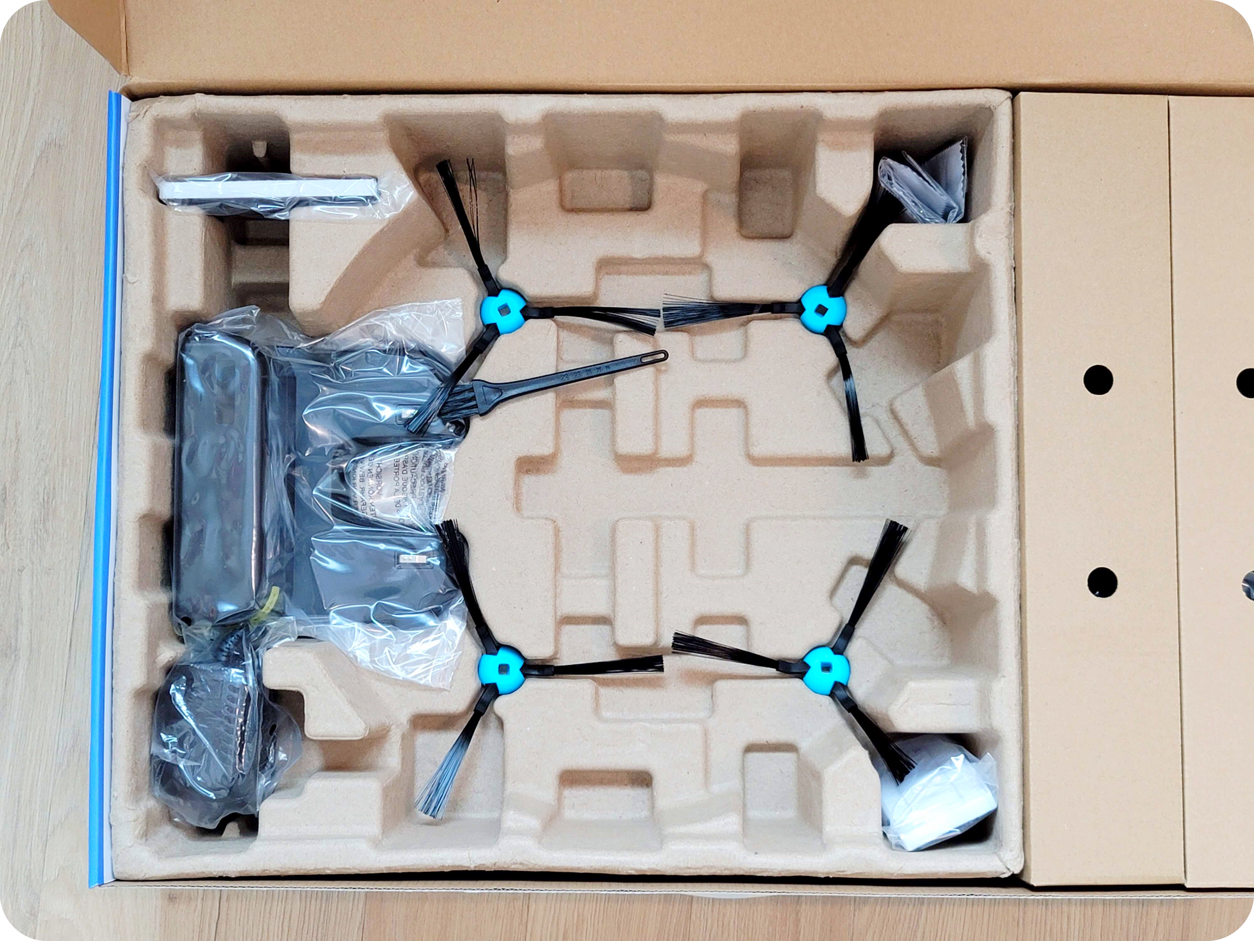 박스 내부를 보니 안전하게 왔다는 확신이 들었다. 사실 제품의 완성은 포장상자에 있다고 봐도 된다. 아무리 좋은 제품이라도 택배로 받는 상품인 경우 안전하게 오지 않으면 이미지부터 좋지 않게 되니 말이다. 클리엔 R9은 완충작용을 충분히 할 수 있는 구조로 되어있다. 게다가 구석구석 구성품도 알차게 넣어놨다.