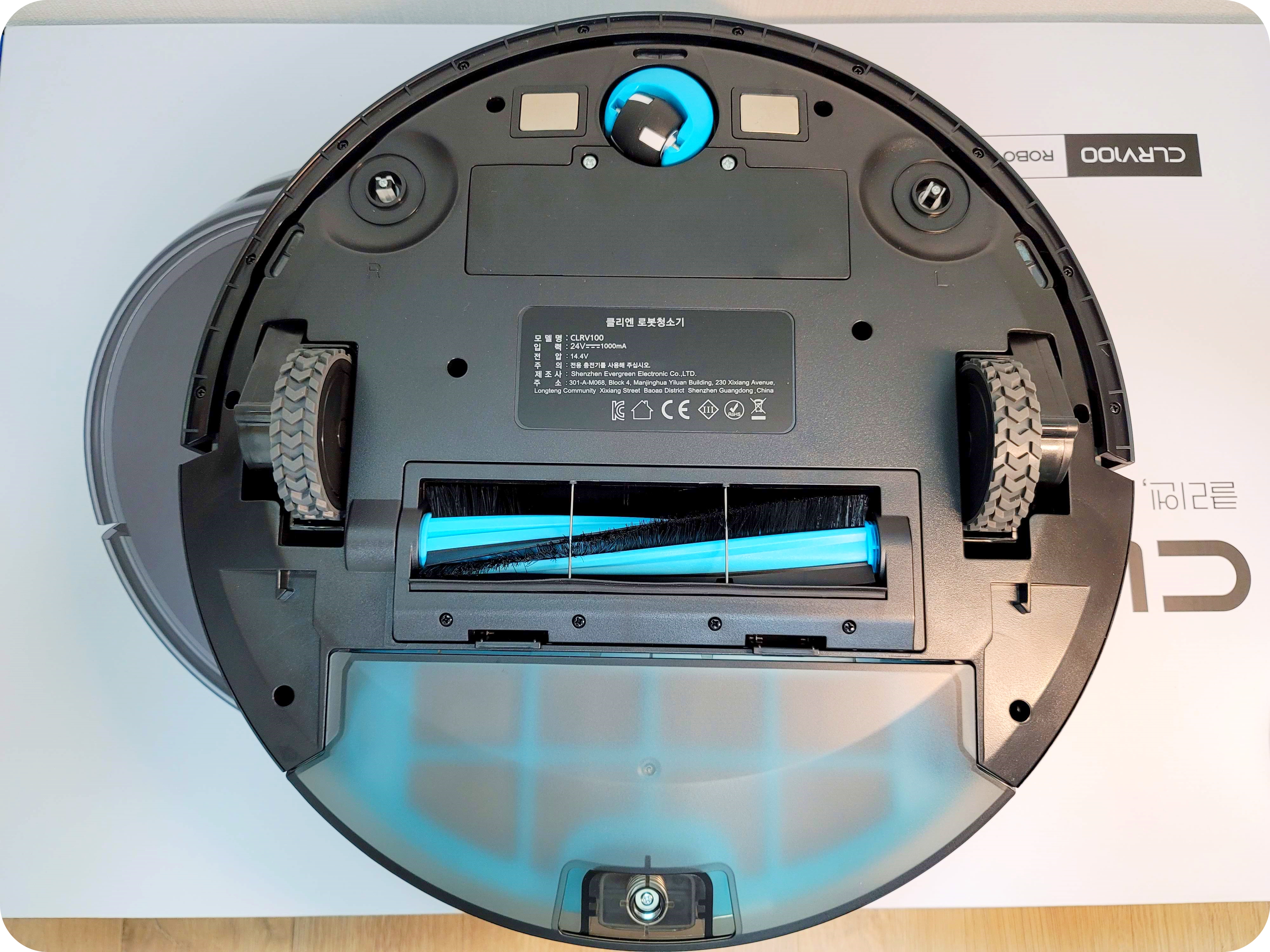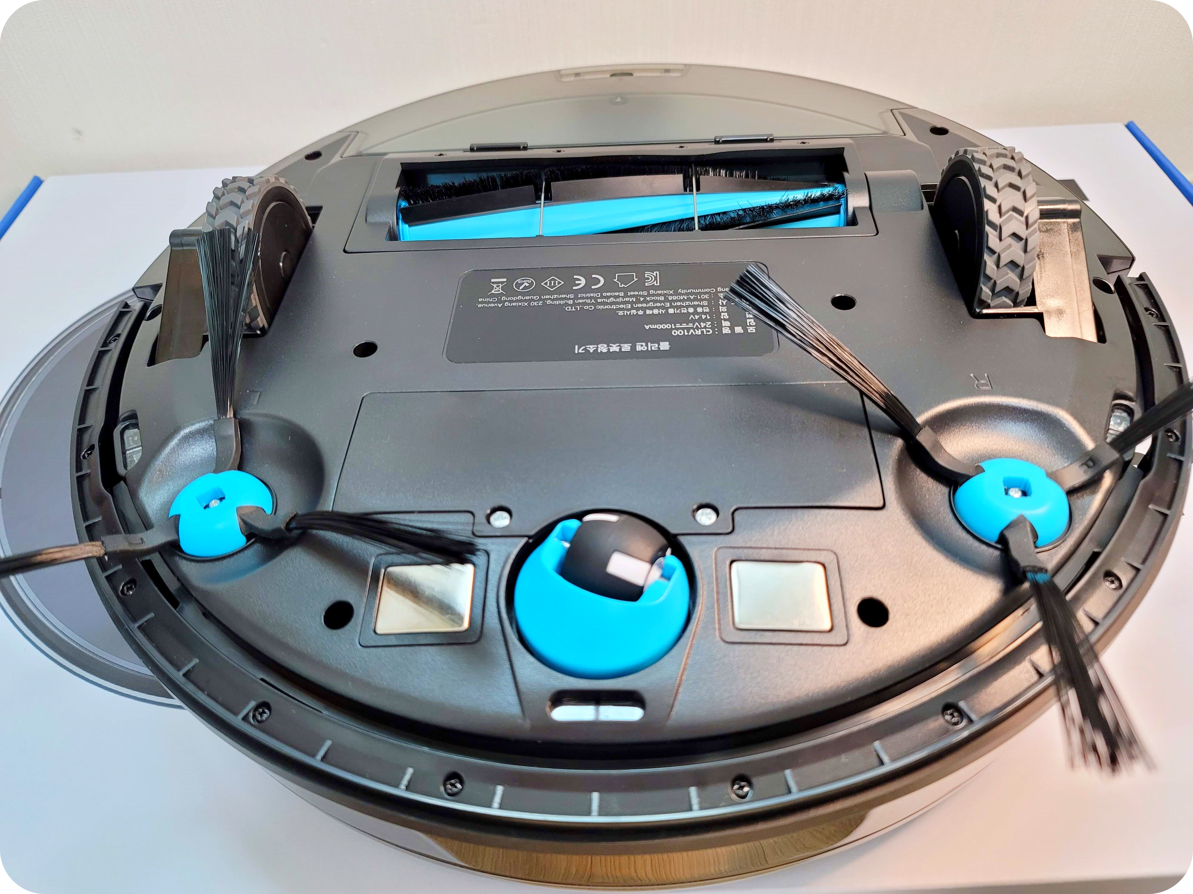 클리엔 R9은 사이드 브러시를 양쪽으로 2개 사용하는 구조이고, 사이드 브러시가 다른 제품에 비해서 긴 편이다. 이 부분이 장점이 될지 단점이 될지는 다음에 알아보도록 하자. 그 외에 하부는 대략적으로 낙하방지 센서 3개, 충전극 2개, 사이드 브러시 2개, 메인브러시로 구성이 되어있다.
