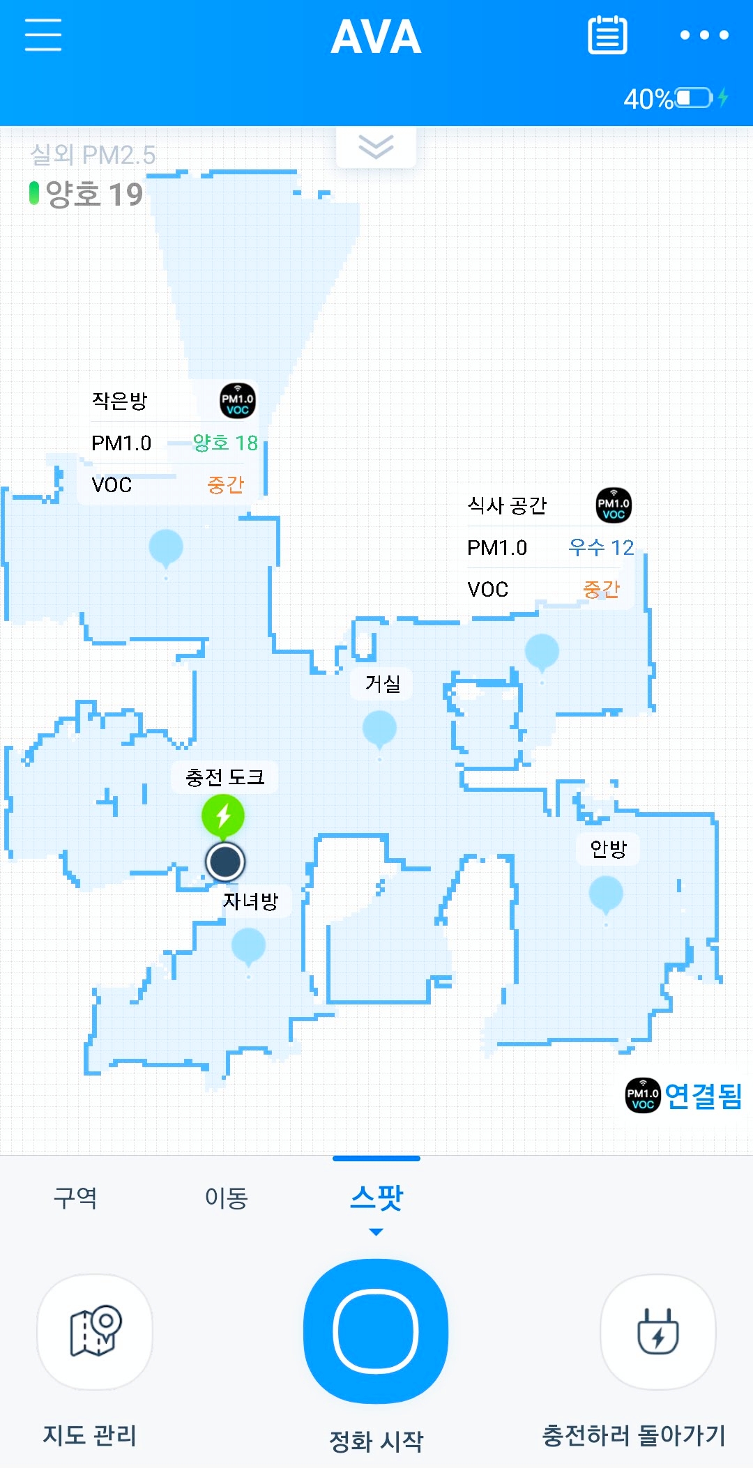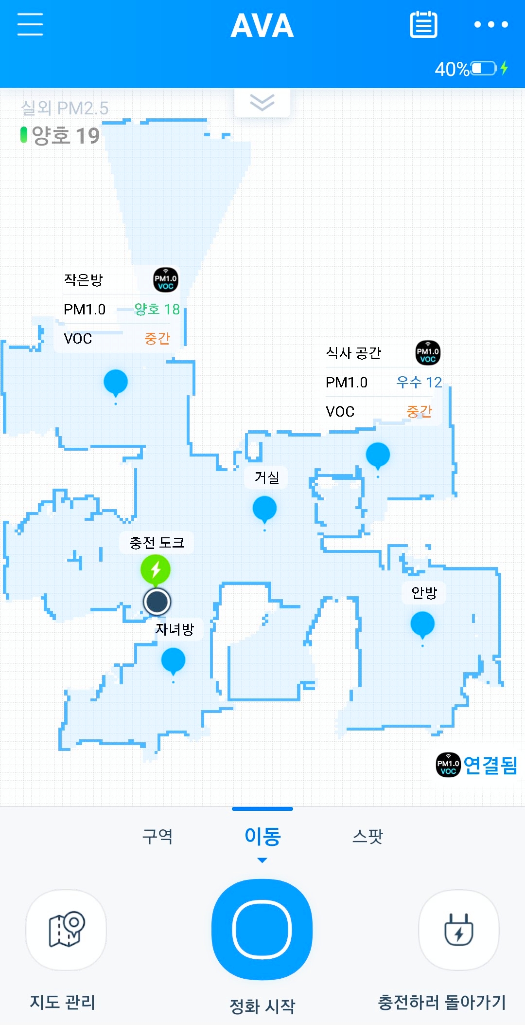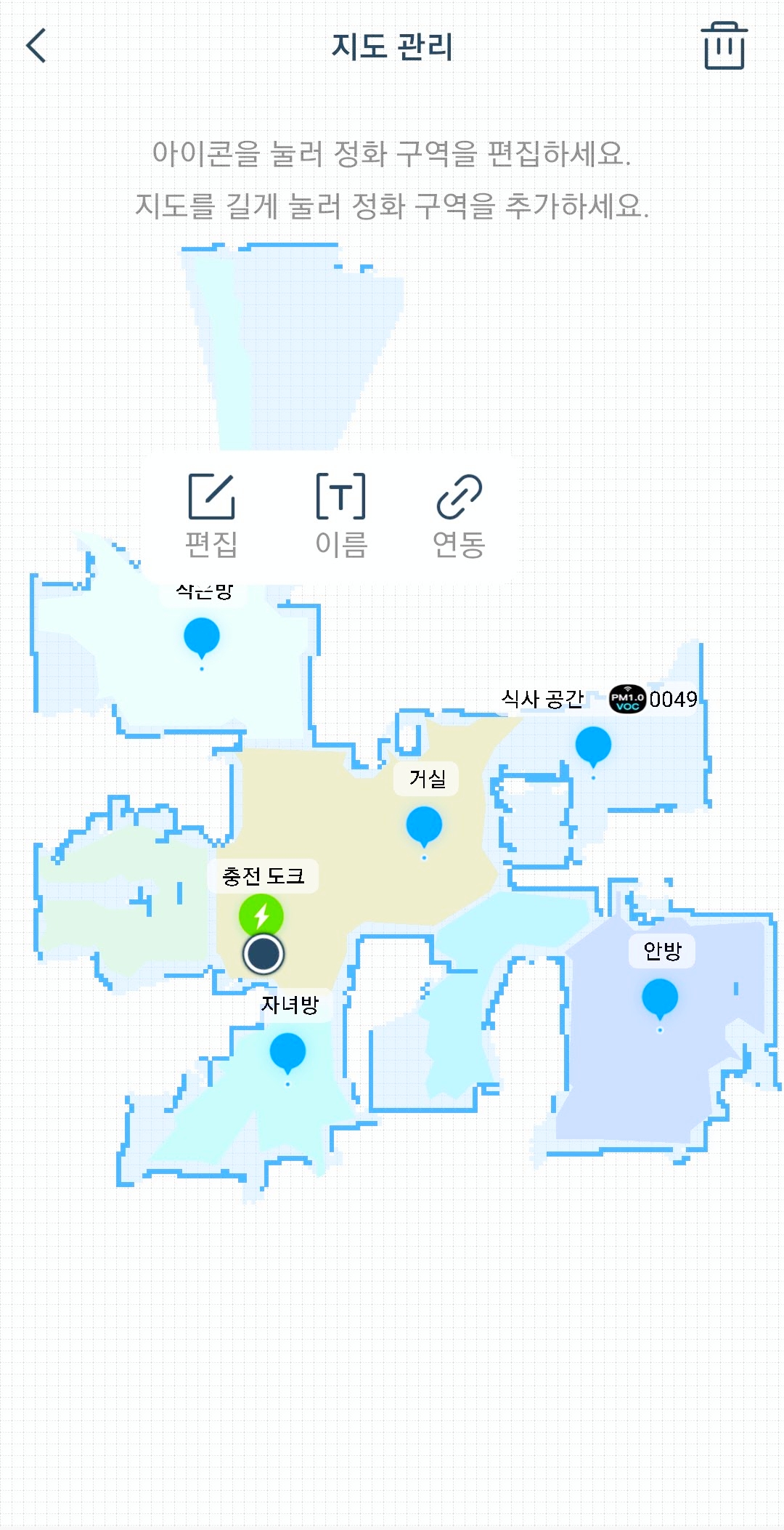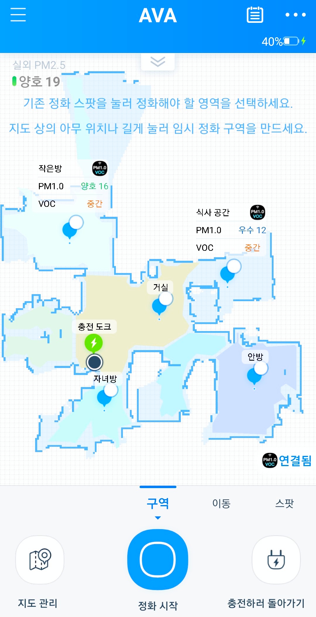 이렇게 맵핑이 완료되면 알아서 청정구역이 지정된다. 주변 지형에 따라서 정화를 하여야 할 곳에 지정이 되는데 이 부분은 지도관리를 통해 추가하거나 제거할 수 있다.