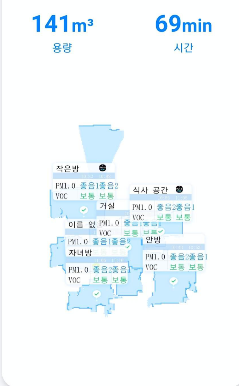 해당 구역에서 정화가 작동되는 시간은 미세먼지 수치와 VOC 수치 상태에 따라서 달라진다. 미세먼지와 VOC수치가 낮은 경우 빠르면 10분 동안 구역에 머물러 있으며 수치가 낮아지지 않는 경우는 1~2시간 이상도 한 구역에서 작동이 된다. 정화가 완료되면 처음 수치와 정화 후 수치가 표기되어 한눈에 확인하기 편하다.
