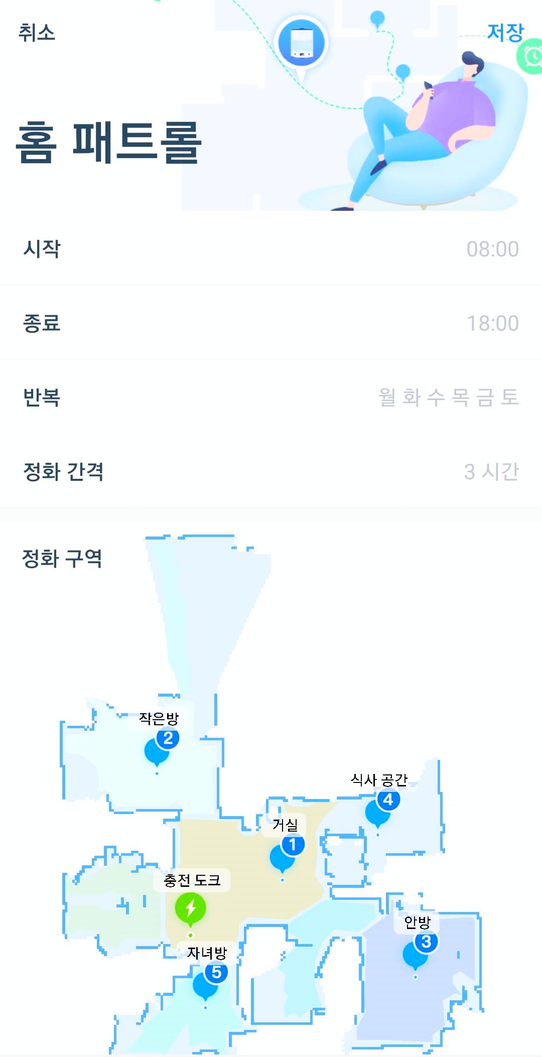 매번 직접 작동시키는 것이 번거롭다면 예약 기능인 정화 시나리오를 이용하면 좀 더 스마트한 사용 환경을 만들 수 있다. 시나리오 스케줄은 총 4가지 모드가 있으며 필자는 '홈 패트롤' 모드와 '야간' 시나리오를 이용하고 있다.