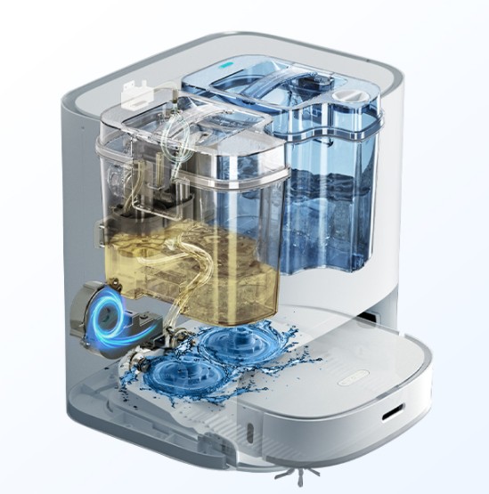 걸레를 세척 시 스테이션 안에서 걸레가 돌아가며 돋아있는 돌기에 빨래를 하게 된다. 더러운 물은 오수통으로 들어가며 통은 따로 분리가 되기 때문에 관리를 하기에도 좋다. 정수통과 오수통은 각각 4L의 대용량 수조로 아무리 넓은 집이라도 물이 마를세 없이 물청소가 가능한 것도 특징이다.