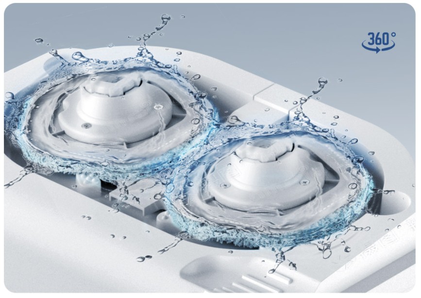 전면에는 먼지 흡입구가 달려있는데 브러시리스 모터가 사용되어 조용하고 강력한 흡입력을 자랑한다. 4000Pa의 강력한 흡입력을 보여주며 뒤에는 회전형 물걸레가 분당 360회 회전하며 10N의 힘으로 눌러가며 바닥을 닦아준다.