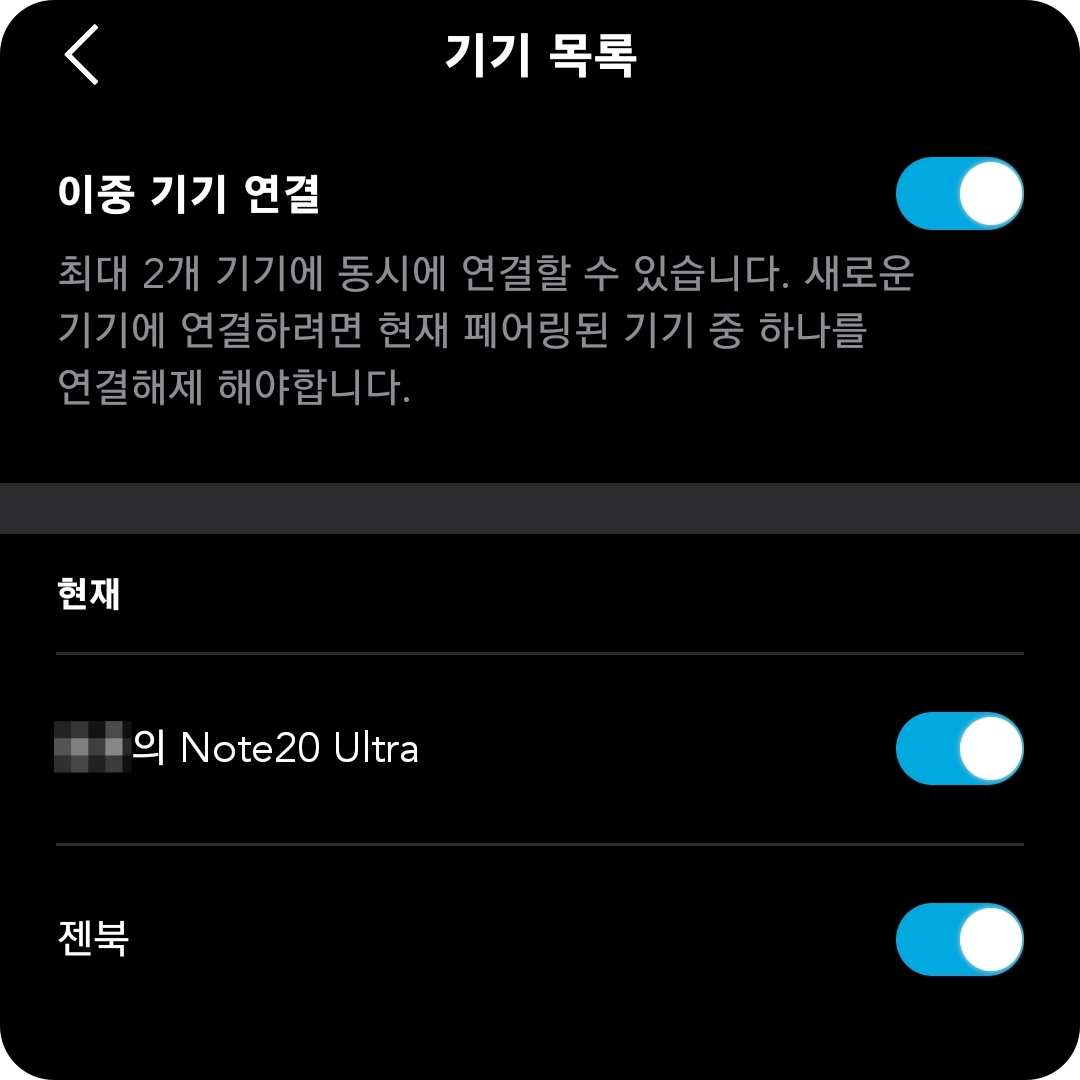 사운드코어 어플 > 설정 > 기기 목록 탭으로 이동하면 이중 기기 연결의 항목이 보인다. 이걸 체크해줘 활성화해주면 멀티포인트 기능을 사용할 수 있다.