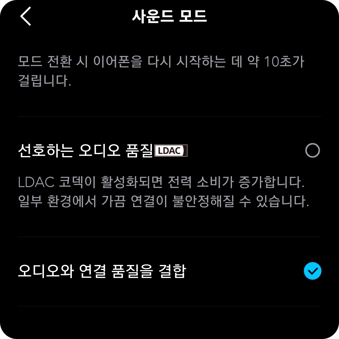 앤커 스페이스 A40은 고음질 코덱인 LDAC를 사용할 수 있다. 이 코덱을 이용하려면 어플상에서 '선호하는 오디오 품질'을 눌러야 LDAC코덱이 활성화되는데 활성화가 되면 자동으로 LDAC모드가 적용된 것을 볼 수 있다.