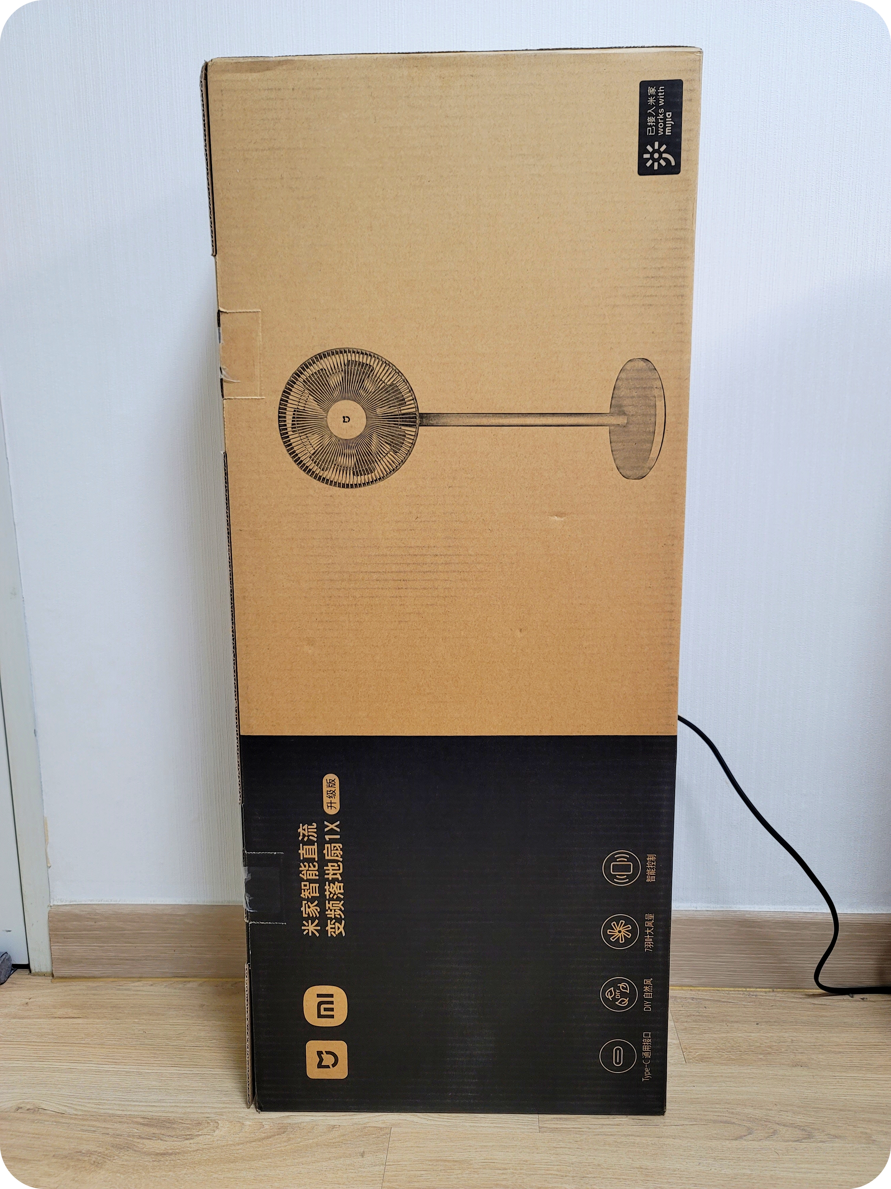 이 제품은 국내 정발된 제품이 아닌 중국 내수용 제품이라 그런지 선풍기 박스에는 중국어로만 표기가 되어있다. 샤오미에서 직접 출시한 제품답게 MI로고와 미지아 방패로고가 모두 들어가 있는 모습이다. 이 제품의 정식 이름은 미지아 스마트 DC 인버터 선풍기 1X이며 끝에 업그레이드 판이라고 표기가 되어있다.