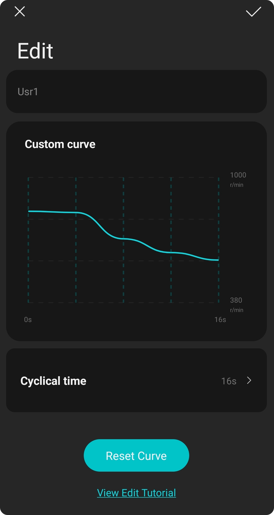 어플 내 자연풍 모드에 More를 누르면 Usr 모드가 있는 것을 볼 수 있다. Usr를 누르면 아무것도 나오지 않지만 여기에 손으로 풍량을 그려 넣으면 위 사진과 같이 굴곡진 그래프가 완성된다. 너무 가파른 그래프는 그려지지 않으며 완만하게 조절하면 되는데 이러면 내가 원하는 자연풍이 만들어진다.