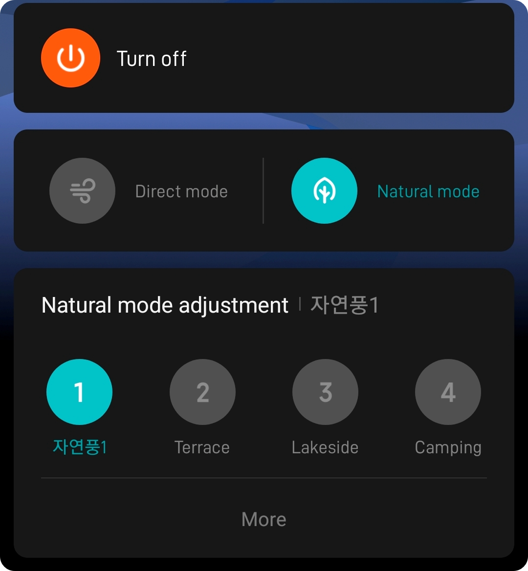 만들어진 자연풍은 수정모드에서 넣으면 이렇게 선택하여 실제로 내가 만든 자연풍으로 바람을 쐴 수 있다. 지금까지 이용하던 선풍기의 자연풍이 만족스럽지 않았다면 샤오미 선풍기 1x를 구매하여 자연풍을 직접 만들어보자.
