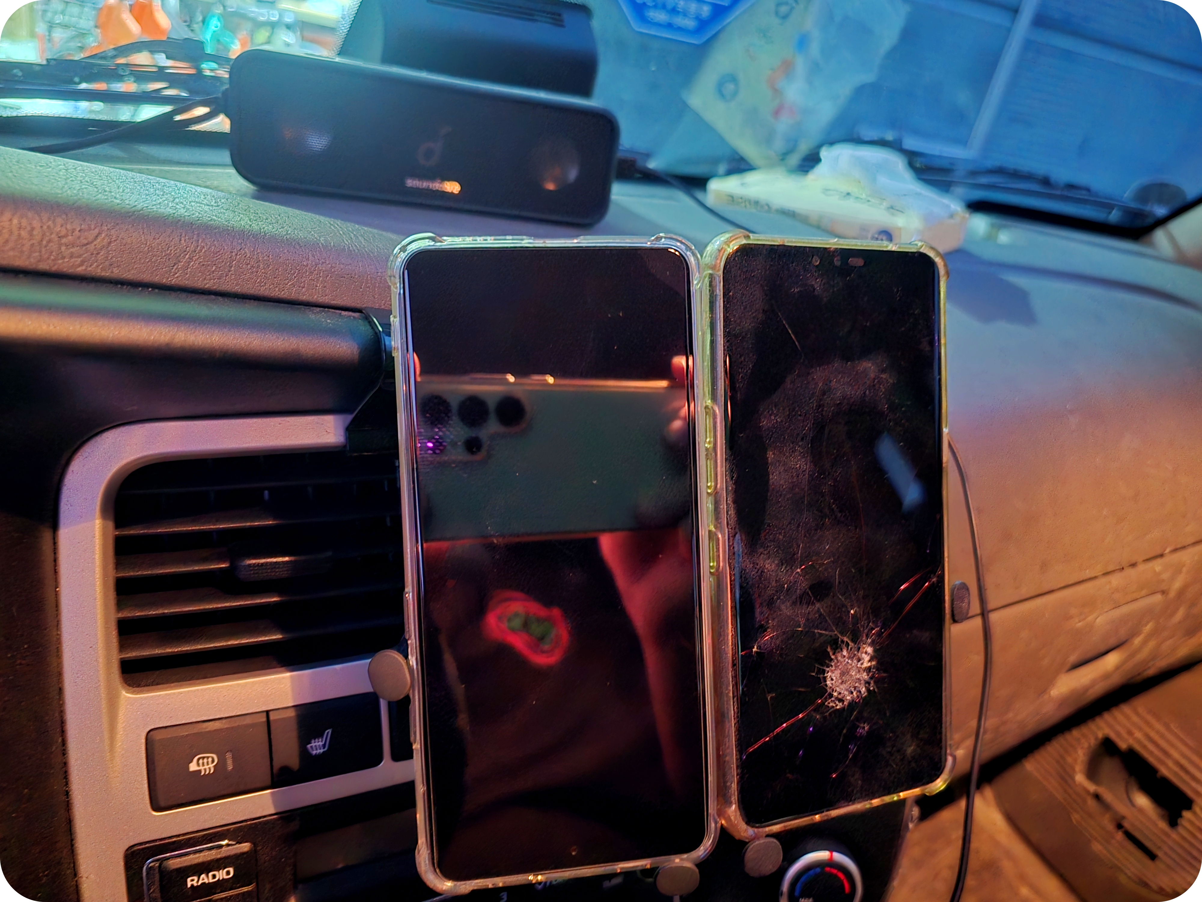 해당 사진은 왼쪽부터 포코X6 PRO와 LG V50을 같이 거치해 본 사진이다. 일반적인 거치대와 다르게 중력 거치 시 받침대가 넓게 펴지기 때문에 이렇게 큰 스마트폰도 거치가 가능했다. 갤럭시 폴드를 가지고 있지 않아 테스트를 해보지는 못하였으나 거치가 가능할 것으로 보인다. (폴드 거치시 무선충전은 사용 못할 것으로 보임)