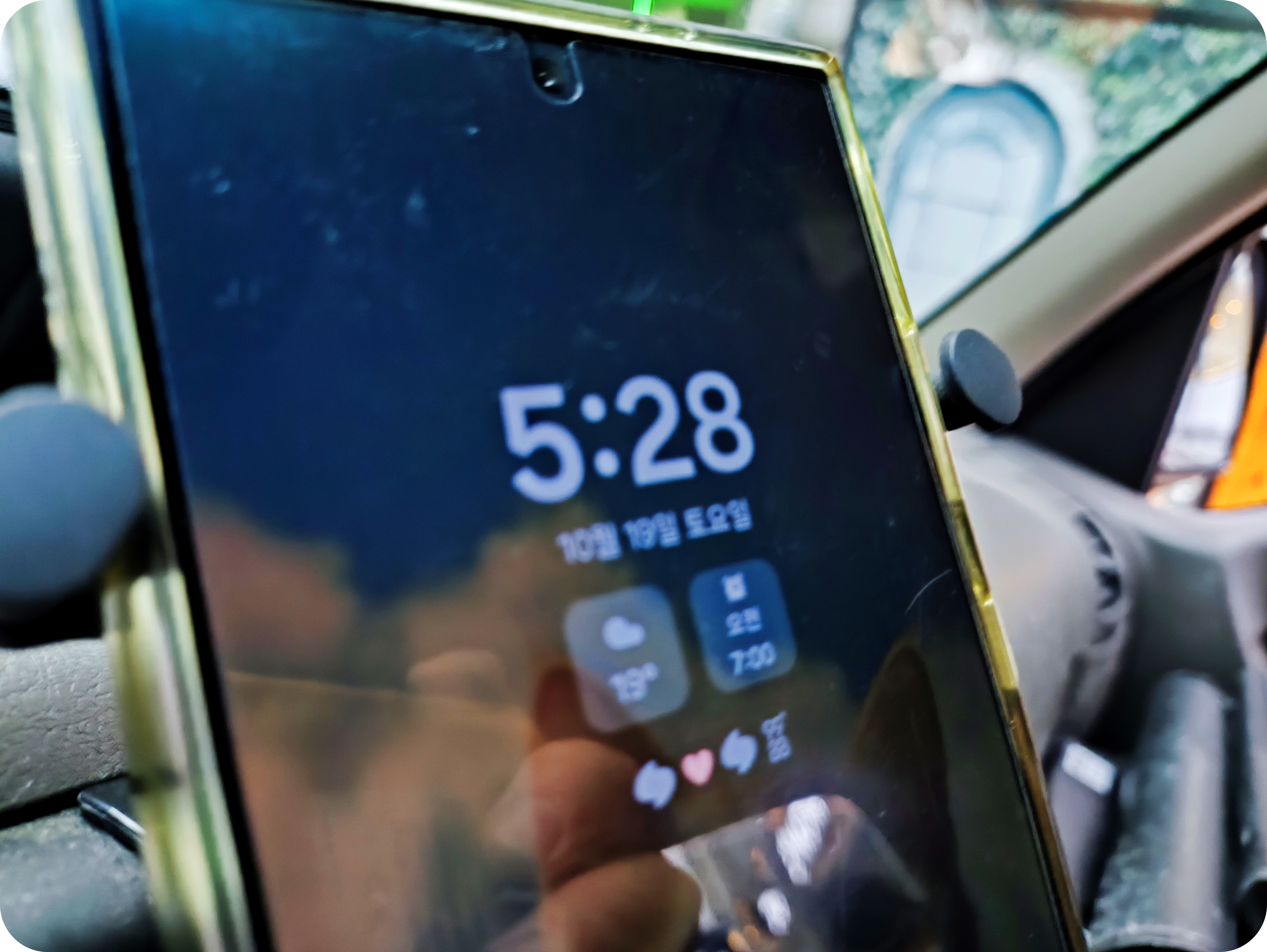 작동 방식 자체가 특별한 제품. 위 이미지처럼 옆으로 긴 스마트폰의 경우 거치를 할 때 간섭이 생길 수 있다. 사실 이 정도는 살짝 비스듬히 거치를 하면 해결이 되는 부분이라 큰 단점은 아니지만 사람에 따라 충분히 불편할 수 있다.