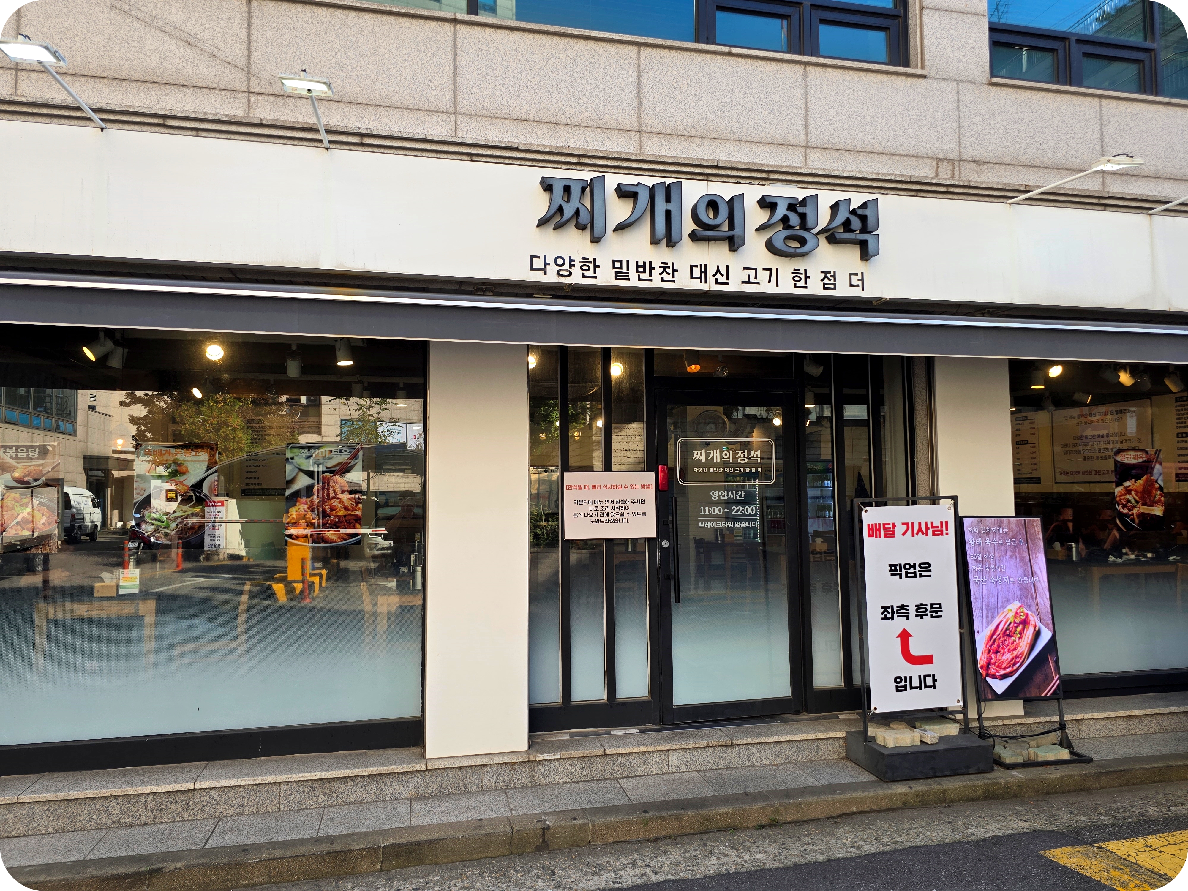 이 날은 성산동 인근에서 일을 하다 점심을 먹으려고 찾아본 음식점. 혼자 밥을 먹게 되어 주차되고 간단한 점심을 먹기 좋은 곳을 알아 보다가 발견한 찌개의정석이다. 주차는 건물 앞에 약 2대 정도 될 수 있고 쉬는날 없이 11:00 ~ 22:00까지 영업을 한다고 한다.