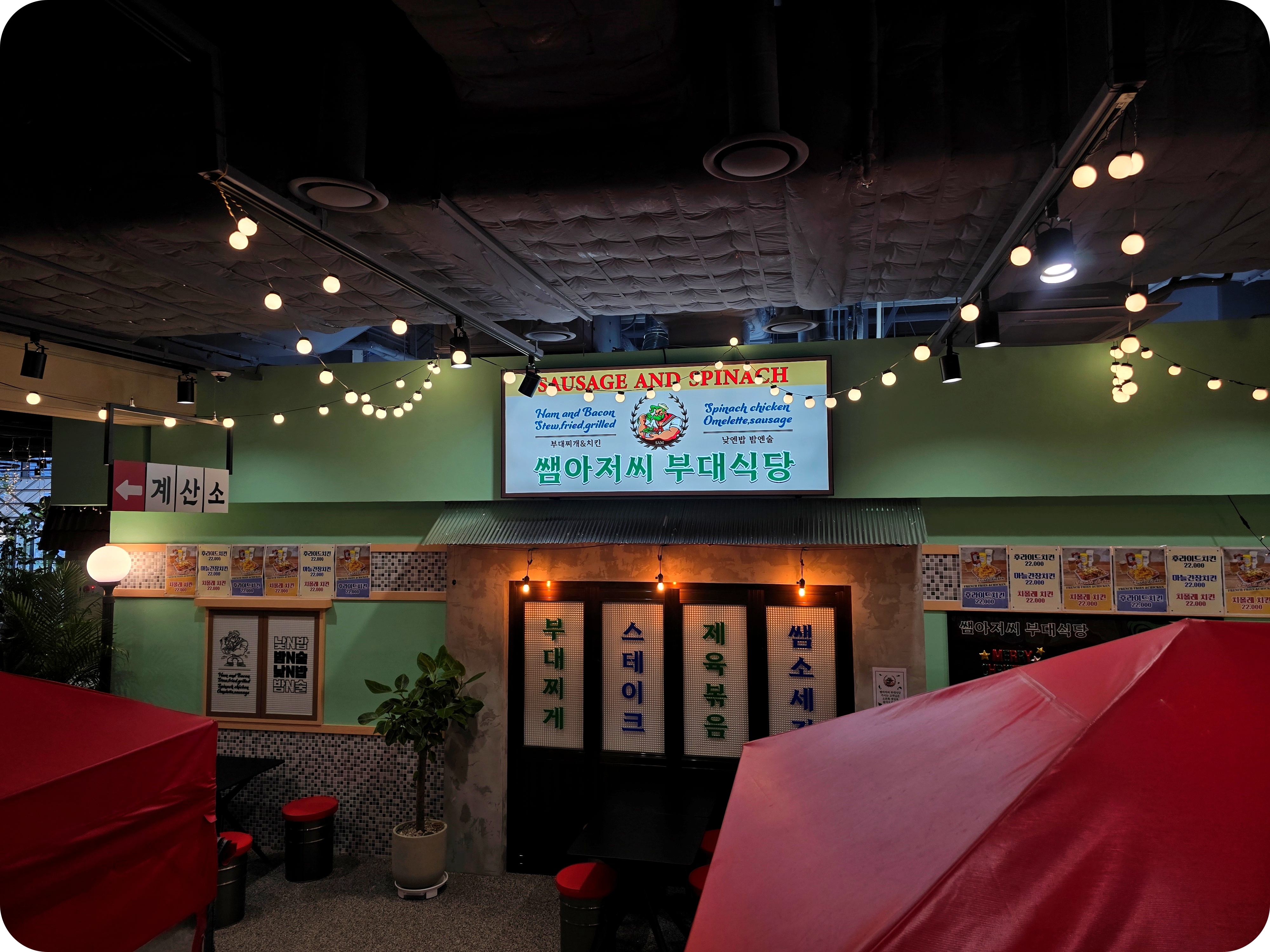 오늘 방문한 식당은 바로 쌤아저씨 부대식당. 부대찌개 외에도 다양한 술안주들을 판매하여 식사와 술 모두 함께 즐기기 좋은 식당이다. 위 사진은 쌤아저씨부대식당의 뒷골목이며 정문으로 들어가면 넓은 자리가 마련되어 있다.