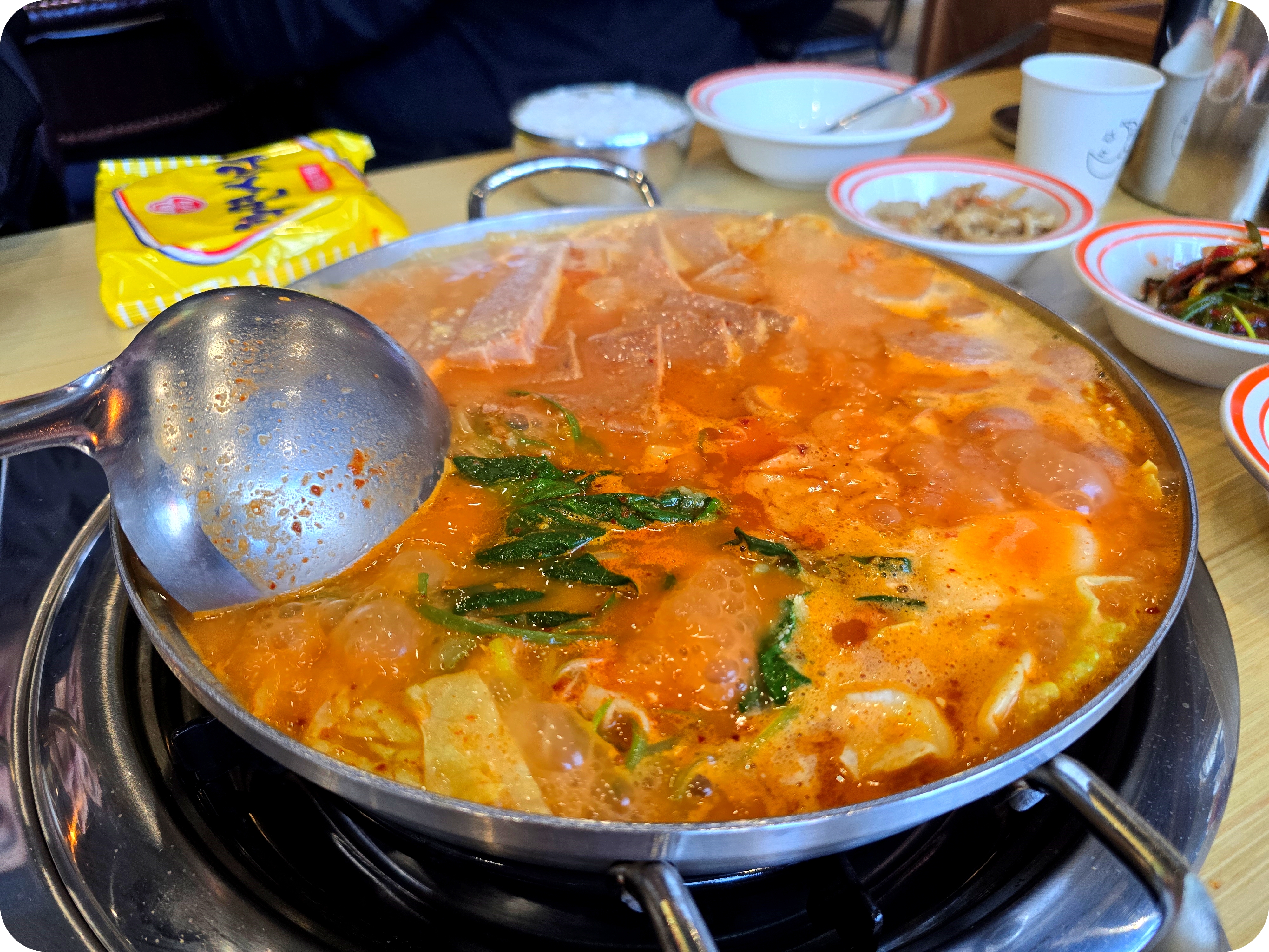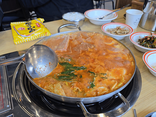부대찌개의 종류는 일반과 얼큰밖에 없어 일반을 주문하였고 일반 부대찌개를 주문하였음에도 햄사리가 상당해 다른 부대찌개 전문점에서 햄부대찌개를 시킨 것과 같은 느낌을 주었다.