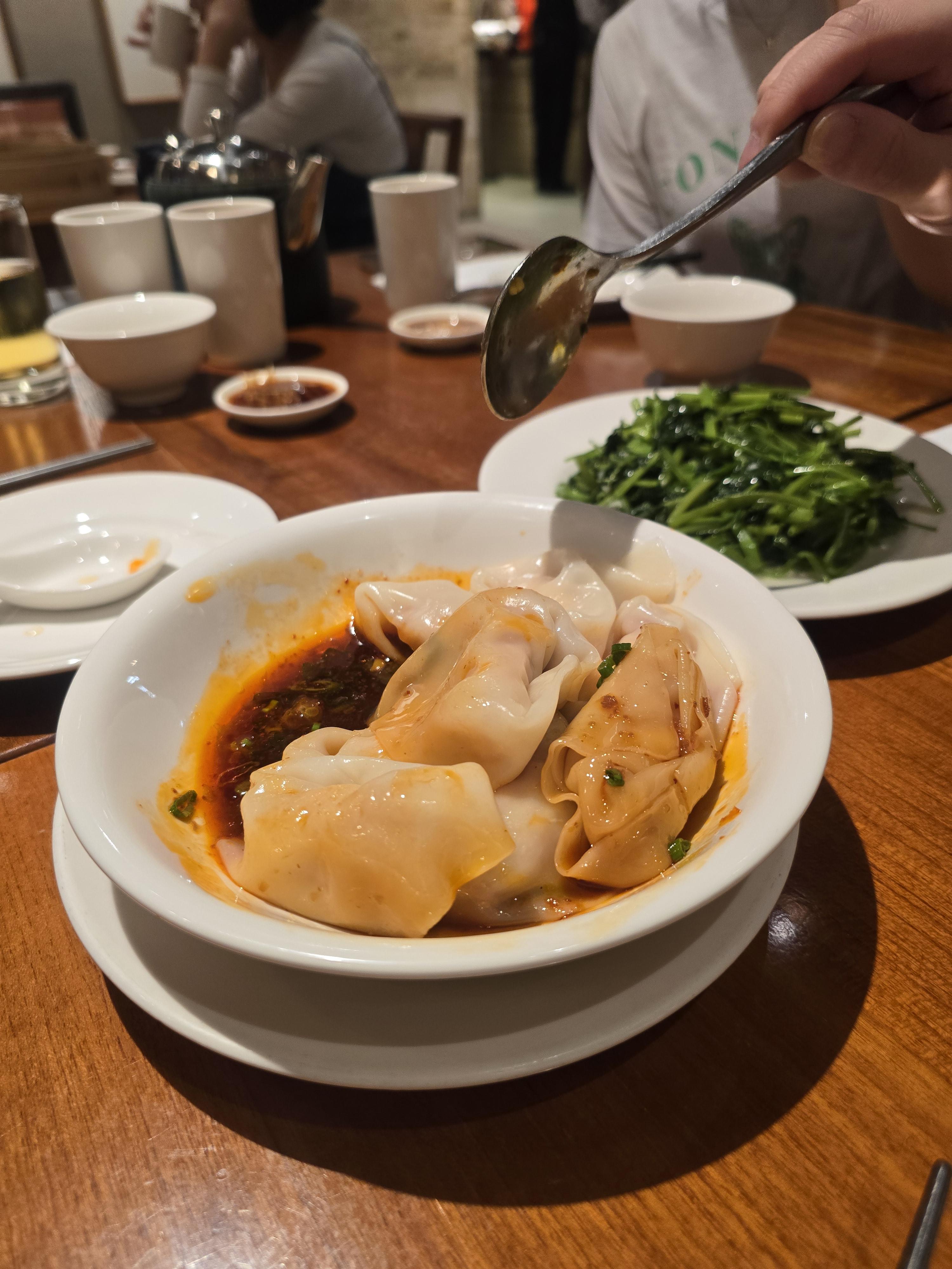 샤오룽바오. 숟가락에 얹고 만두를 살짝 갈라 육즙을 한 입 마신 뒤 샤오룽바오를 한입에 먹으면 진짜 꿀맛. 간장과 식초를 곁들여 먹으면 더 감칠맛이 난다.
