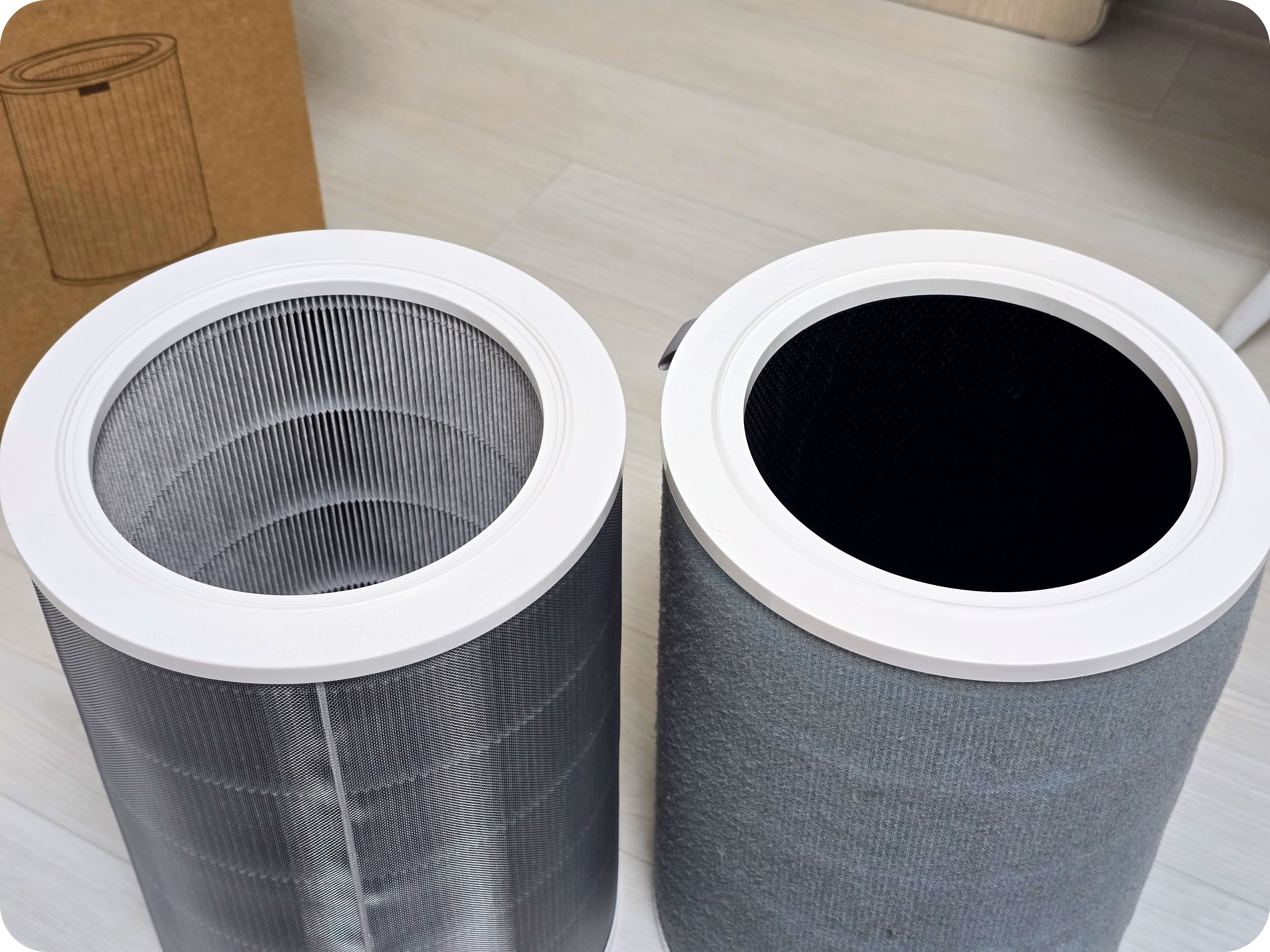 여기 오른쪽에 기존에 쓰던 필터를 보면 안쪽에 검정색으로 활성탄 필터가 들어가 있는 걸 알 수 있다. 그러나 왼쪽에는 활성탄 필터가 보이지 않는다...