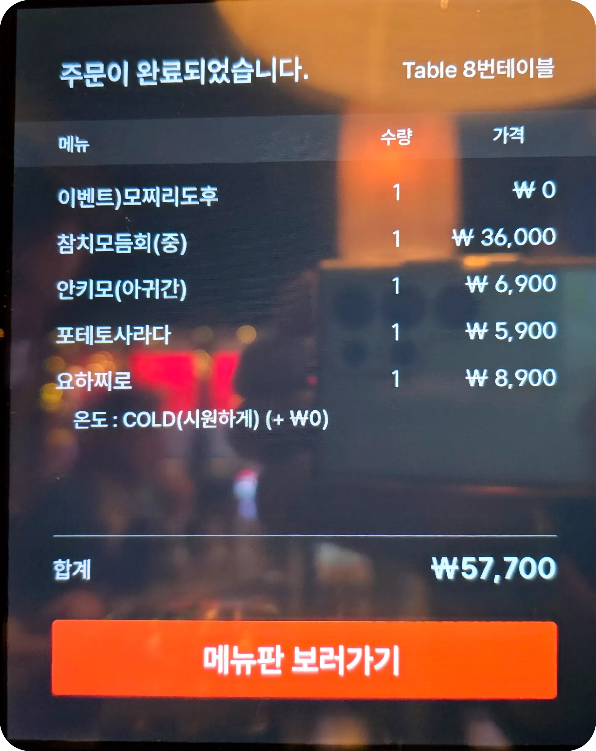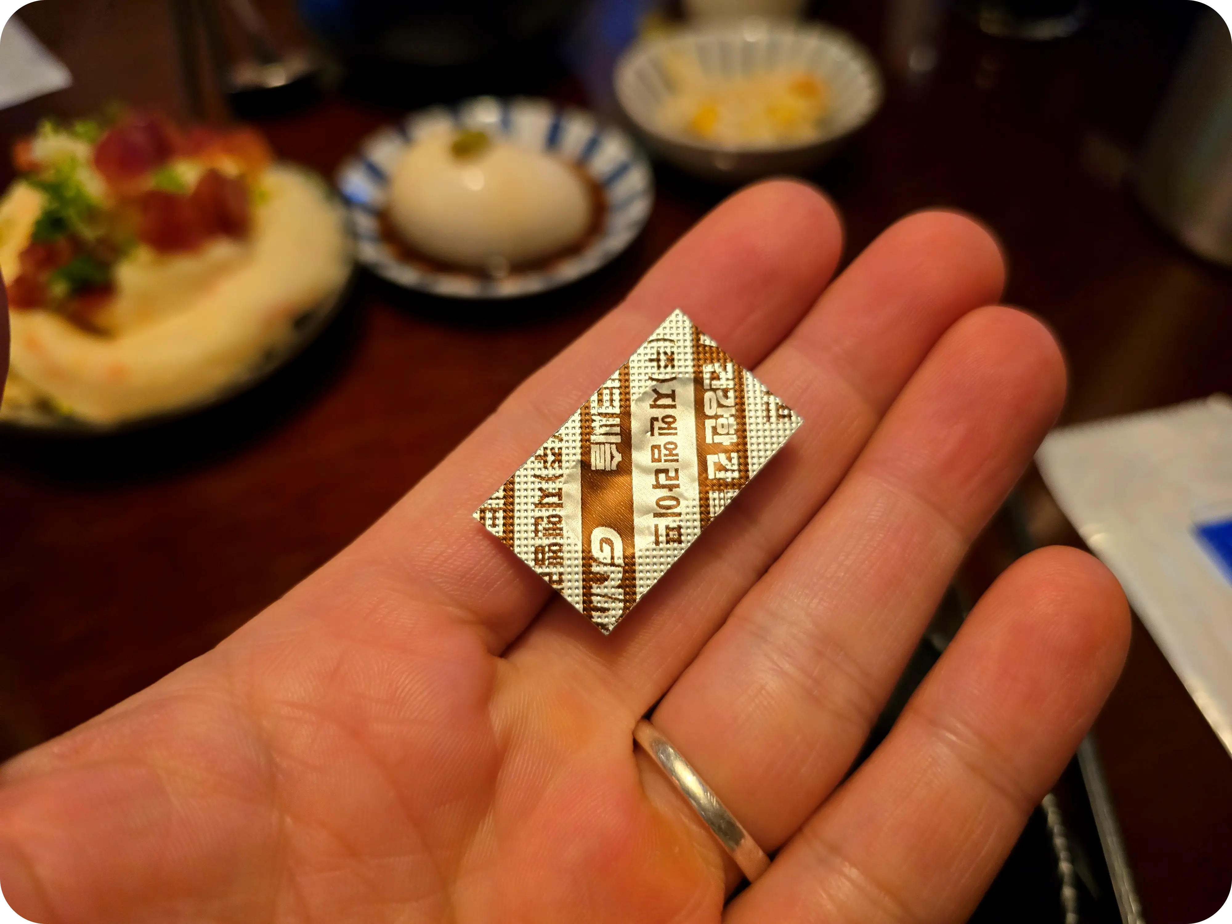 음식을 주문한 뒤 물을 마시려고 컵을 접시에서 뺀 순간 나온 밀크씨슬. 잘못올려진 건가 싶었지만 여자친구 자리에도 있었으며 직원분께 여쭤보니 술 마시기 전에 먹으면 좋다고 드셔도 된다고 하여 바로 먹었다.