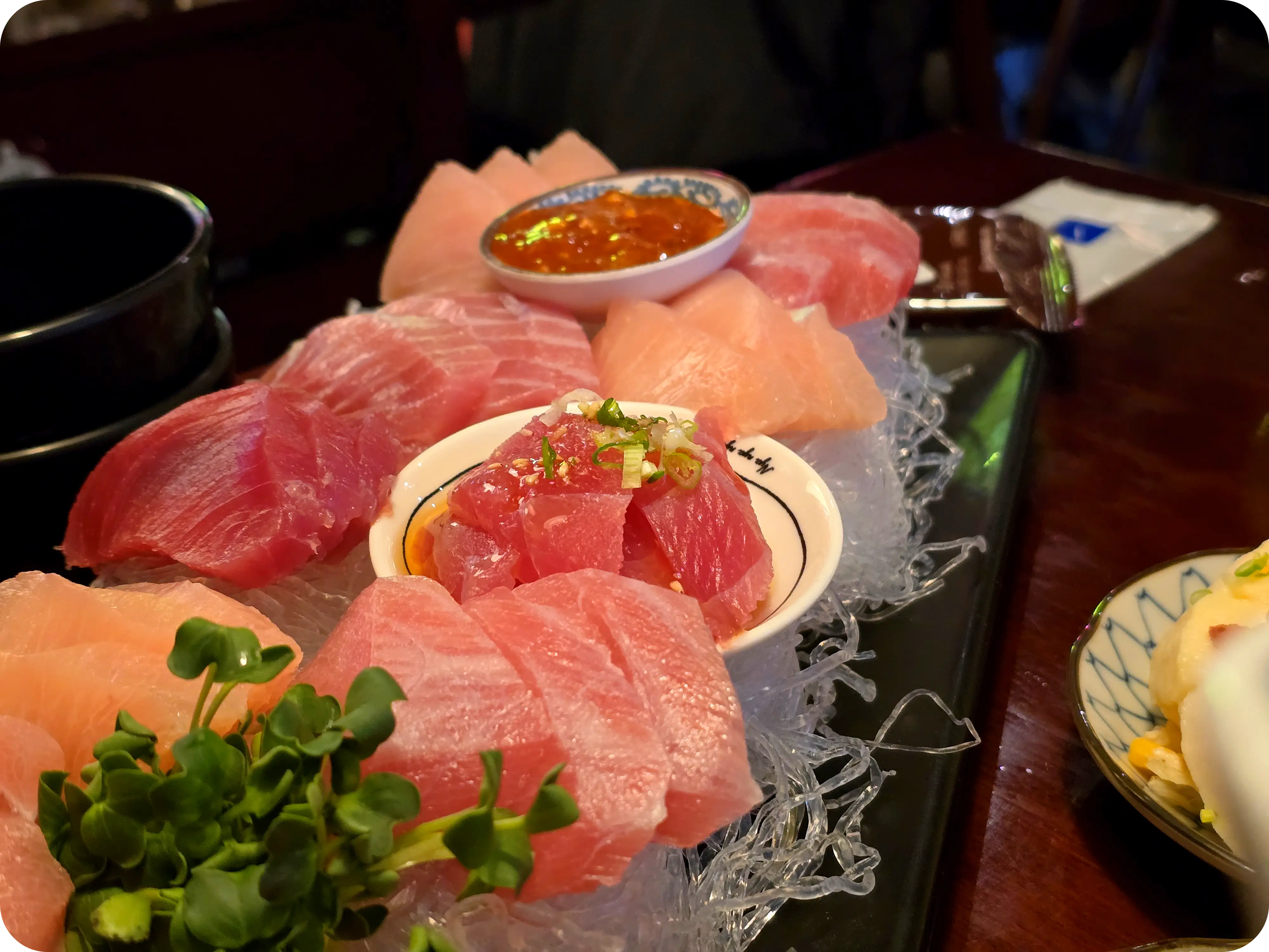 사이드를 구경하던 사이 두둥~! 참치 모둠회가 등장! 때깔부터 이쁜 참치회를 이자카야에서 가볍게 즐길 수 있는 게 너무 좋다.