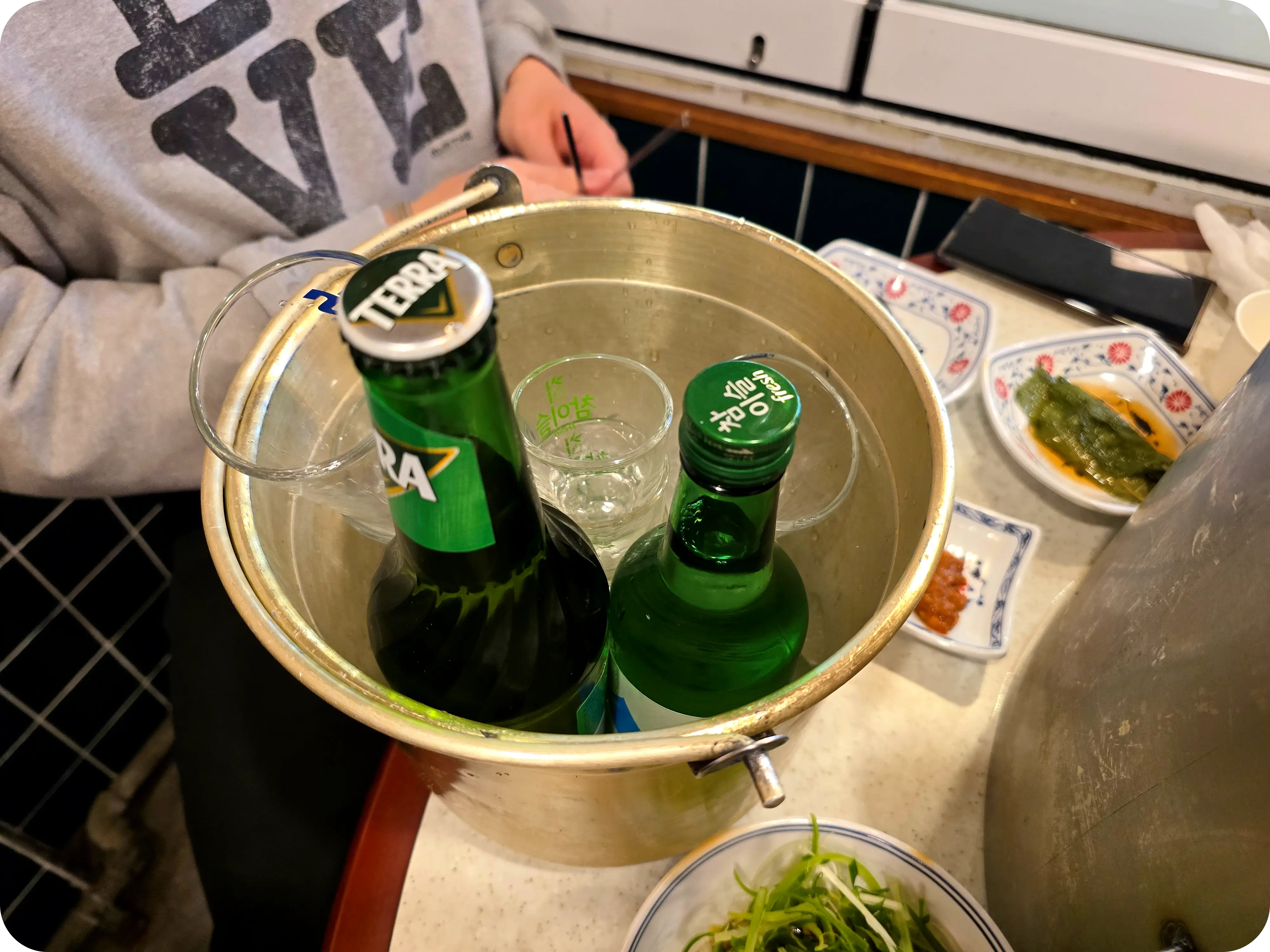주문한 소주와 맥주. 얼음이 들어간 바구니에 담아줘 시원하게 마사기 좋다. 추가 주문은 냉장고에서 꺼내면 된다. 직원들이 직접 고기를 구워주시기 때문에 상당히 바빠 보였다.