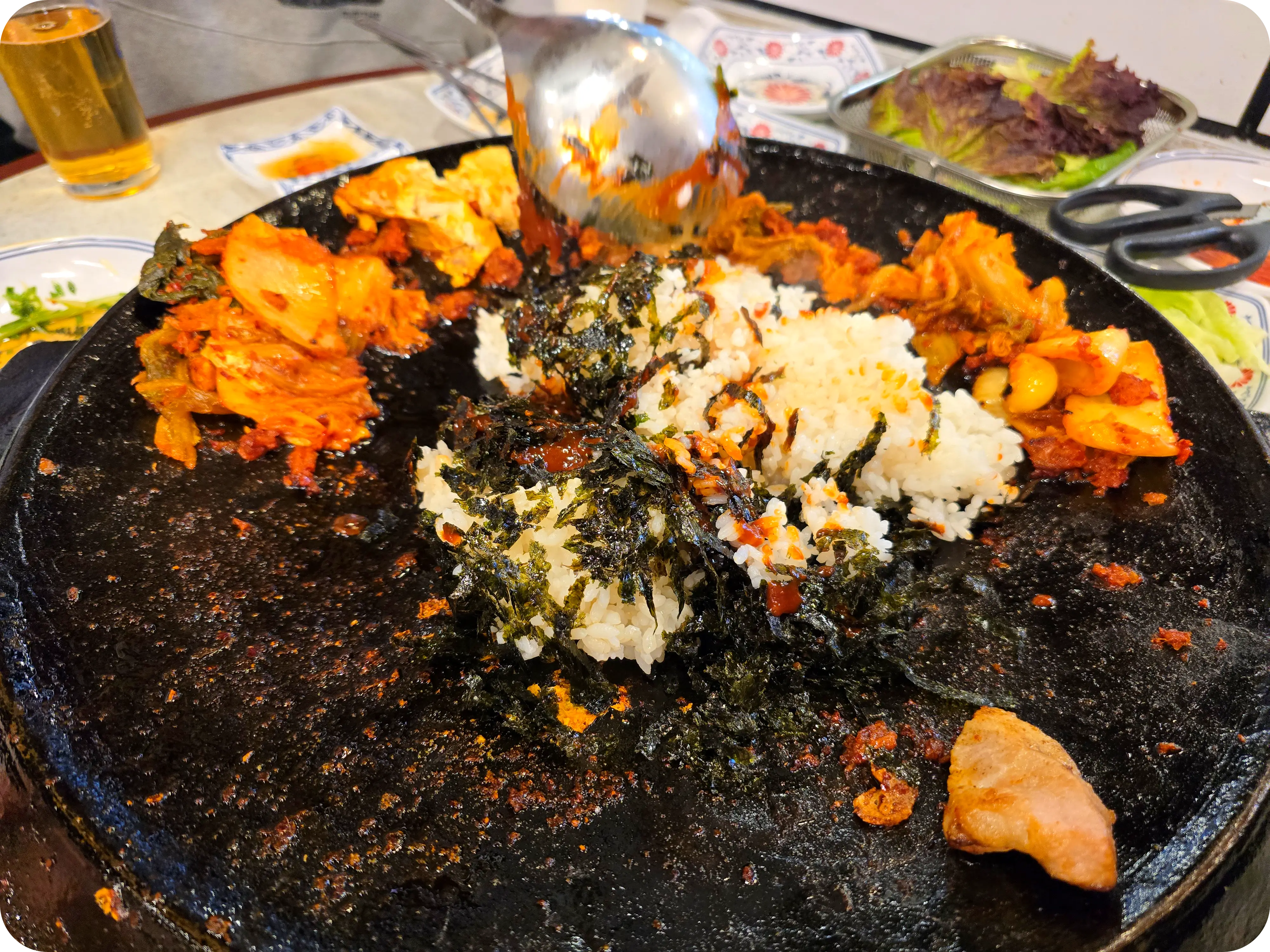 고기를 어느 정도 구운 다음에는 중앙에 모인 기름에 김치를 굽는데... 쓰읍 잠깐 침좀 닦고 가실게여~