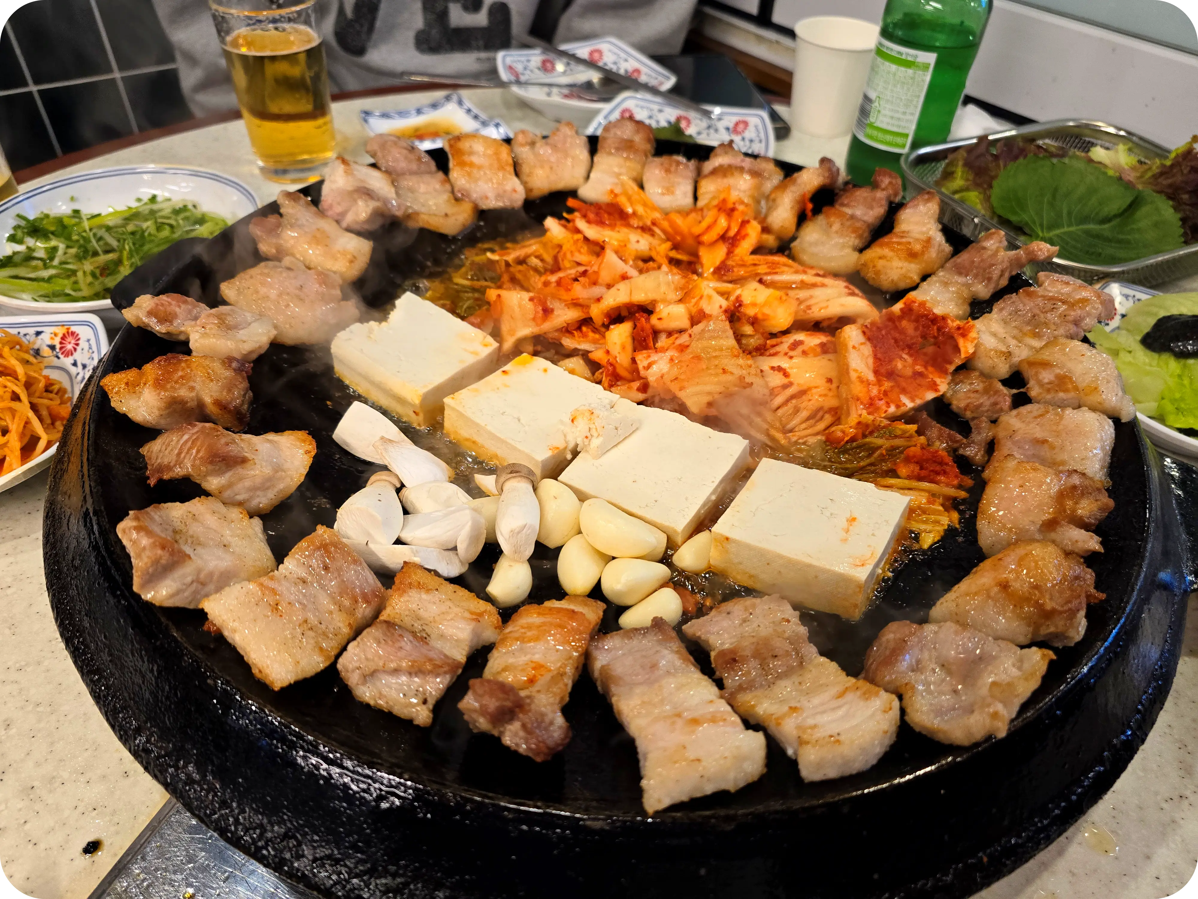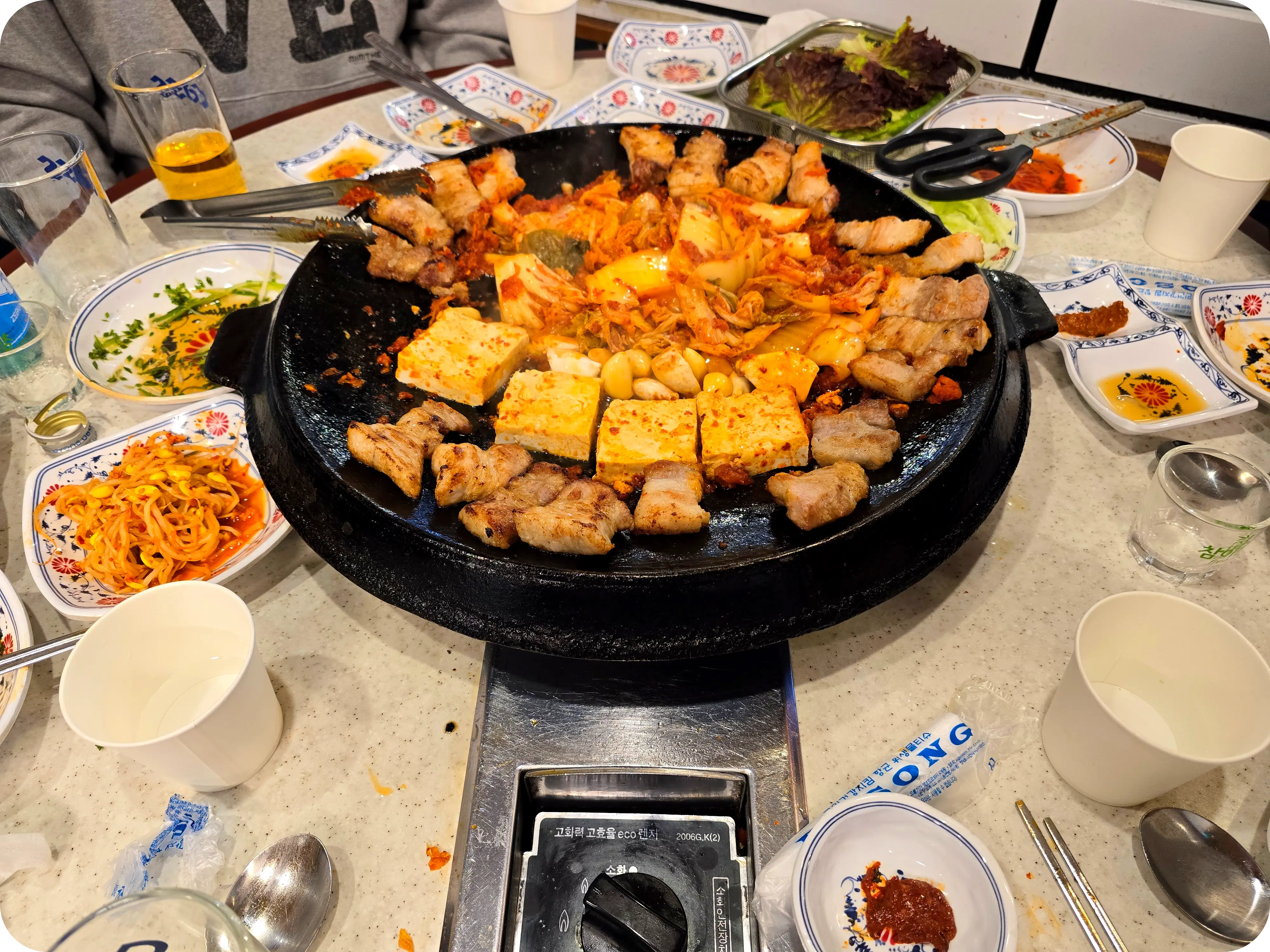 진짜 미친 거 아니냐구~ 두툼한 고기는 뭐이며 안에 김치랑 두부랑 버섯, 마늘까지 돼지기름에 굽는데 친구들 모두 반했고 상당히 만족스러운 표정들이다. ㅋㅋ