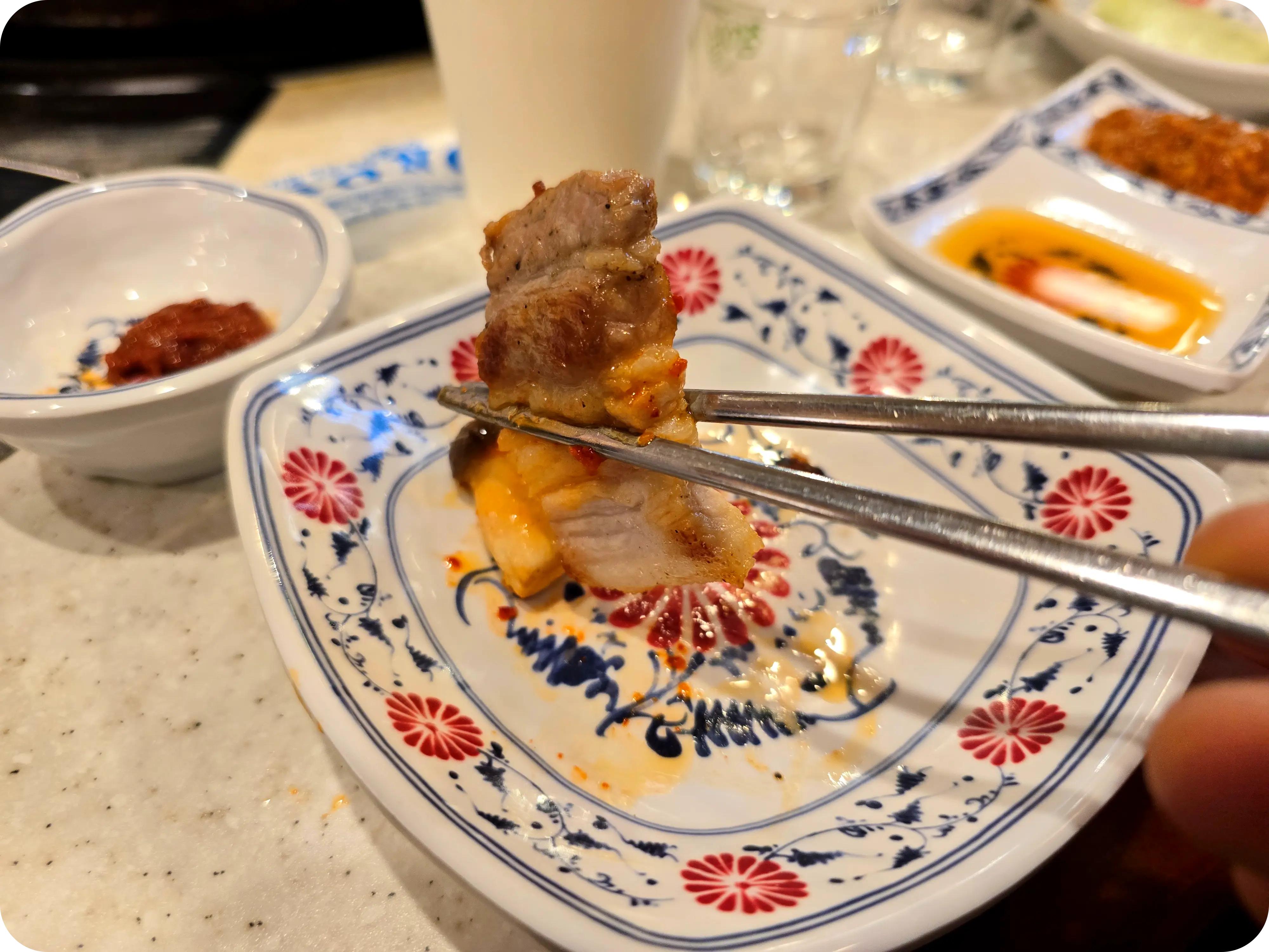 토막토막 썰려있는 600g의 삼겹살. 상당히 두툼하게 썰려있어 벌써부터 맛있어 보인다. 삼겹살은 처음에만 자리에서 구워주시며 추가 주문은 주방에서 구워 나온다.
