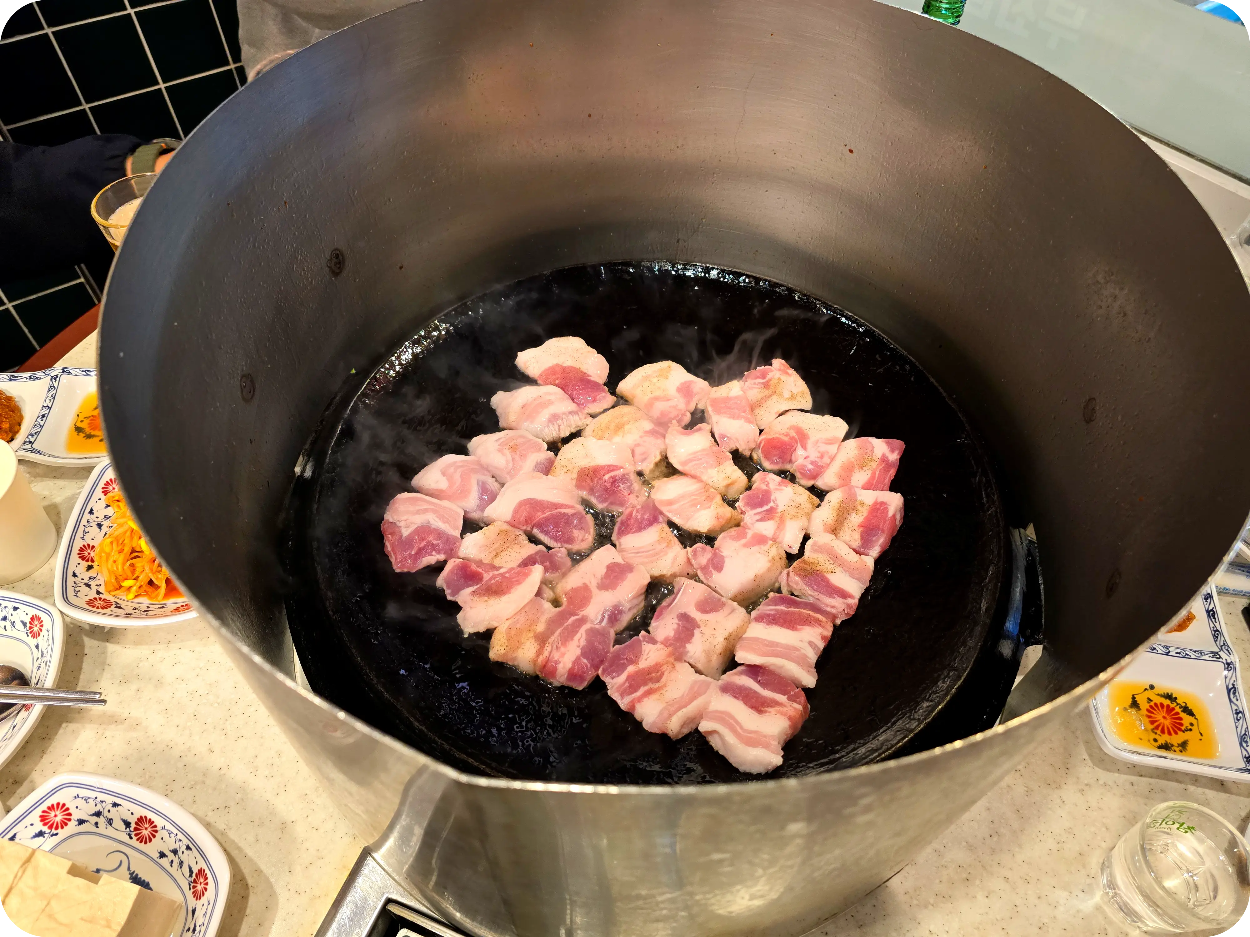 솥뚜껑에 삼겹살을 굽기 때문에 기름이 중앙으로 모이는데 뚜껑에 차단벽을 세워 구워주시기 때문에 기름이 튈 걱정은 하지 않아도 된다.