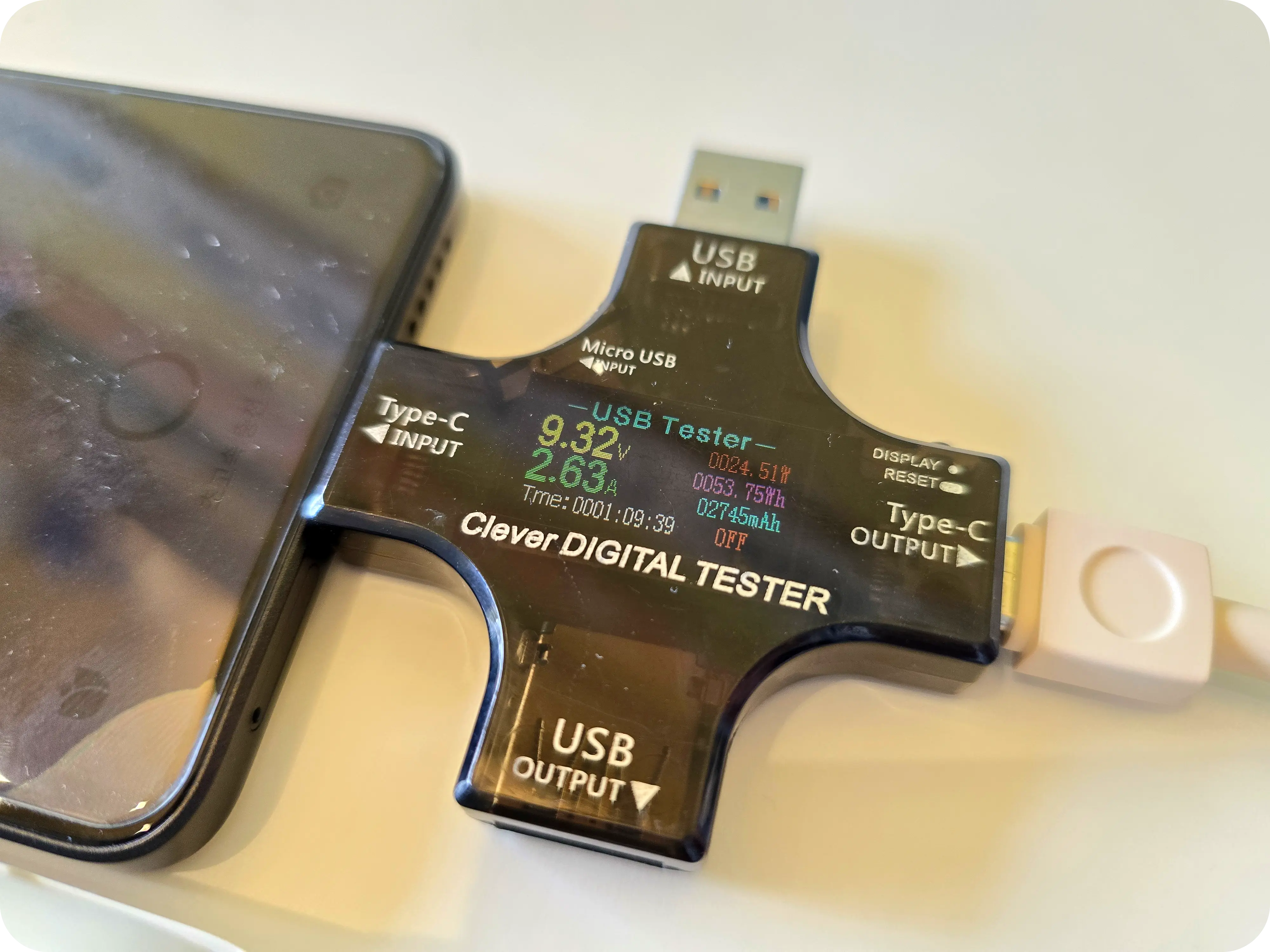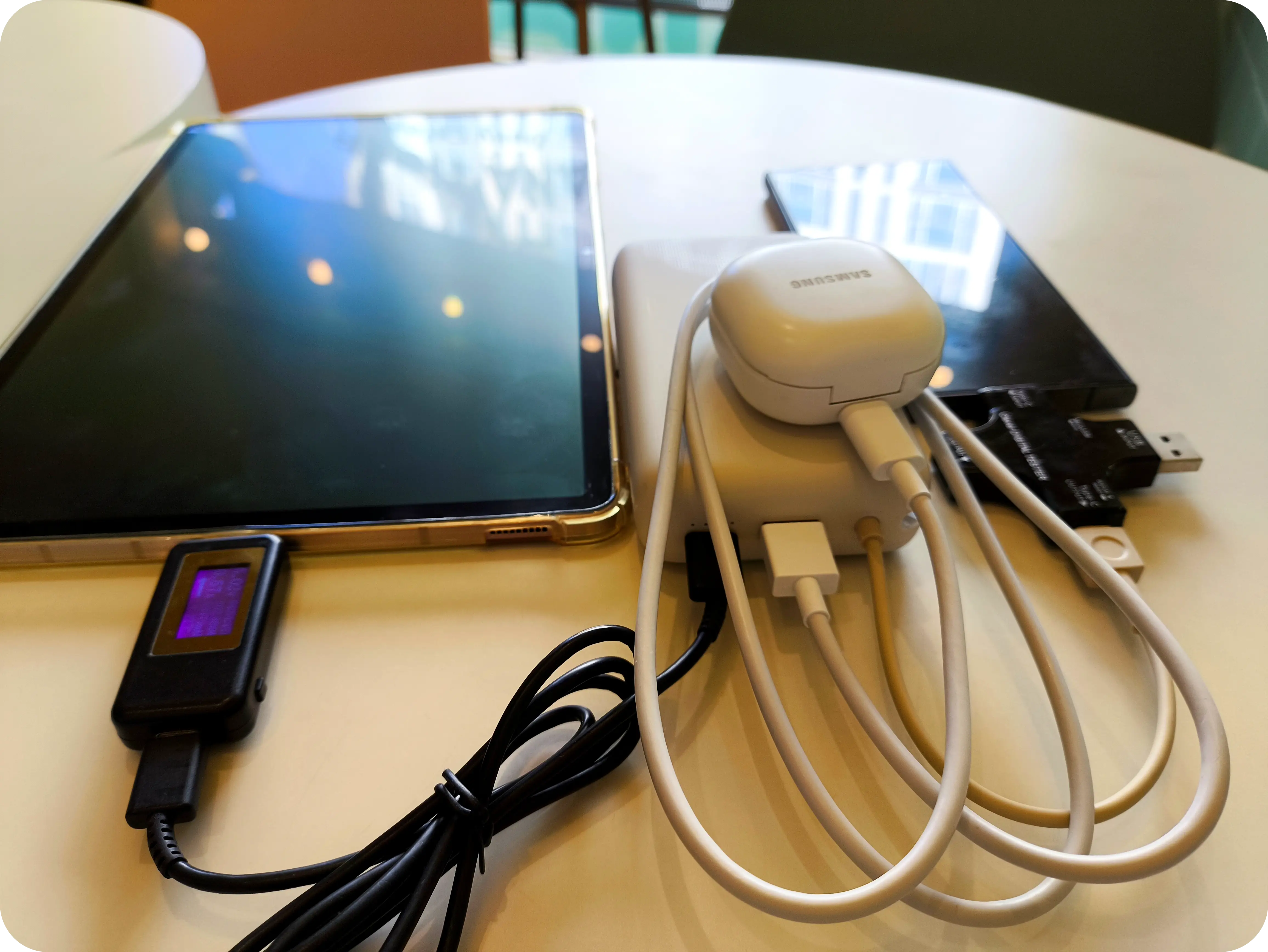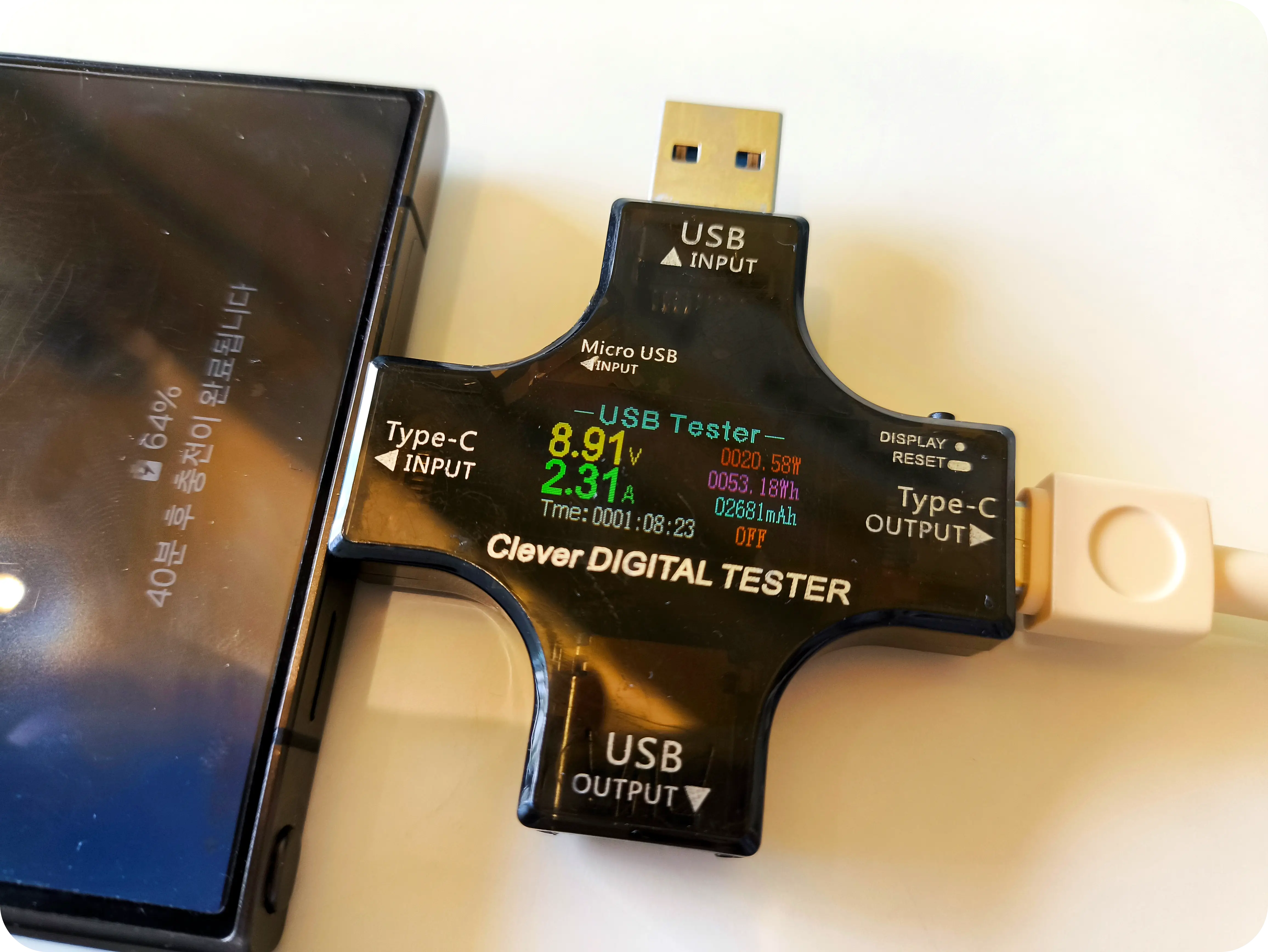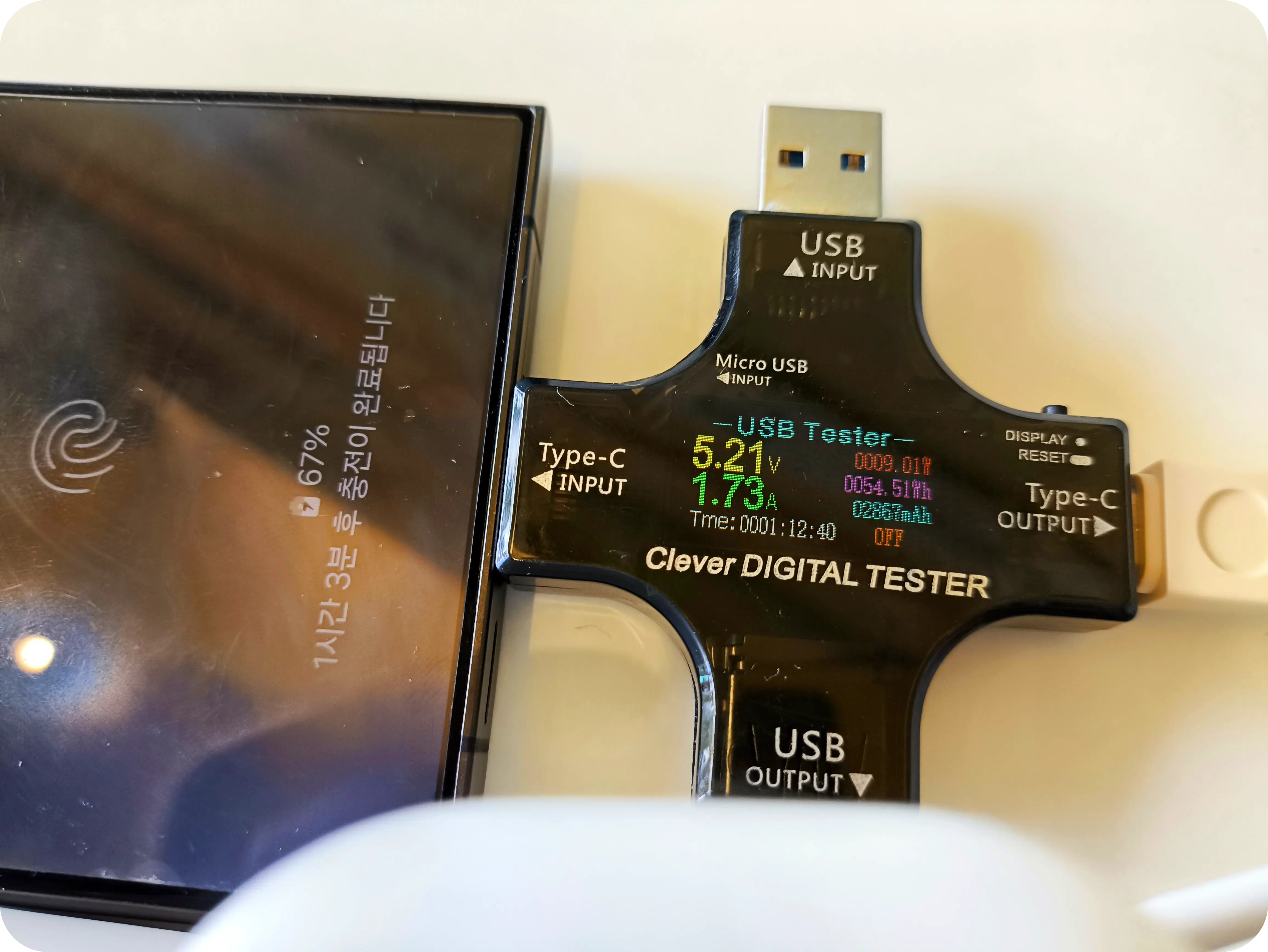 이렇게 3개의 기기를 동시에 충전할 경우에도 총 5V/3A 15W를 각각 나눠 분배하는 것이 확인되었다. 최대 3개의 기기를 동시에 충전할 수 있지만 15W를 나눠 쓰는 만큼 충전속도는 상당히 느리다. 최대 33W의 출력을 지원하는 기기인 것을 생각하면 아쉬운 부분이다.