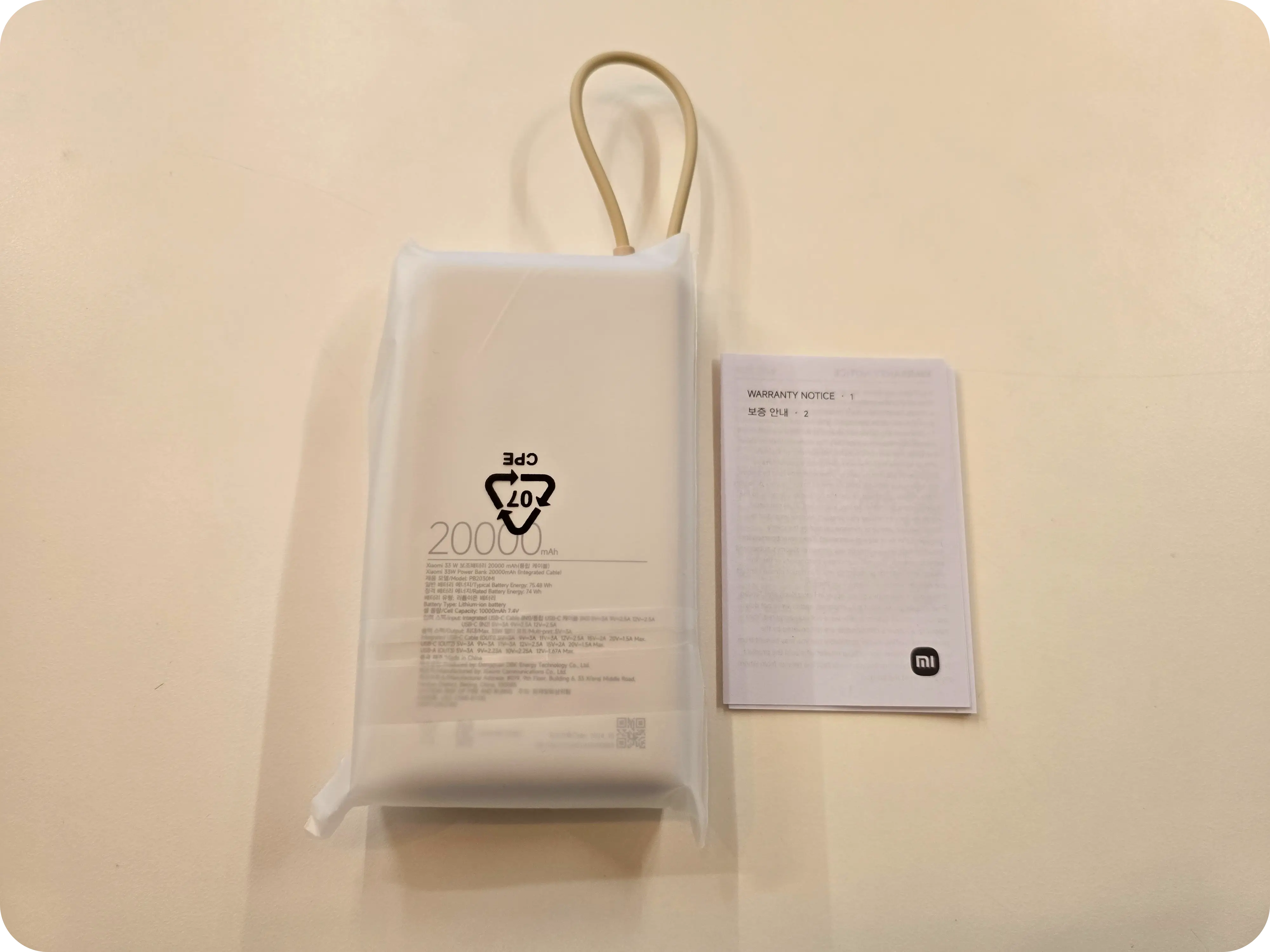 상자 안에는 깔끔하게 비닐로 한 번 더 포장이 되어있으며 설명서와 보증서가 들어있는 간단한 구성품이다. 보통 샤오미 보조배터리를 구매하면 케이블 하나를 껴넣어주는데 이번에는 케이블 일체형인 만큼 별도의 케이블은 들어있지 않았다.