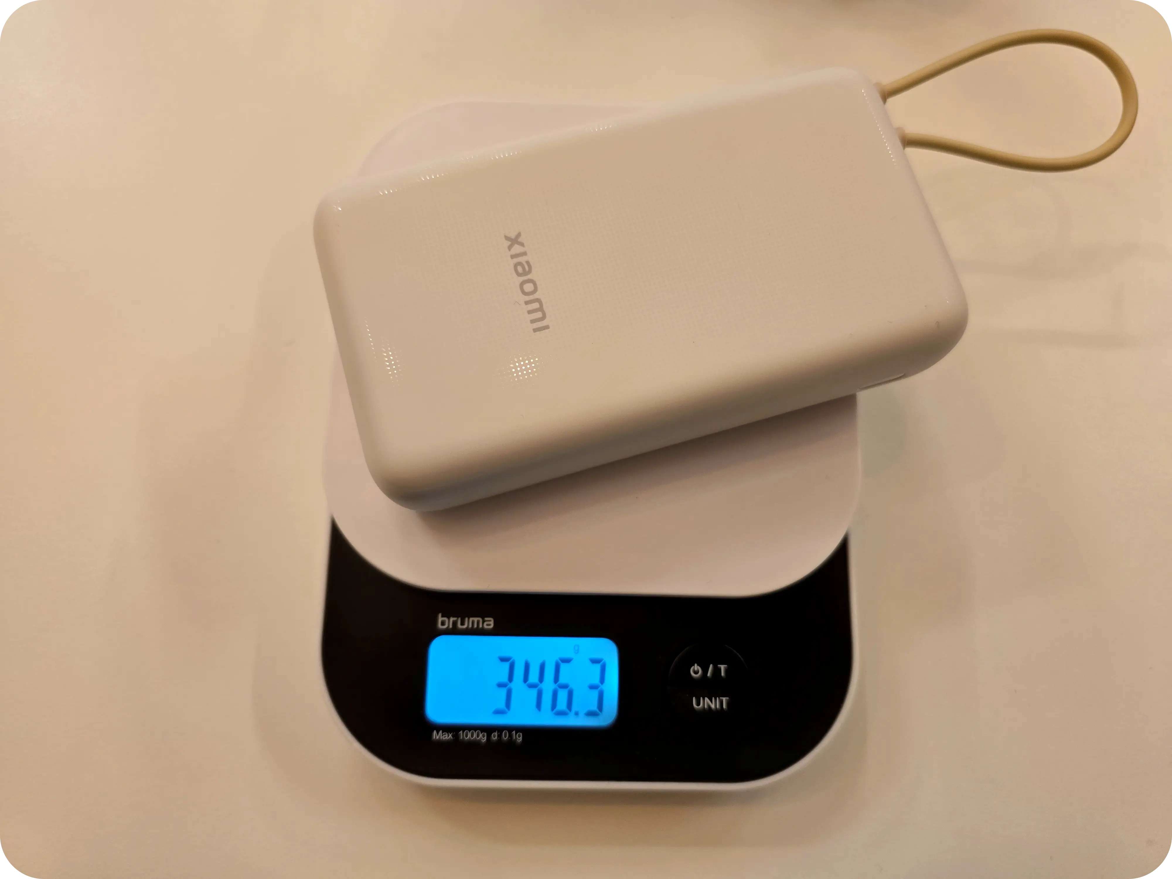 제품의 무게는 측정결과 346.3g으로 2만 용량치고는 가볍다고 할 수 있으나 손에 들고 다니기에는 무거운 편이다. 가방 안에 넣고 다니는 제품이라고 생각하면 작고 가볍지만 손에 들고 다니기에는 두껍고 무거운 보조배터리라고 생각하면 되겠다.