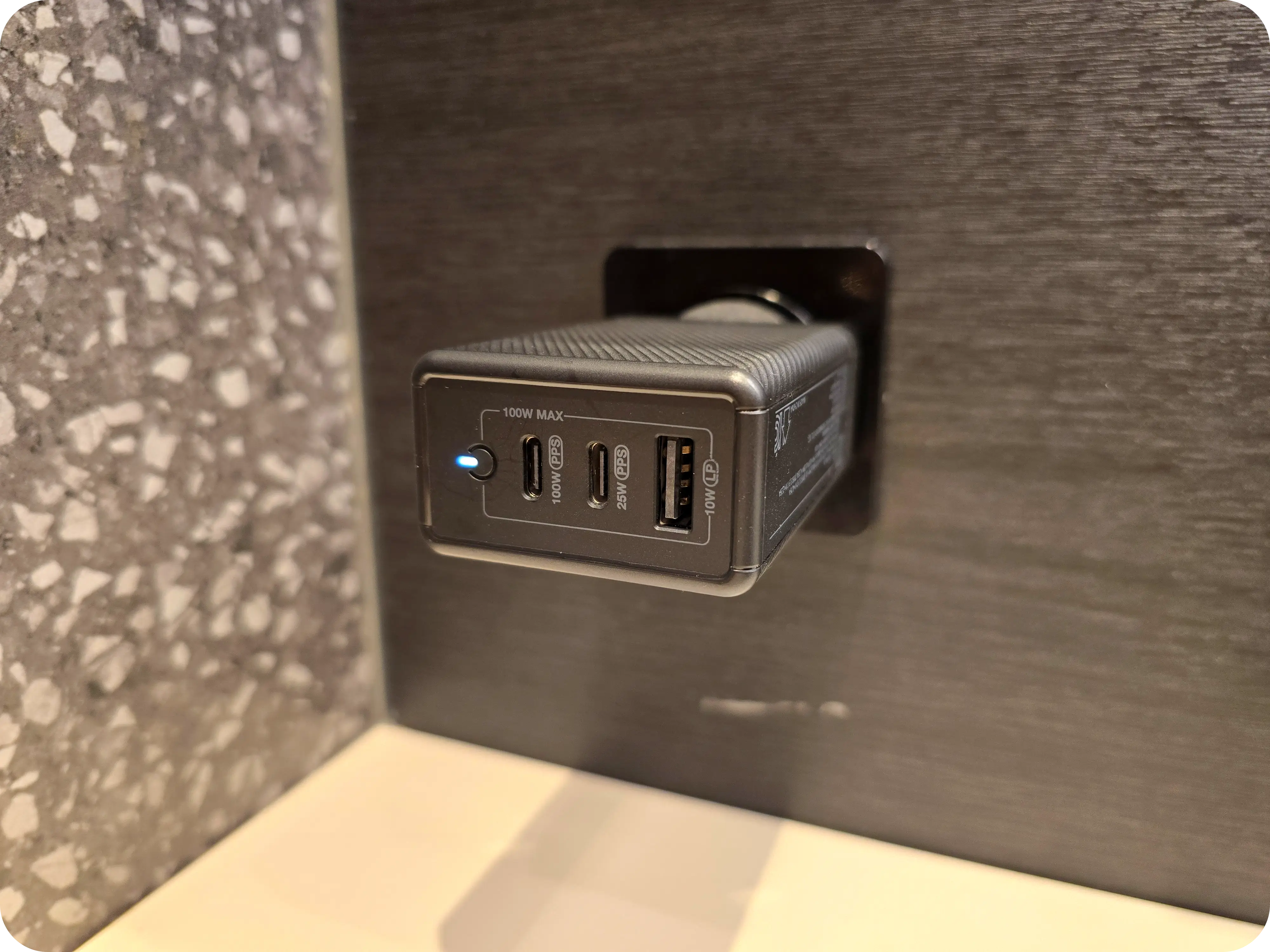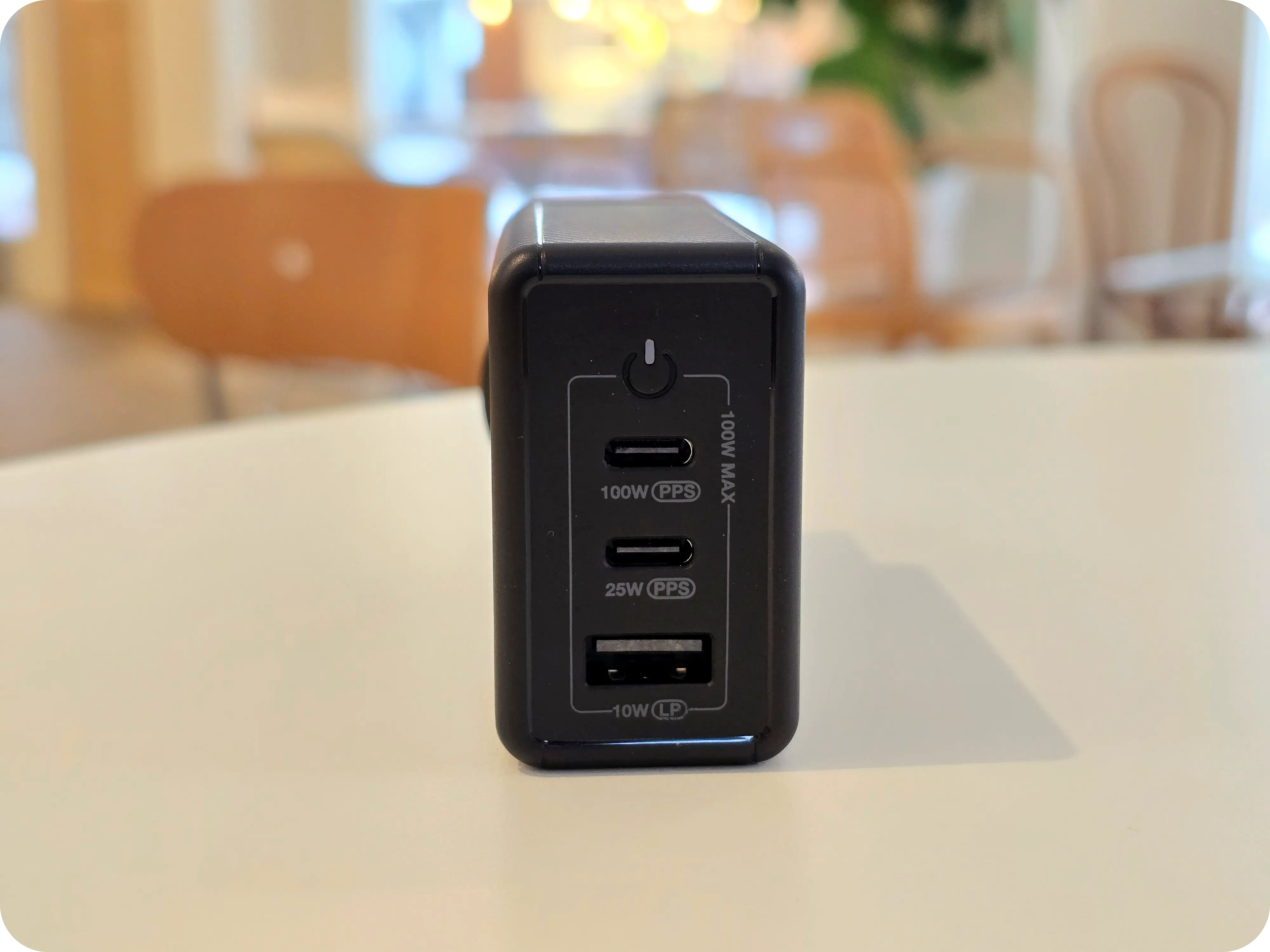 | 제품 무게 - 198g | 정격 출력 (MAX 100W) USB-C1) 5V/3A, 9V/3A, 12V/3A, 15V/3A, 20V/5A (PPS 3.3~21V/4.76A) (MAX 100W) USB-C2) 5V/3A, 9V/2.77A, 12V/2.08A, 15V/1.67A 20V/1.25A (PPS 3.3~11V/2.25A) (MAX 25W) USB-A) 5V/2A (MAX 10W) |